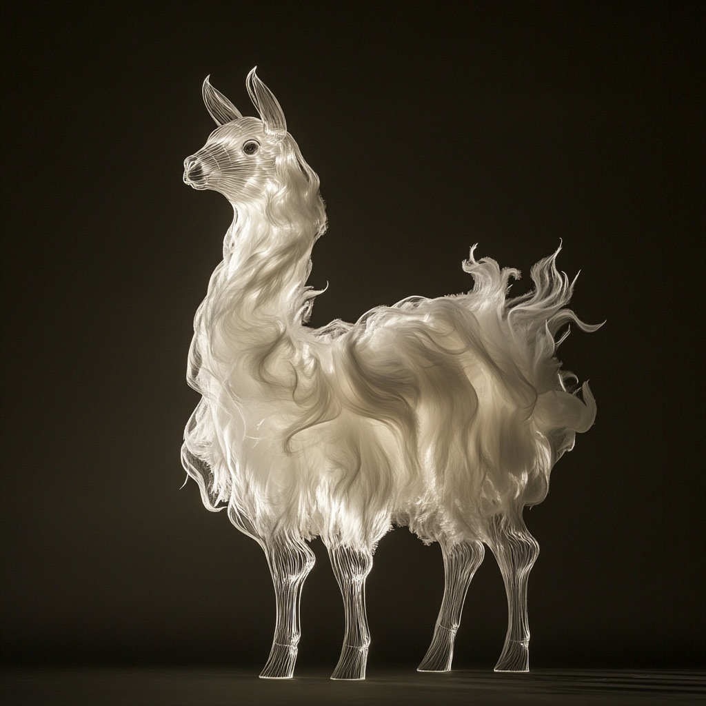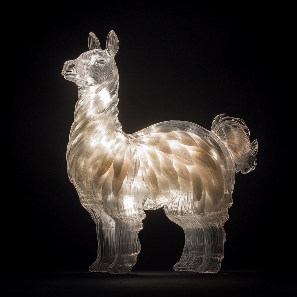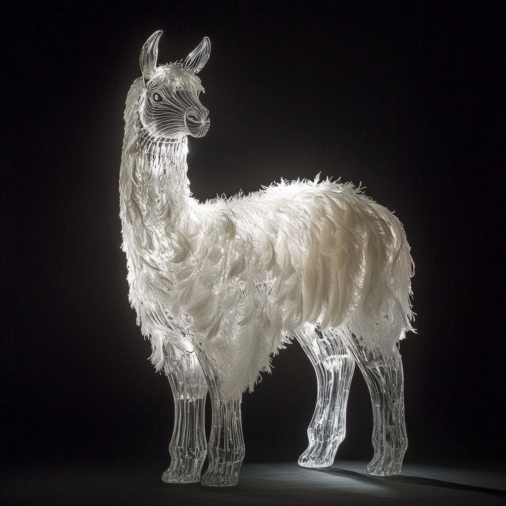 A full-body llama made of clear crystalline material with smooth curves. Inside, soft white and cream feathers are delicately layered. Soft ambient light reflects gently on the curved surfaces. The figure is placed against a simple dark background to highlight contrast and elegance.