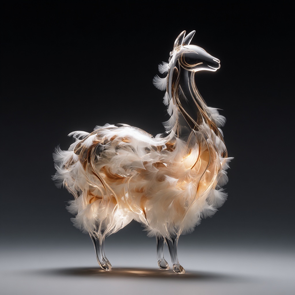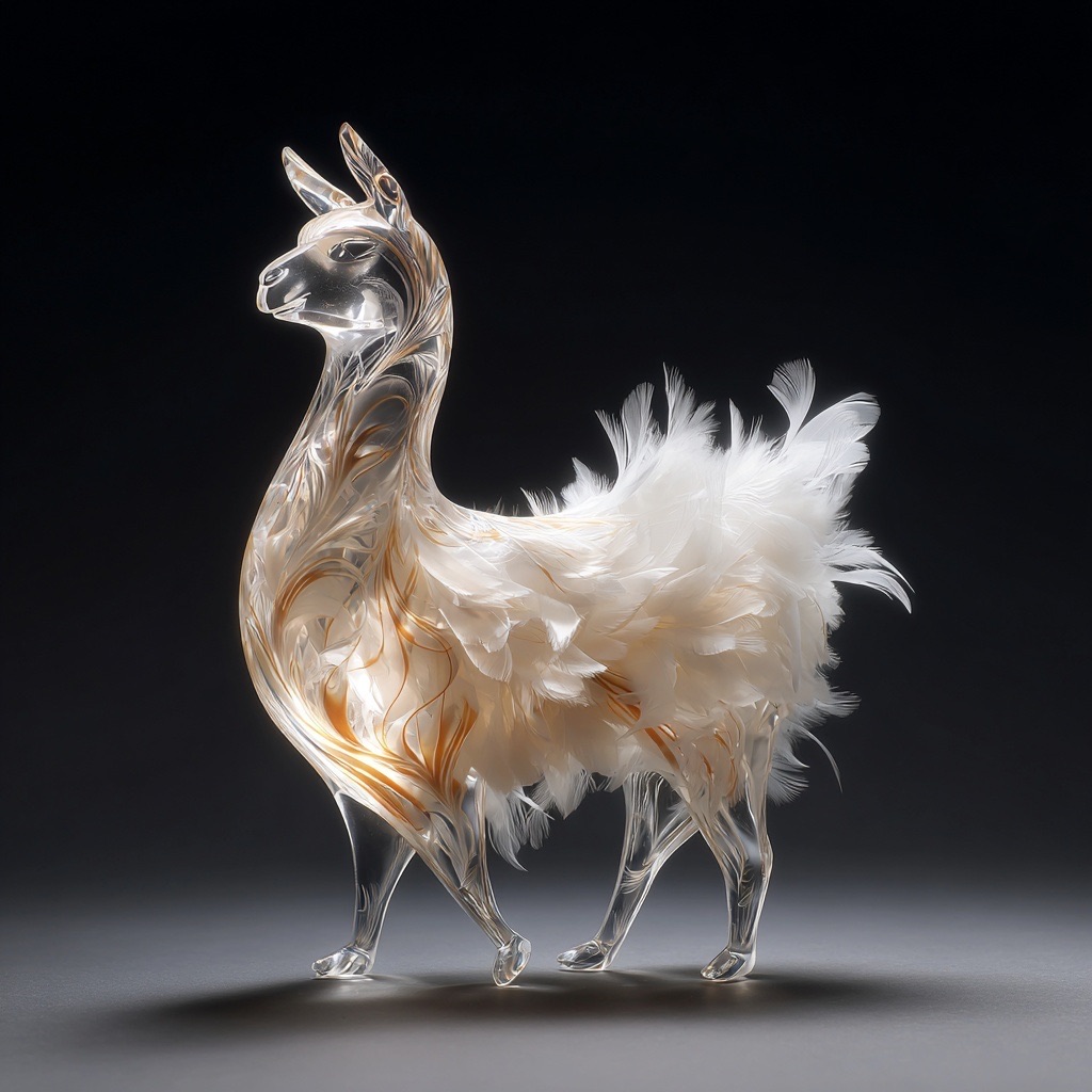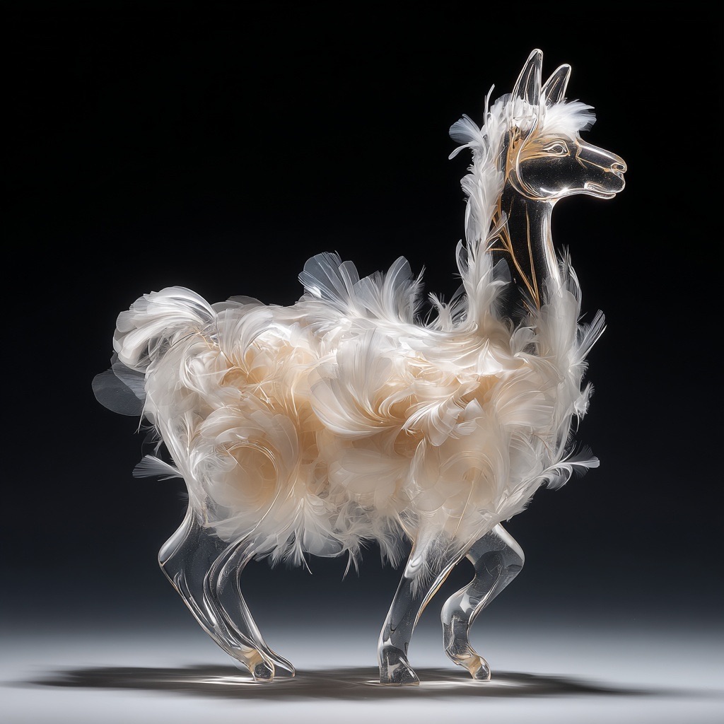 A full-body llama made of clear crystalline material with smooth curves. Inside, soft white and cream feathers are delicately layered. Soft ambient light reflects gently on the curved surfaces. The figure is placed against a simple dark background to highlight contrast and elegance.