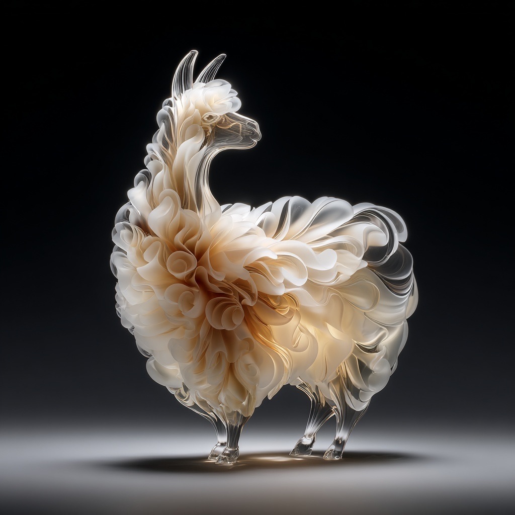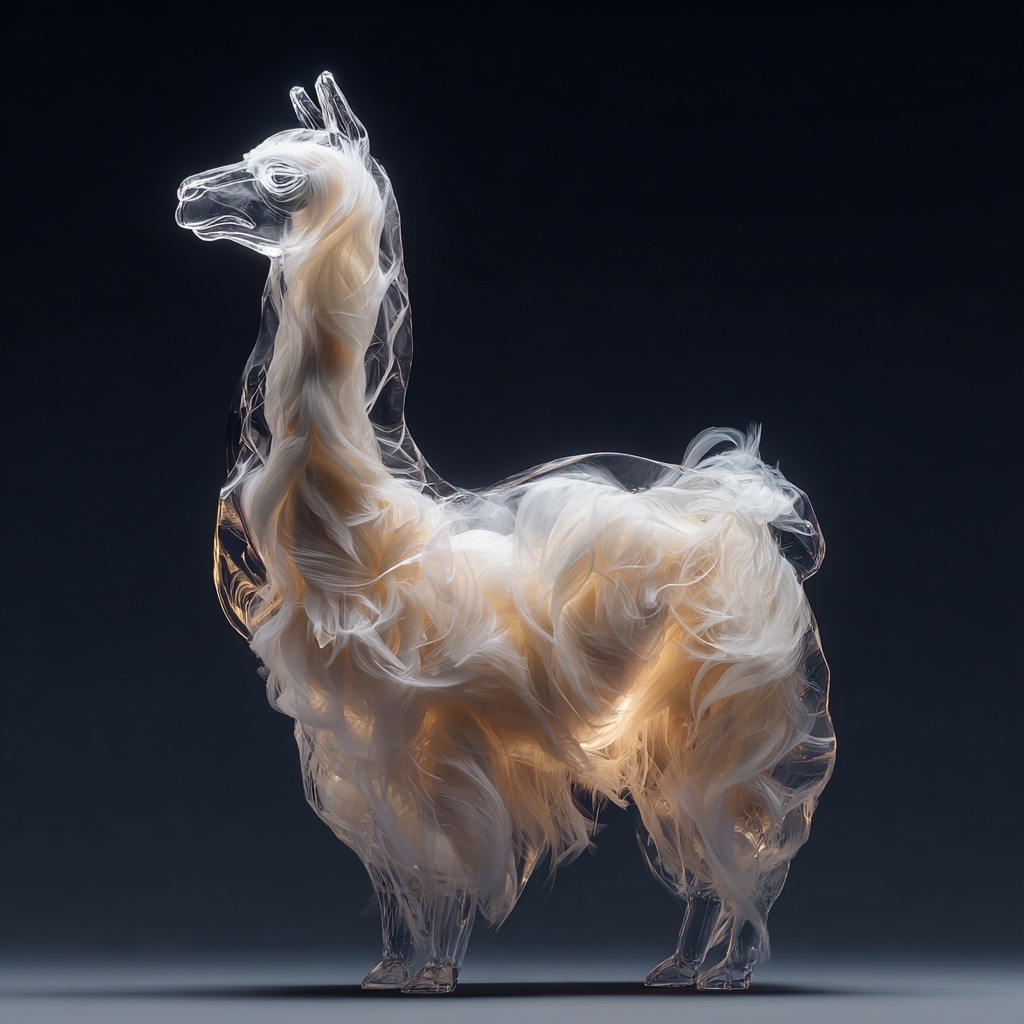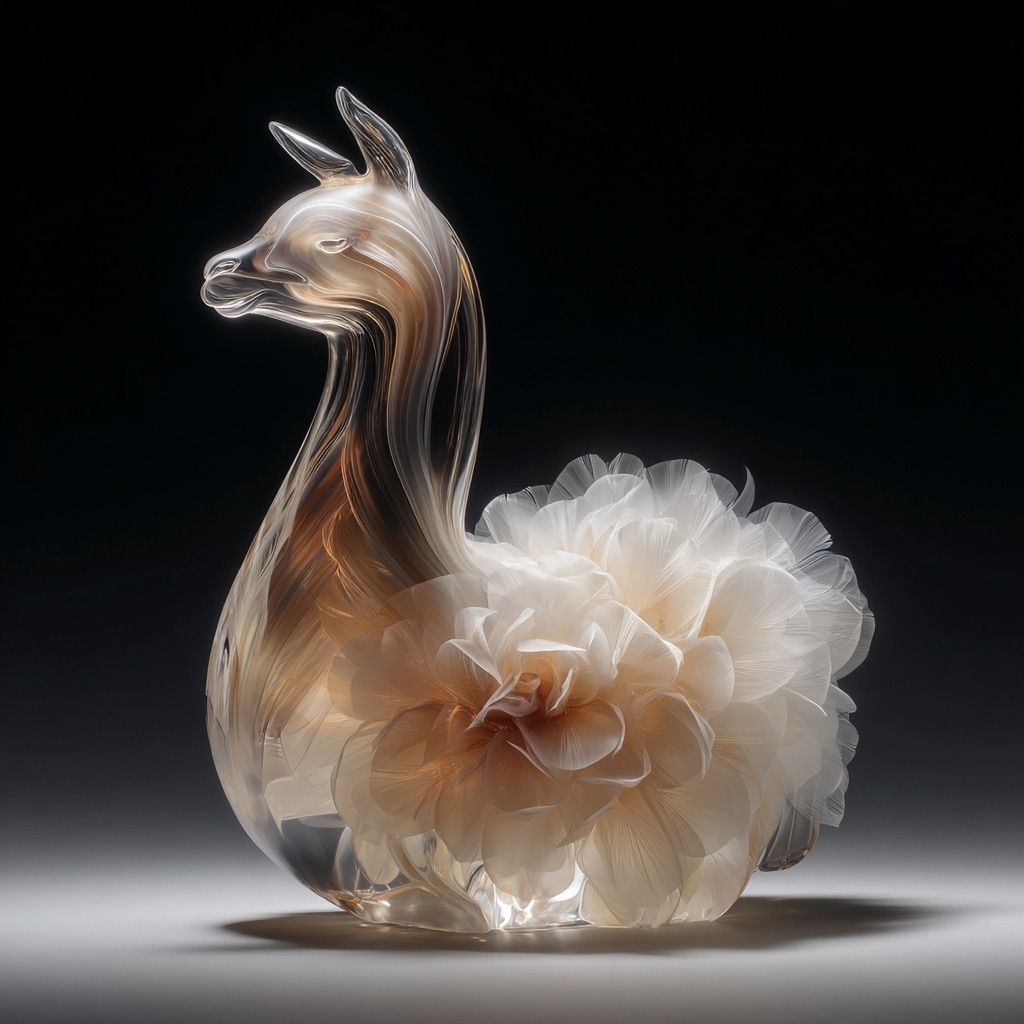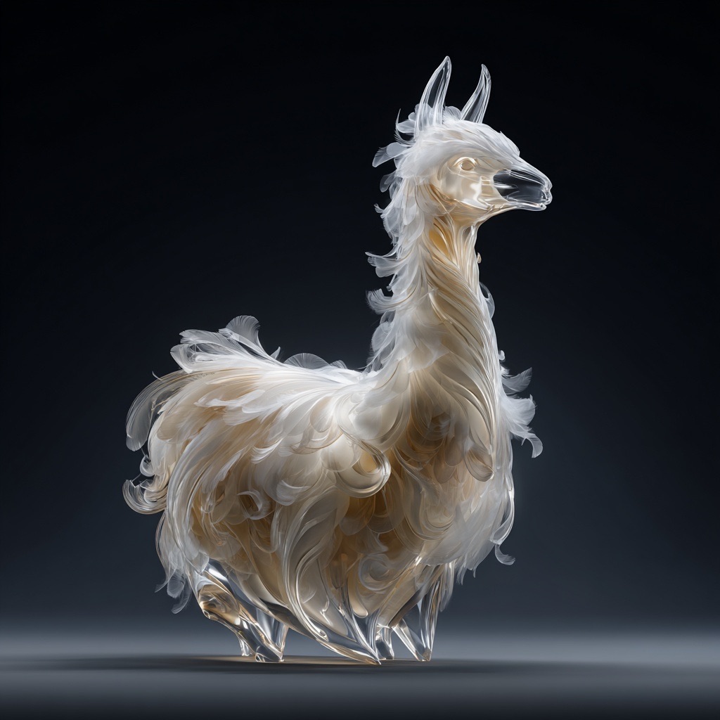 A full-body llama made of clear crystalline material with smooth curves. Inside, soft white and cream feathers are delicately layered. Soft ambient light reflects gently on the curved surfaces. The figure is placed against a simple dark background to highlight contrast and elegance.