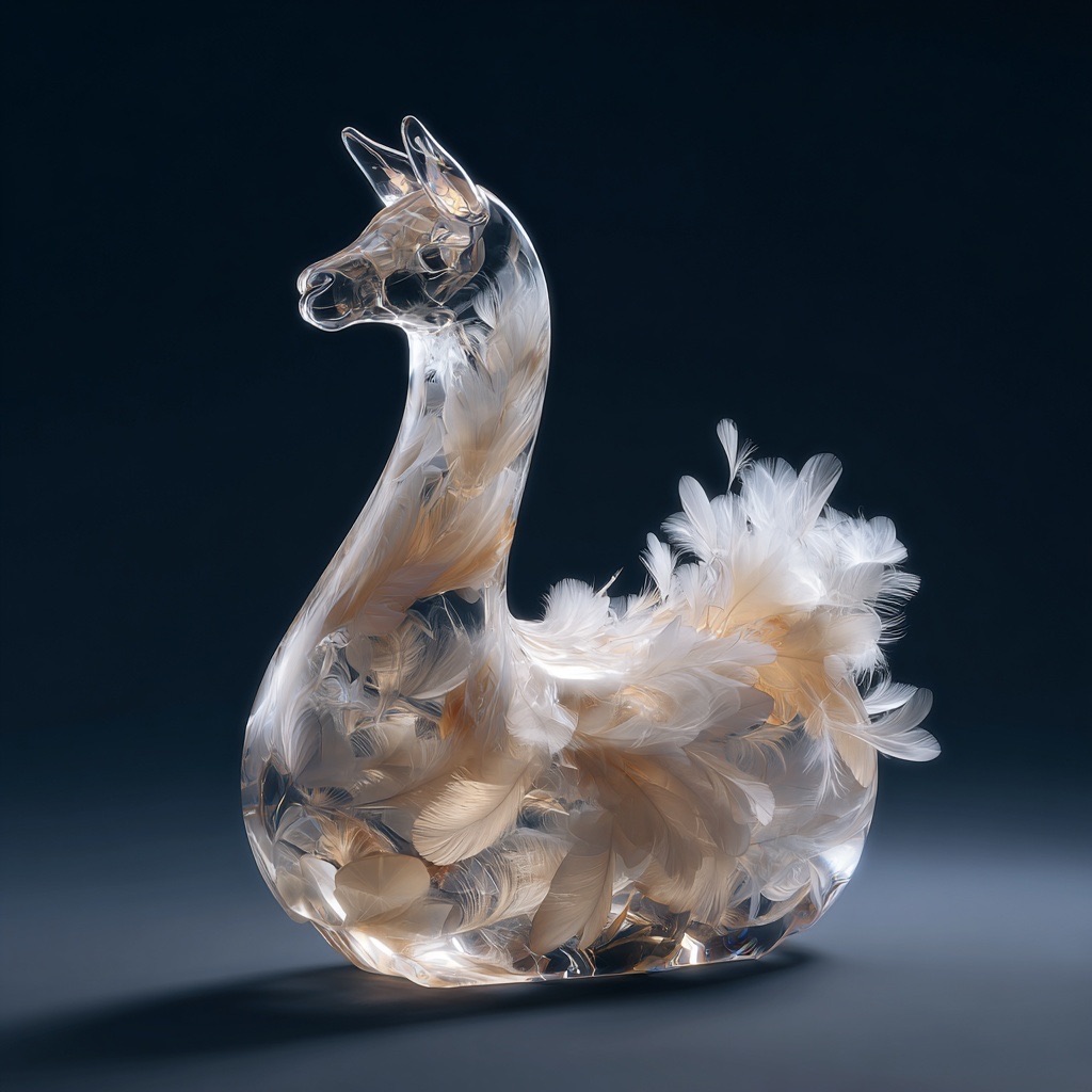 PROMPT: A full-body [SUBJECT] made of clear crystalline material with smooth curves. Inside, soft [COLOR1] and [COLOR2] feathers are delicately layered. Soft ambient light reflects gently on the curved surfaces. The figure is placed against a simple dark background to highlight contrast and elegance.