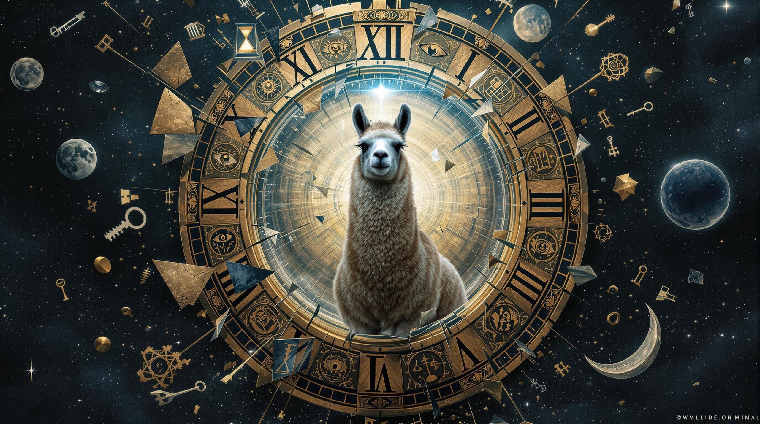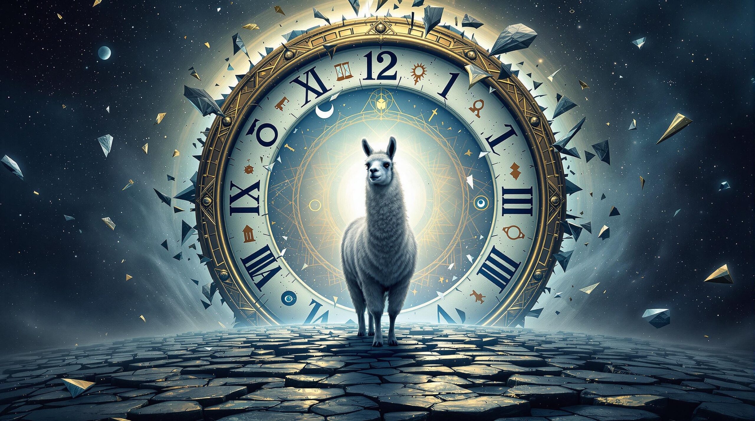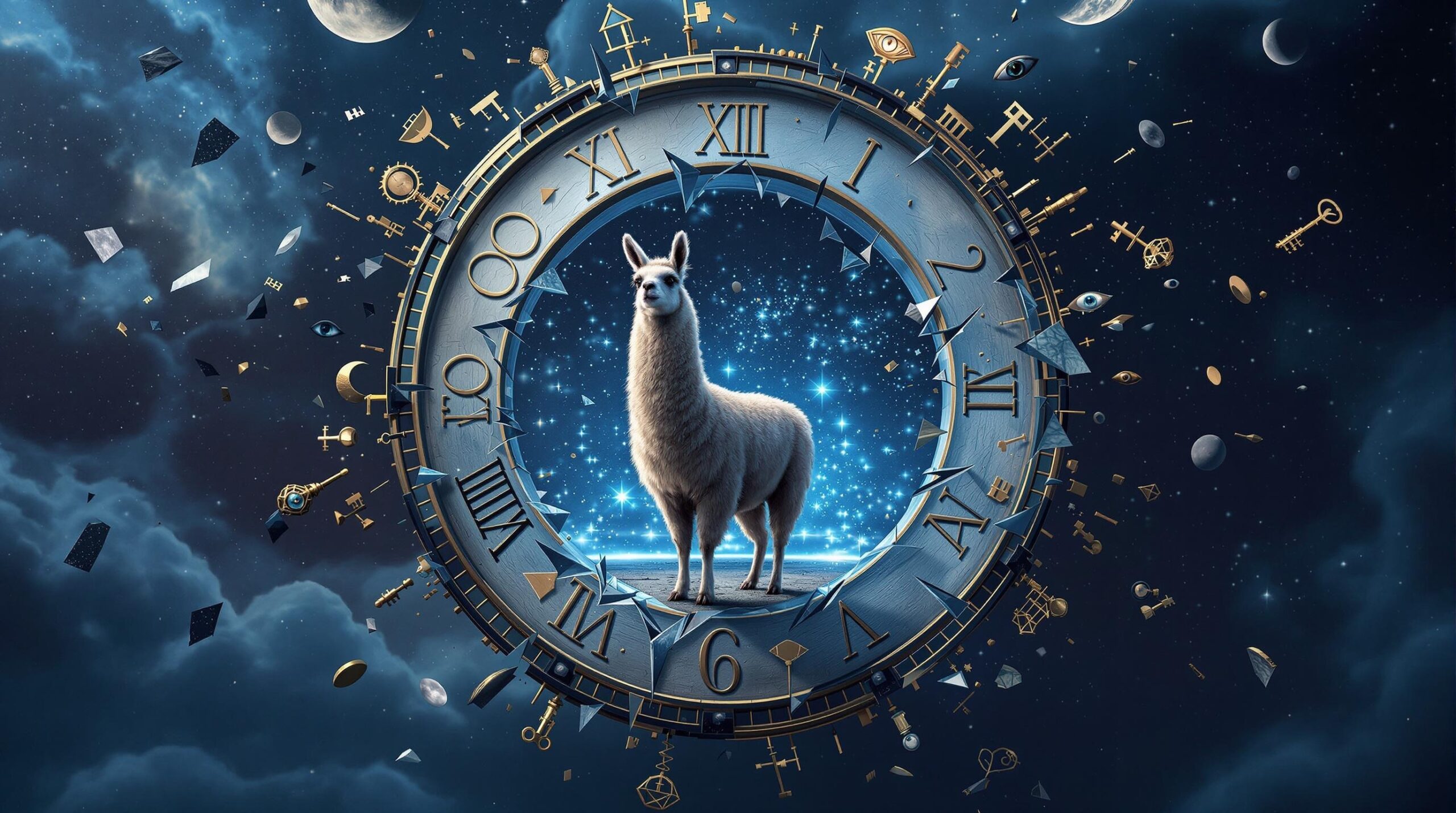A llama stands at the center of a broken clock floating in an endless void. Instead of numbers, the clock face has symbols moons, hourglasses, eyes, and keys. Time is shattering outward in shards, forming a portal behind them. Use a palette of deep indigos, bronze gold, and eerie silver tones
