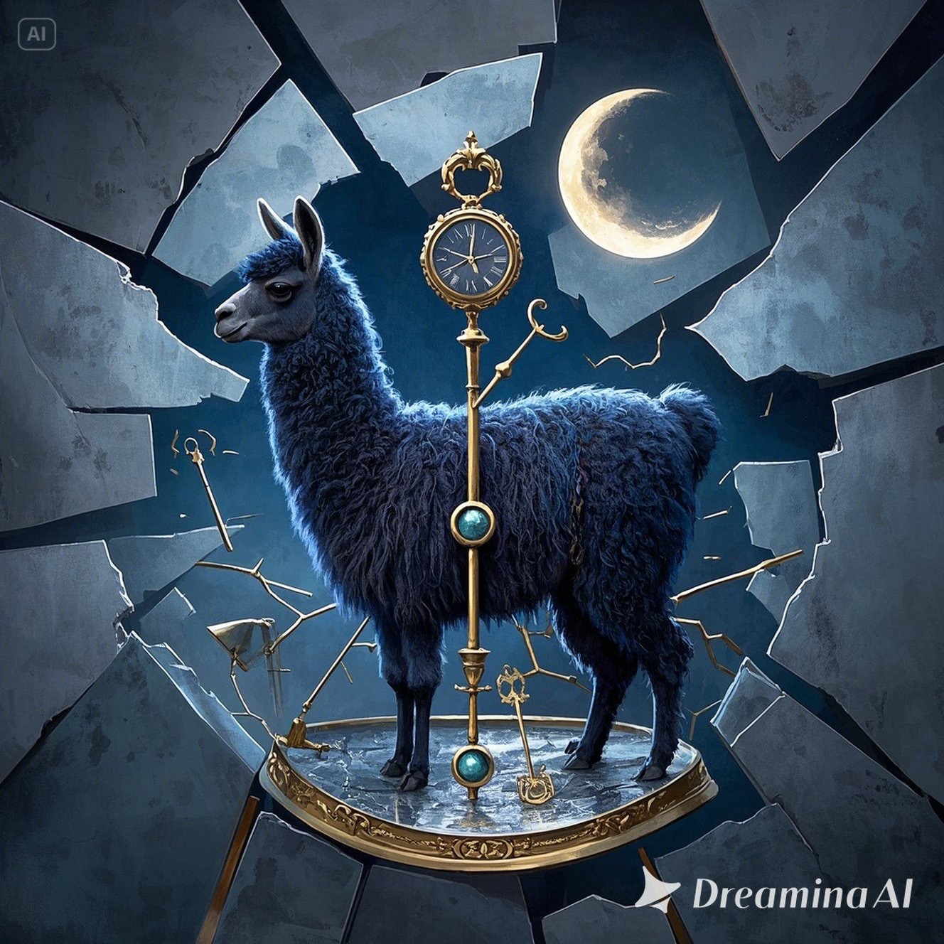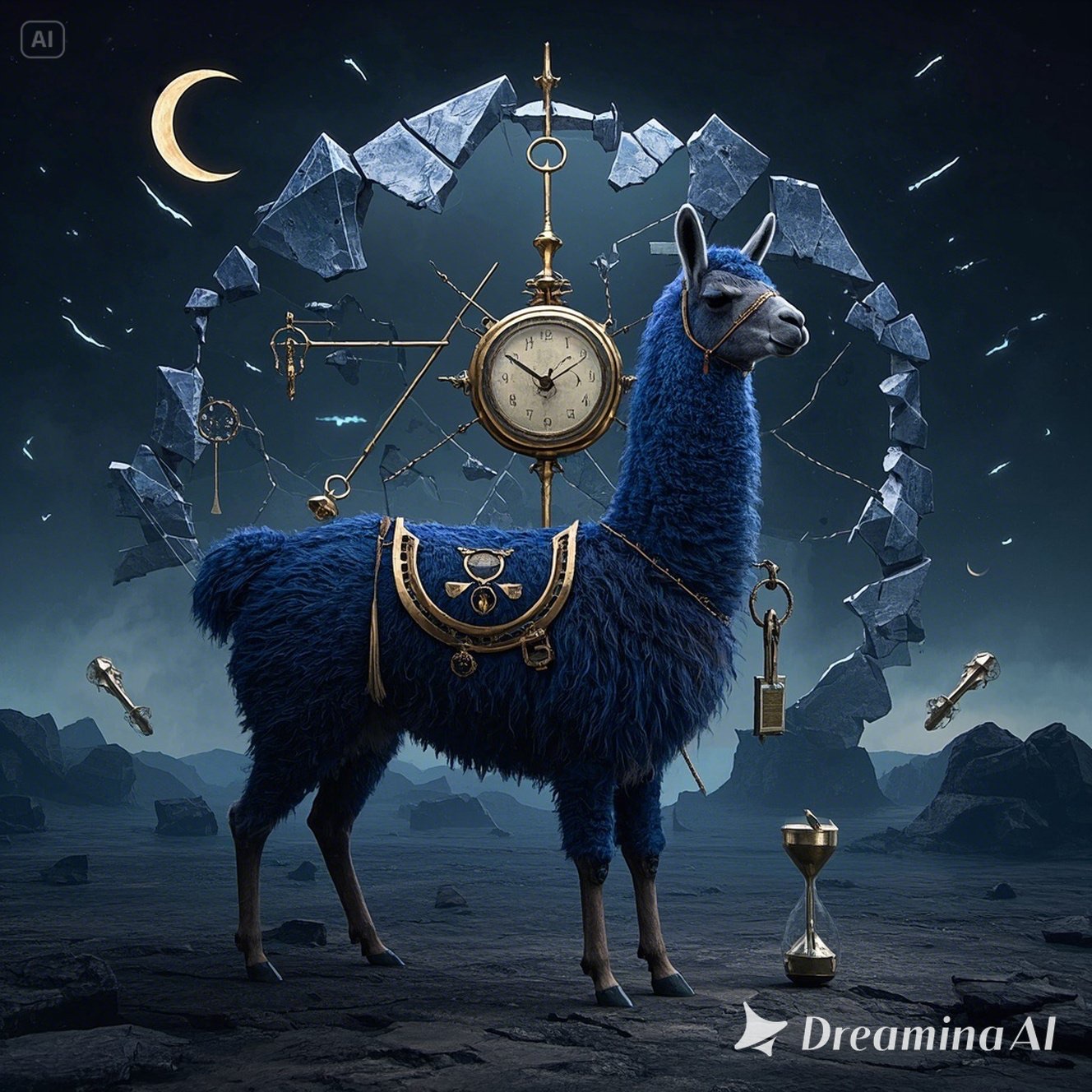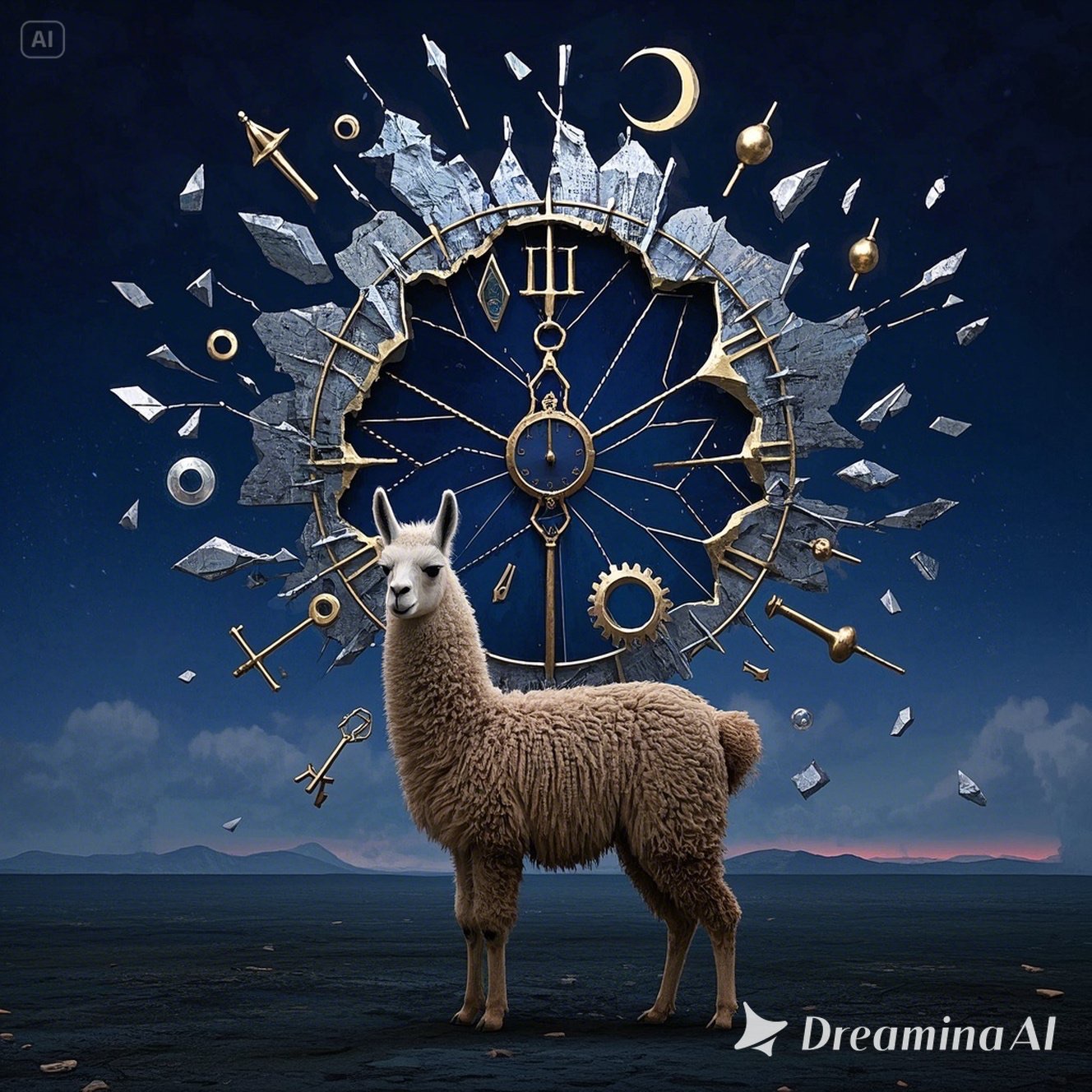 A llama stands at the center of a broken clock floating in an endless void. Instead of numbers, the clock face has symbols moons, hourglasses, eyes, and keys. Time is shattering outward in shards, forming a portal behind them. Use a palette of deep indigos, bronze gold, and eerie silver tones