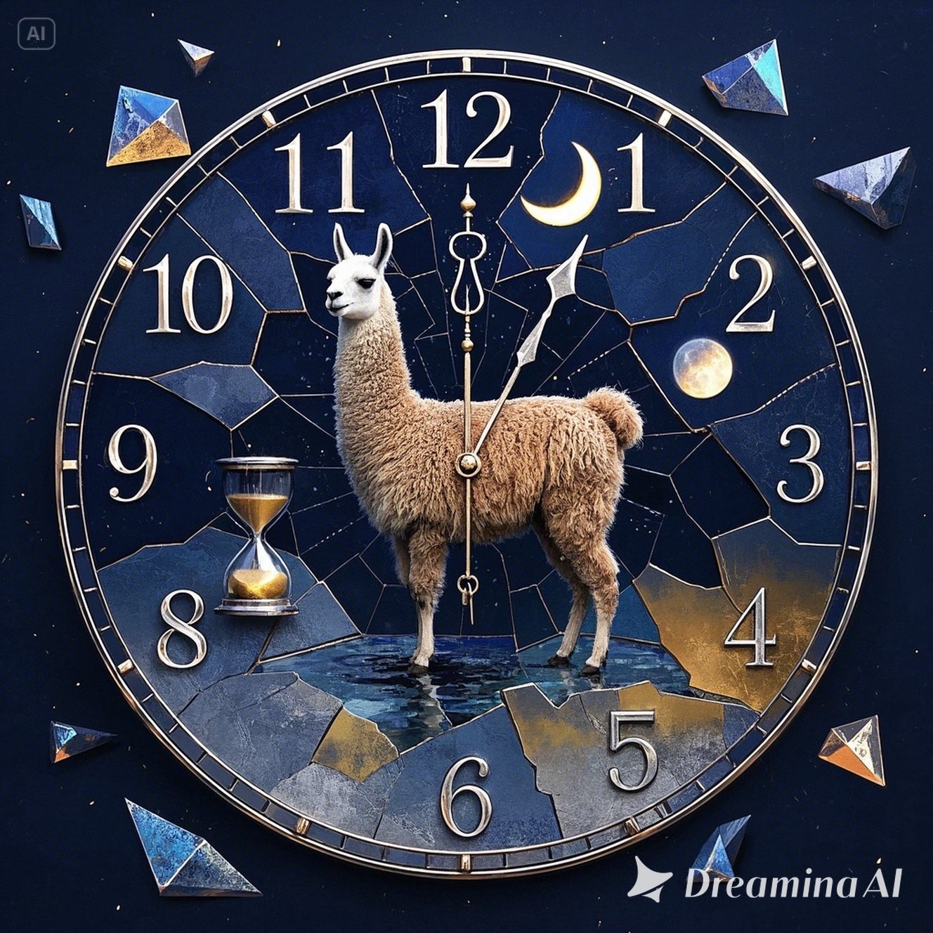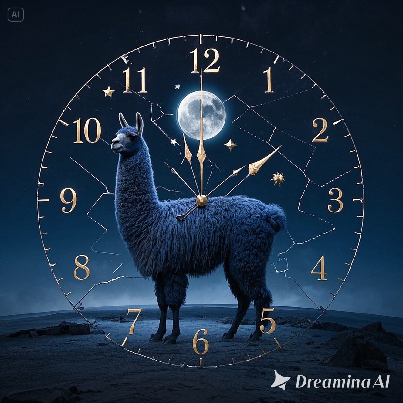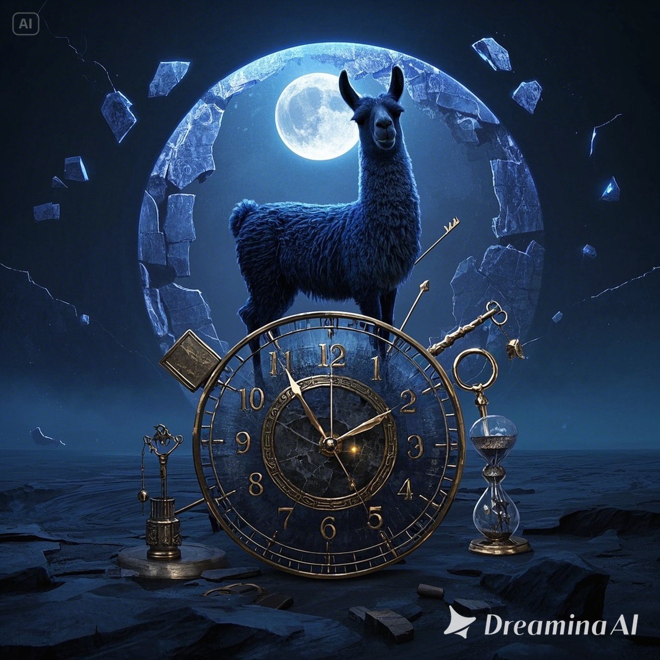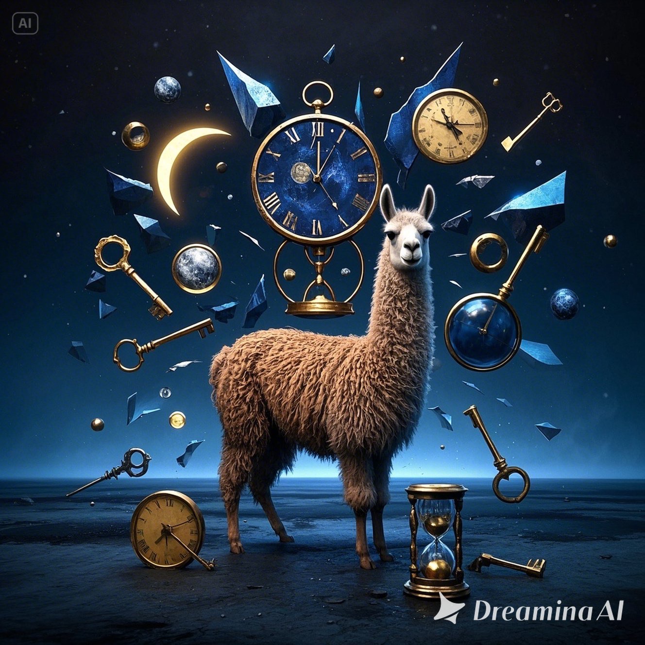 A llama stands at the center of a broken clock floating in an endless void. Instead of numbers, the clock face has symbols moons, hourglasses, eyes, and keys. Time is shattering outward in shards, forming a portal behind them. Use a palette of deep indigos, bronze gold, and eerie silver tones