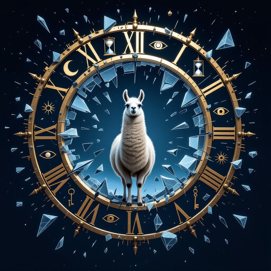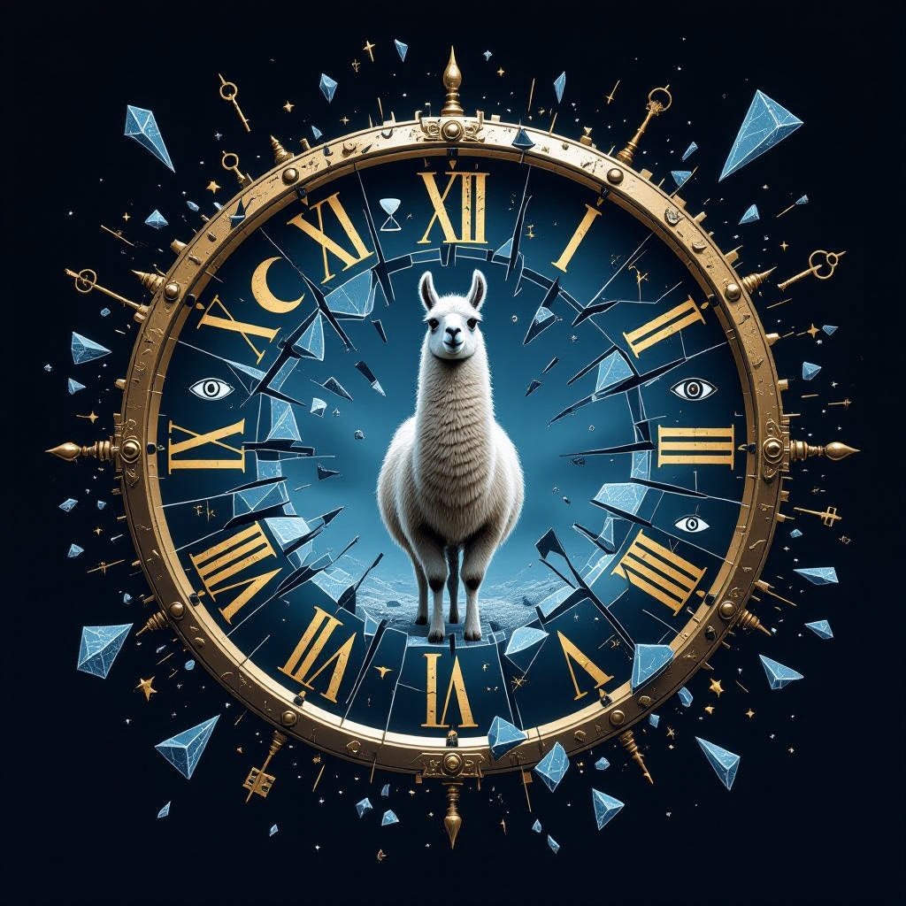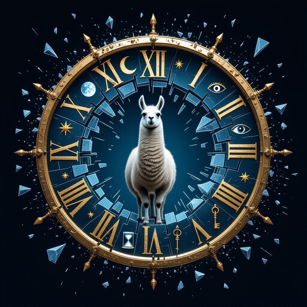 A llama stands at the center of a broken clock floating in an endless void. Instead of numbers, the clock face has symbols moons, hourglasses, eyes, and keys. Time is shattering outward in shards, forming a portal behind them. Use a palette of deep indigos, bronze gold, and eerie silver tones