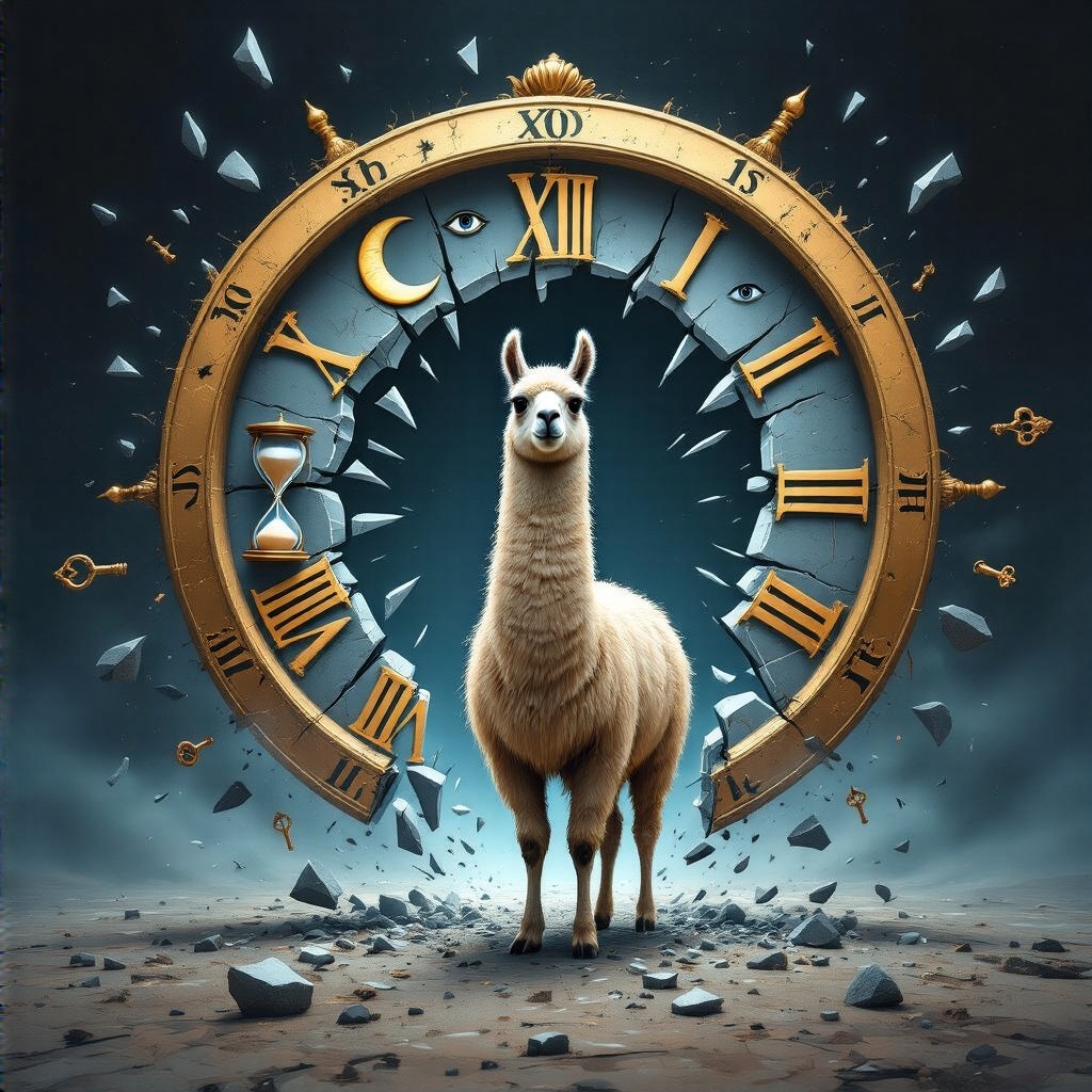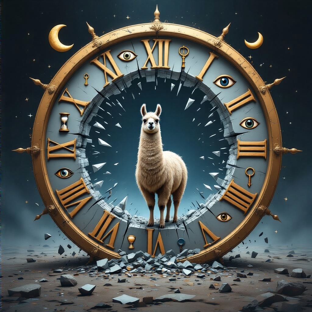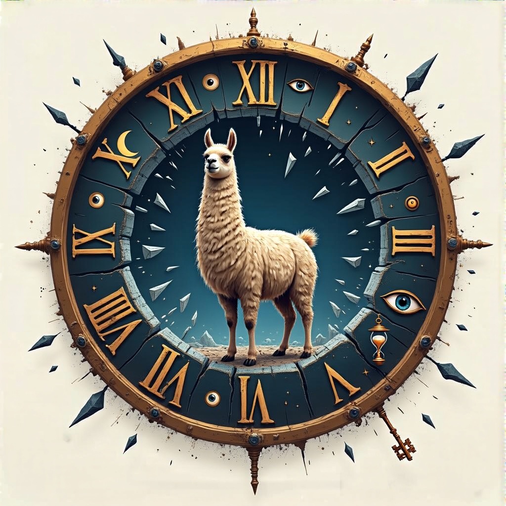 A llama stands at the center of a broken clock floating in an endless void. Instead of numbers, the clock face has symbols moons, hourglasses, eyes, and keys. Time is shattering outward in shards, forming a portal behind them. Use a palette of deep indigos, bronze gold, and eerie silver tones