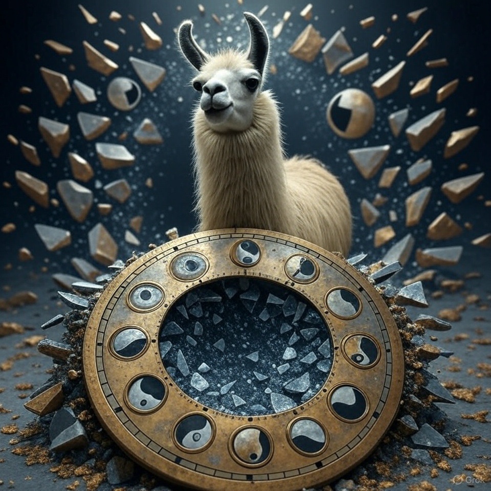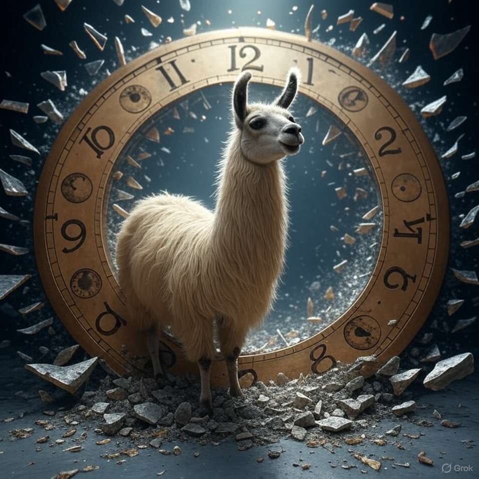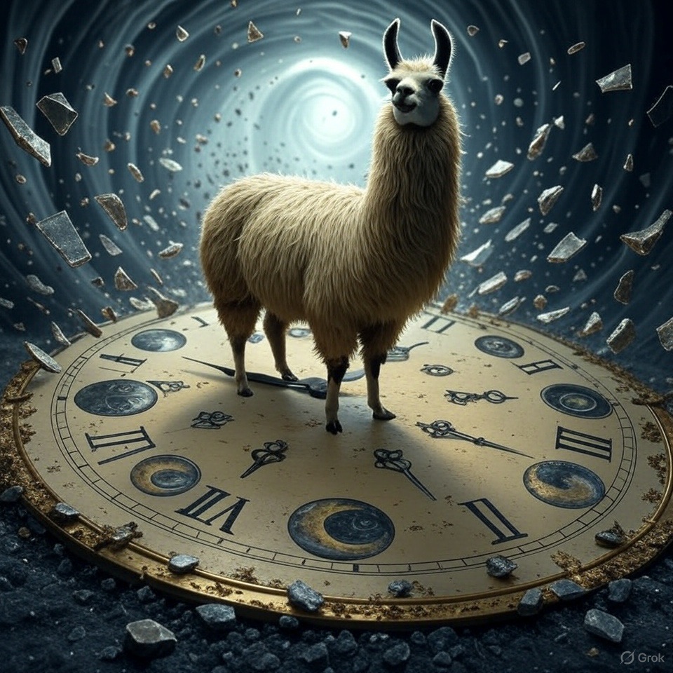 A llama stands at the center of a broken clock floating in an endless void. Instead of numbers, the clock face has symbols moons, hourglasses, eyes, and keys. Time is shattering outward in shards, forming a portal behind them. Use a palette of deep indigos, bronze gold, and eerie silver tones