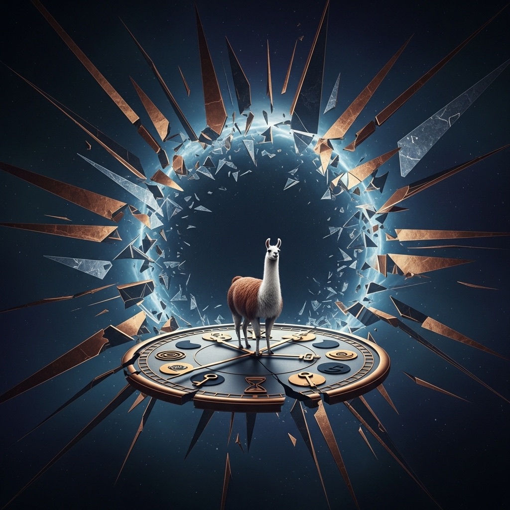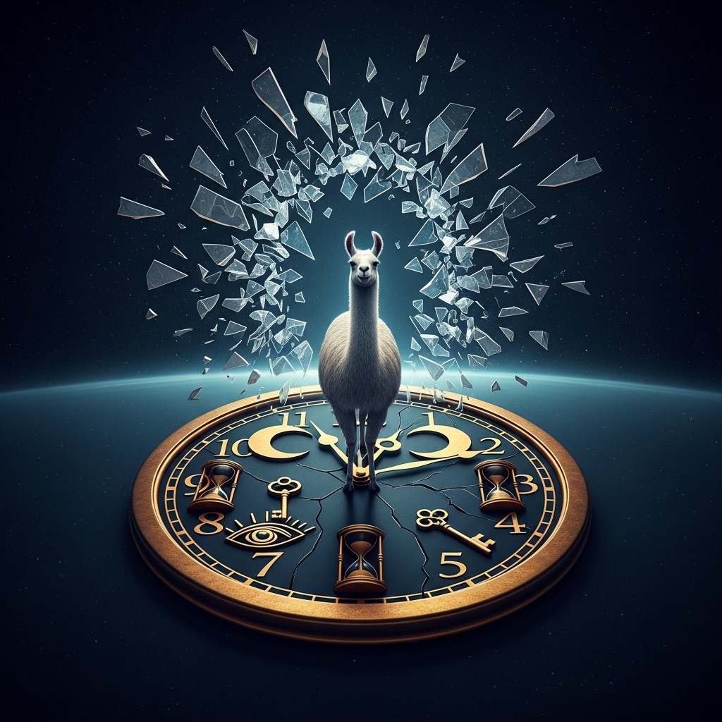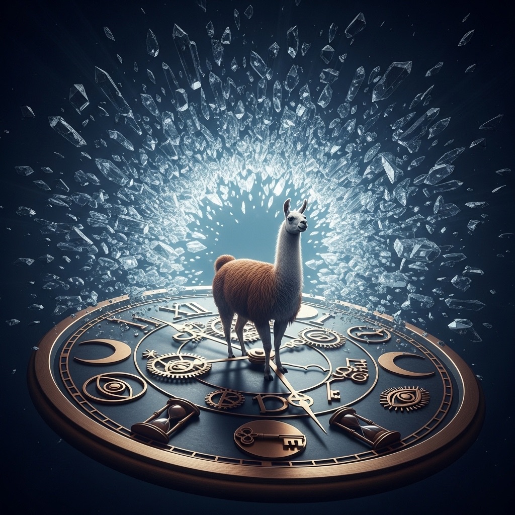 A llama stands at the center of a broken clock floating in an endless void. Instead of numbers, the clock face has symbols moons, hourglasses, eyes, and keys. Time is shattering outward in shards, forming a portal behind them. Use a palette of deep indigos, bronze gold, and eerie silver tones