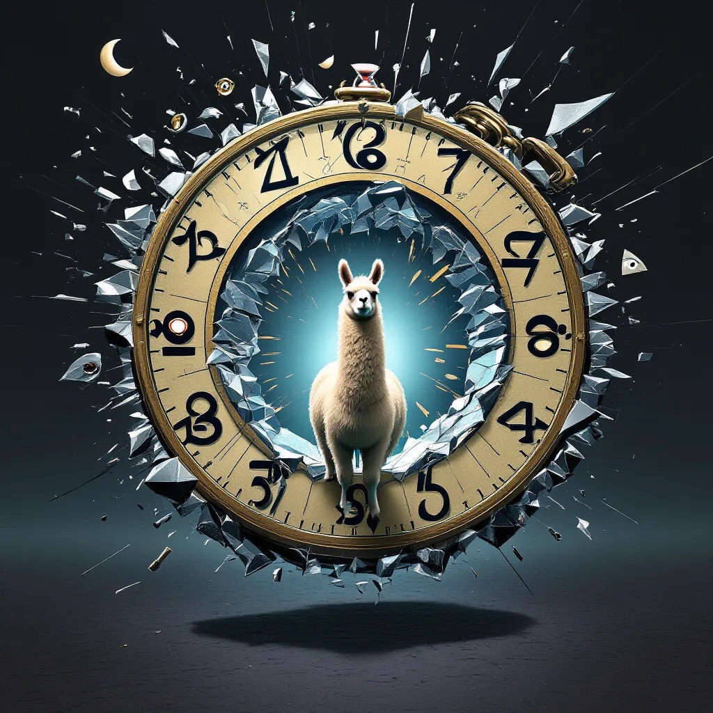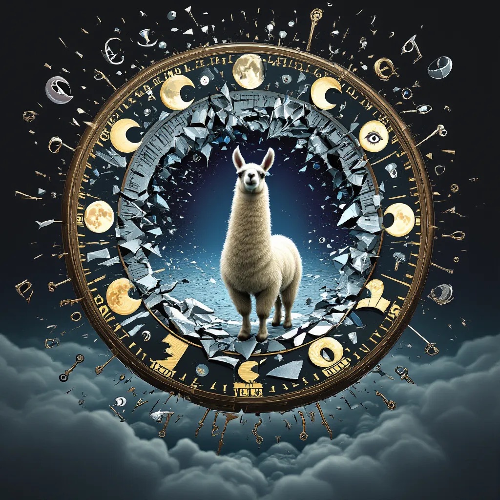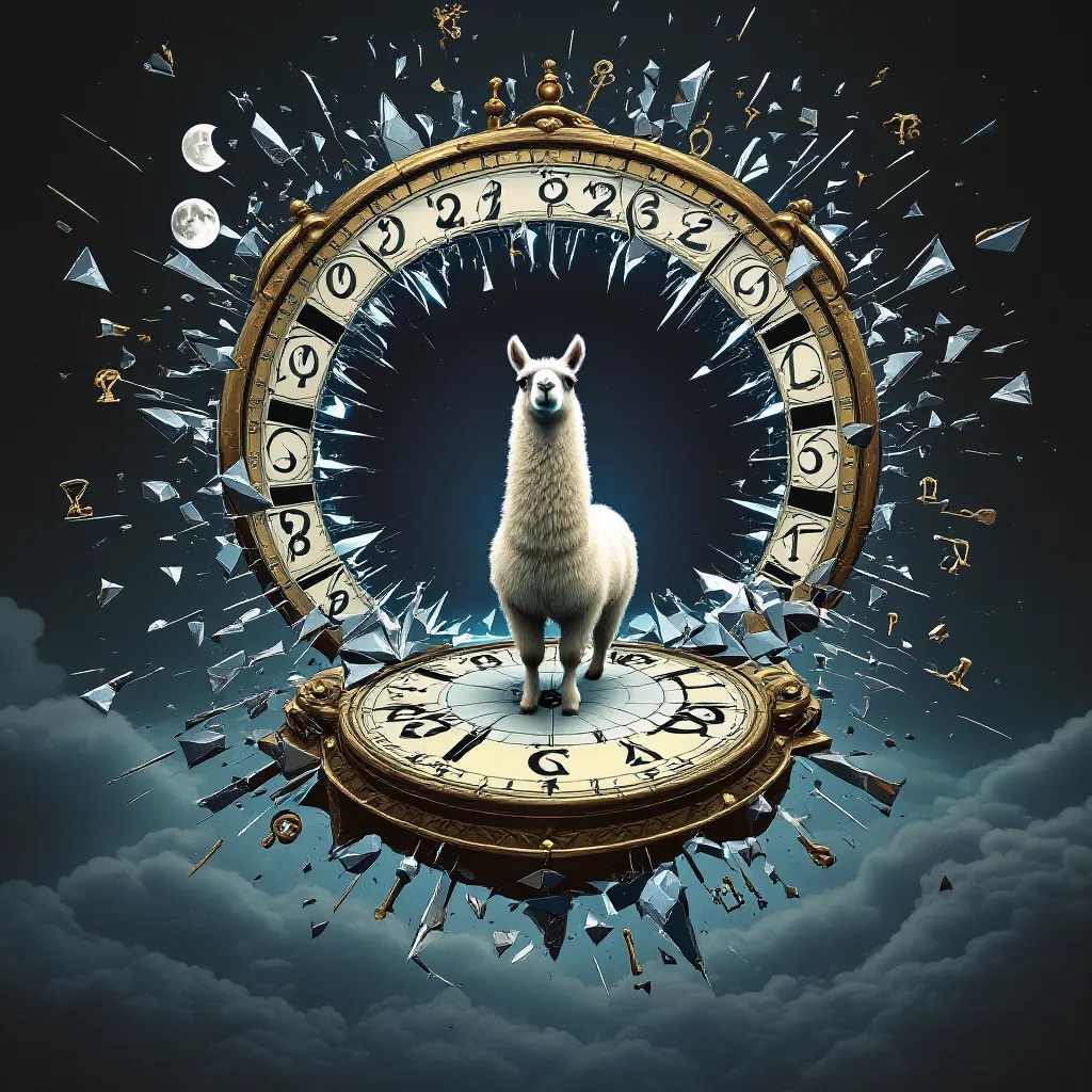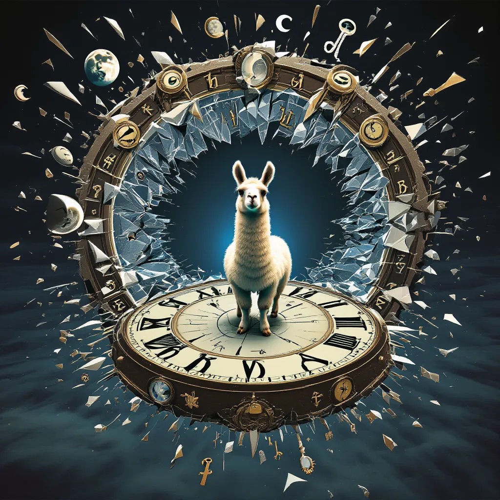 A llama stands at the center of a broken clock floating in an endless void. Instead of numbers, the clock face has symbols moons, hourglasses, eyes, and keys. Time is shattering outward in shards, forming a portal behind them. Use a palette of deep indigos, bronze gold, and eerie silver tones
