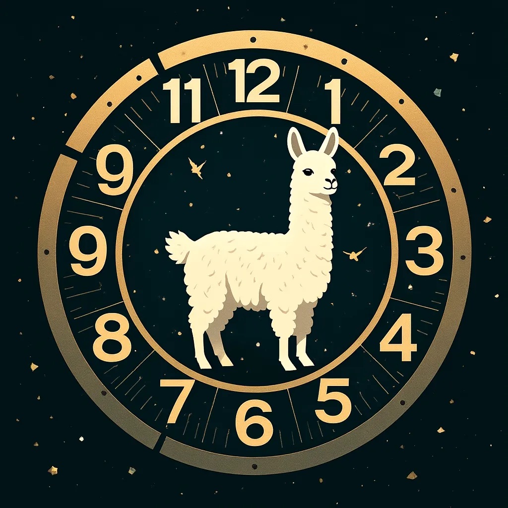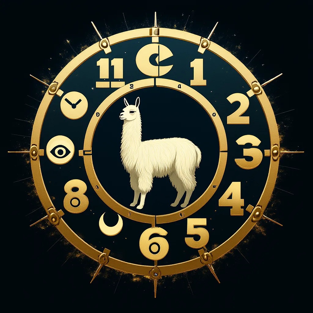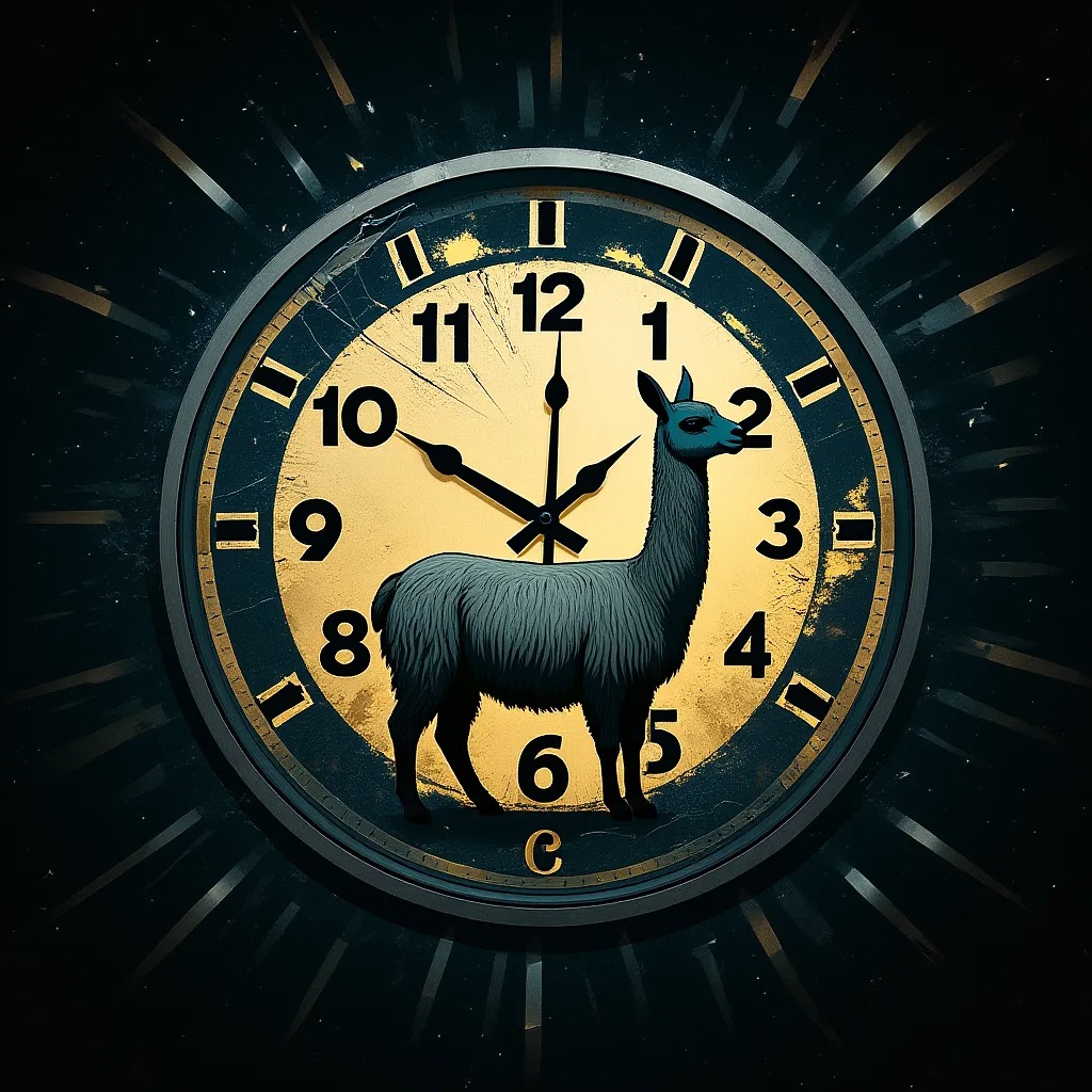 A llama stands at the center of a broken clock floating in an endless void. Instead of numbers, the clock face has symbols moons, hourglasses, eyes, and keys. Time is shattering outward in shards, forming a portal behind them. Use a palette of deep indigos, bronze gold, and eerie silver tones