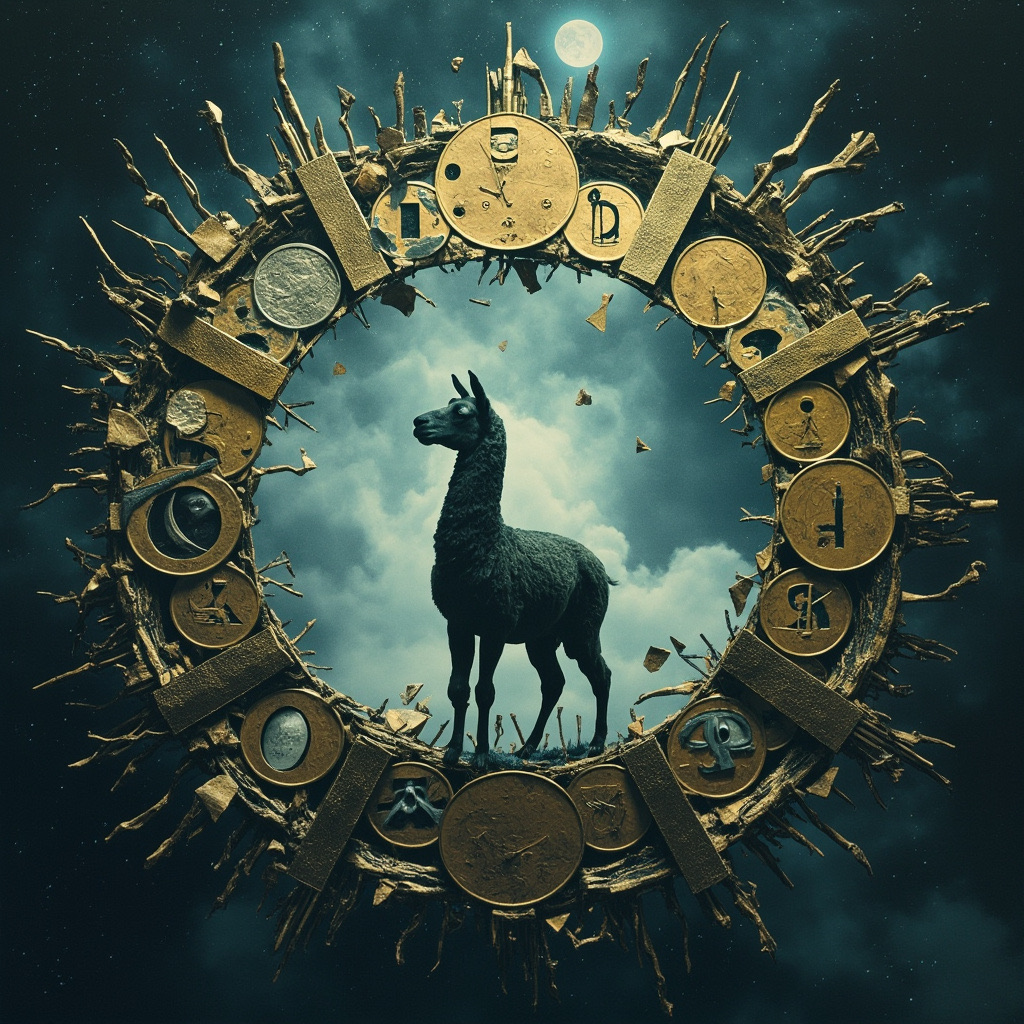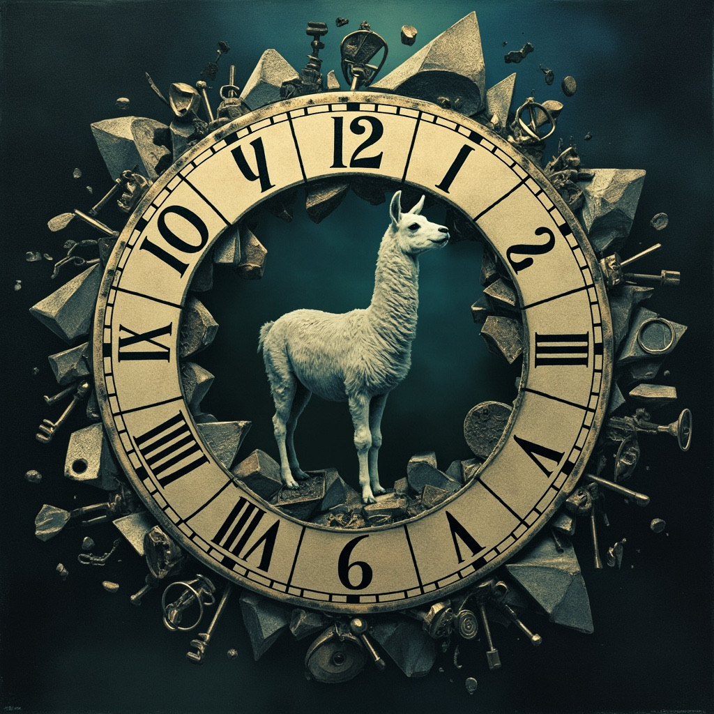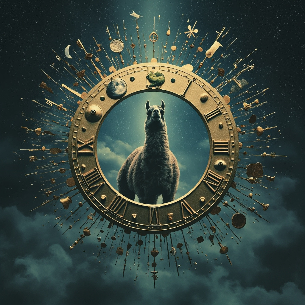 A llama stands at the center of a broken clock floating in an endless void. Instead of numbers, the clock face has symbols moons, hourglasses, eyes, and keys. Time is shattering outward in shards, forming a portal behind them. Use a palette of deep indigos, bronze gold, and eerie silver tones