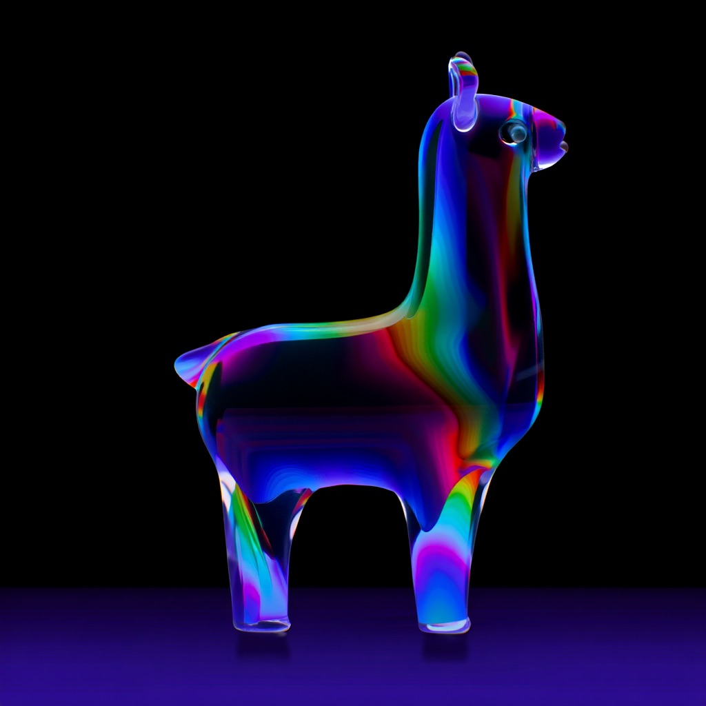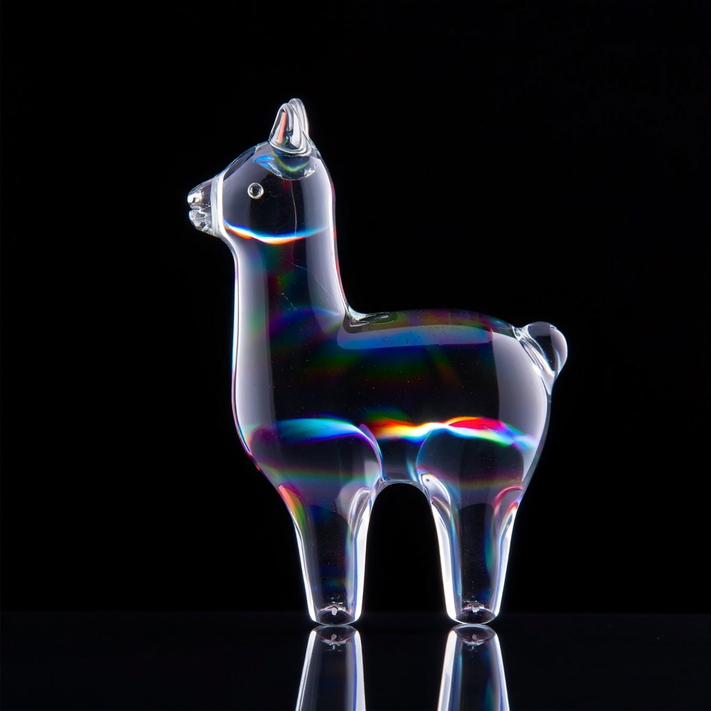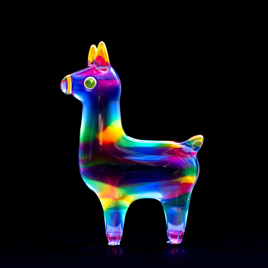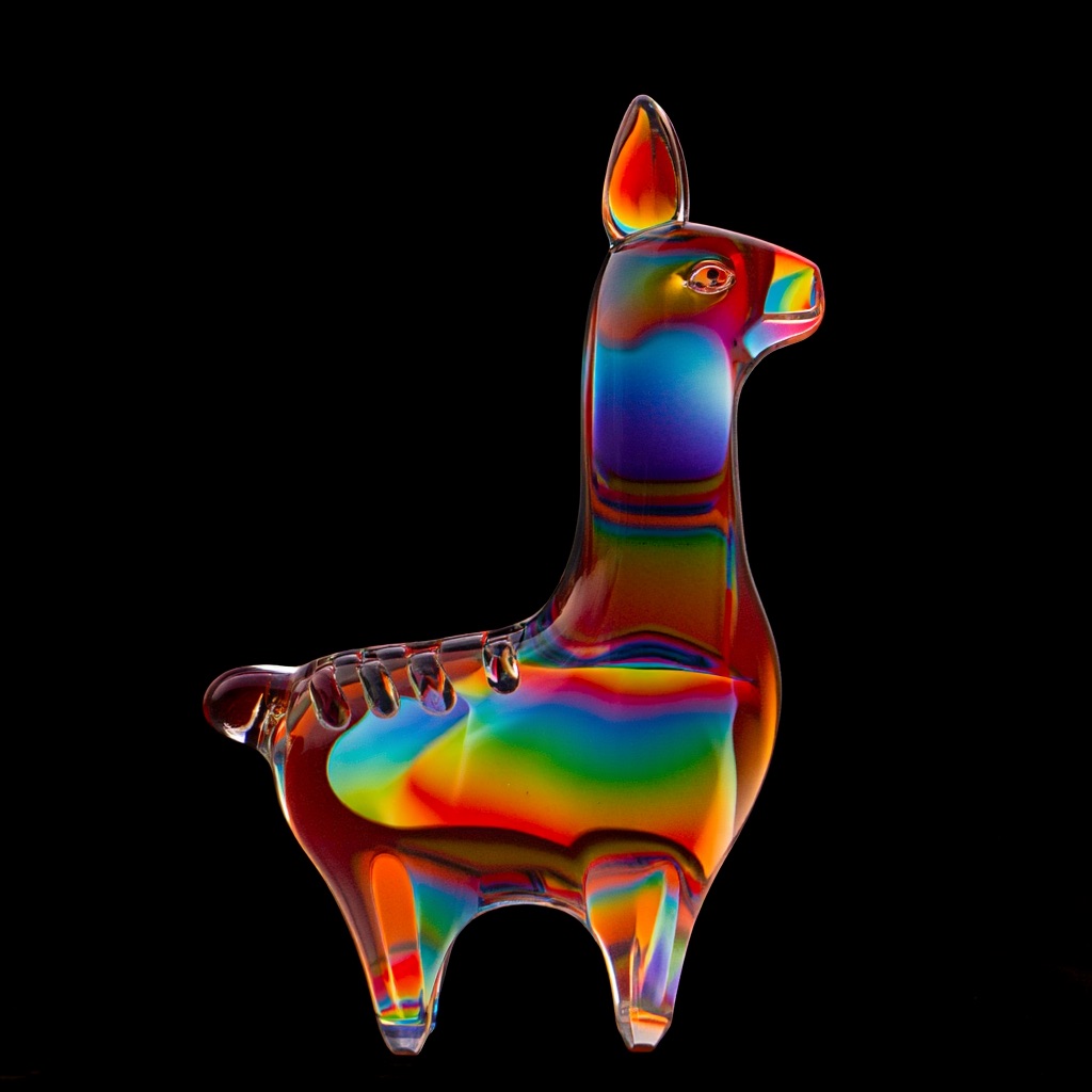 a llama shape made of glass. Black background. Rainbow glass refractions.