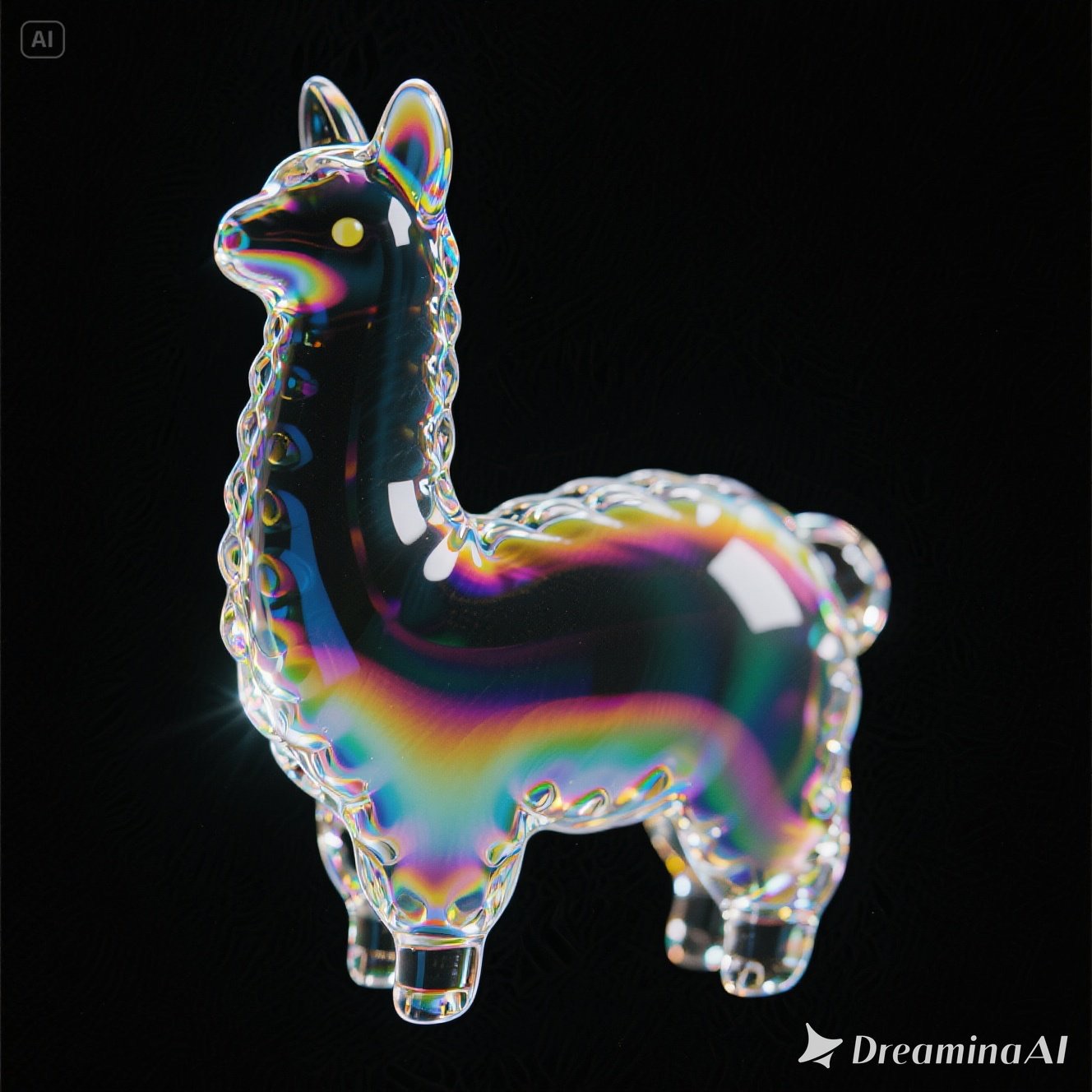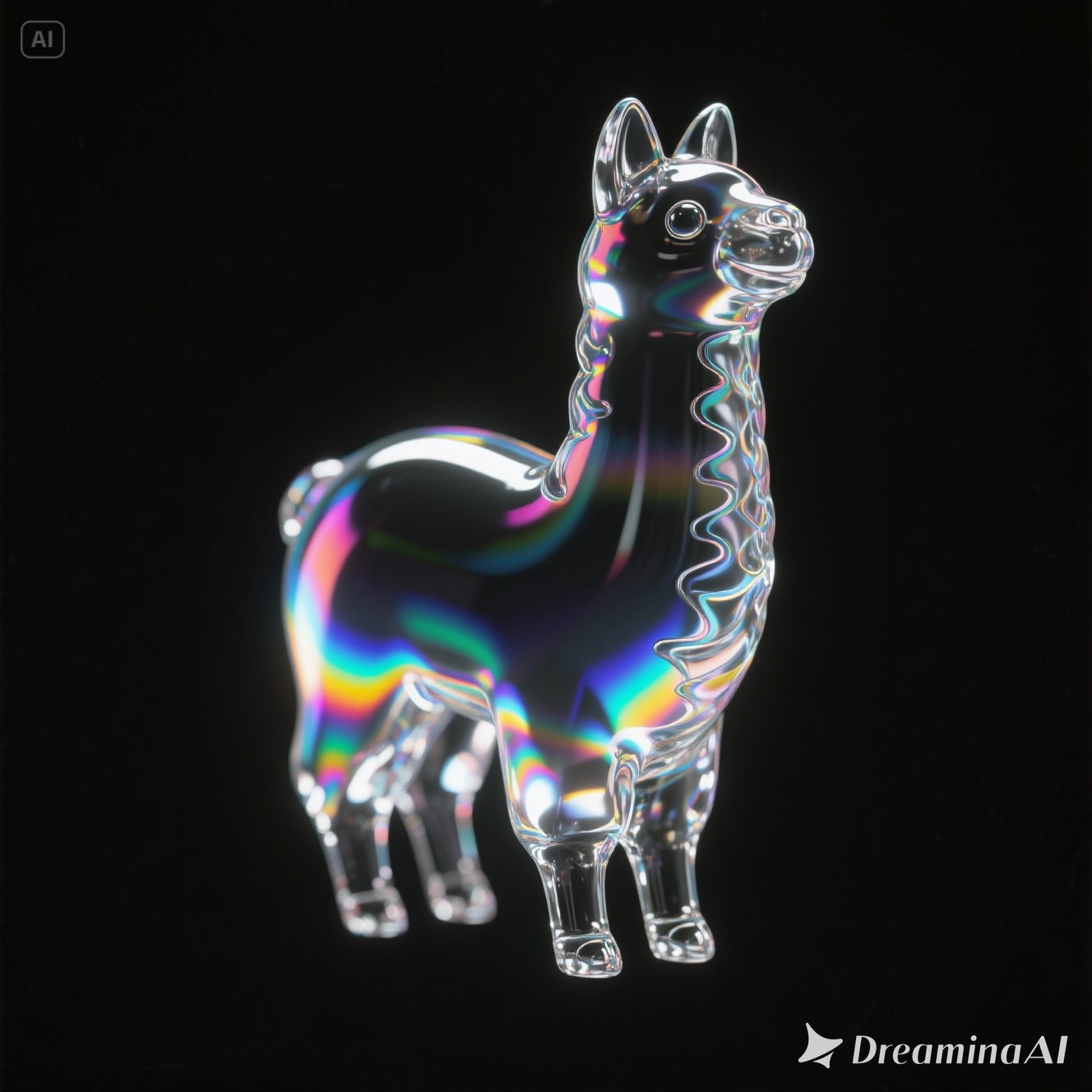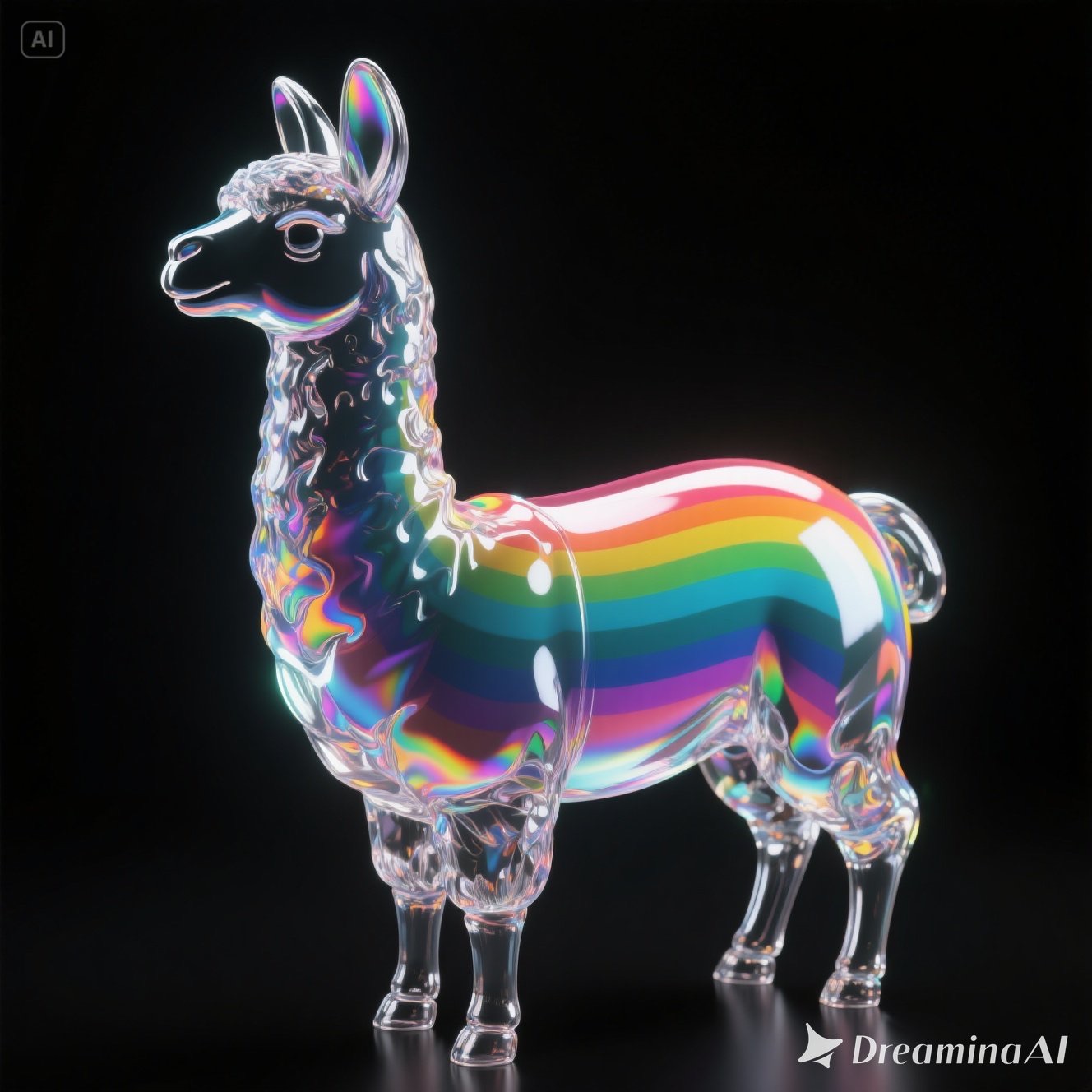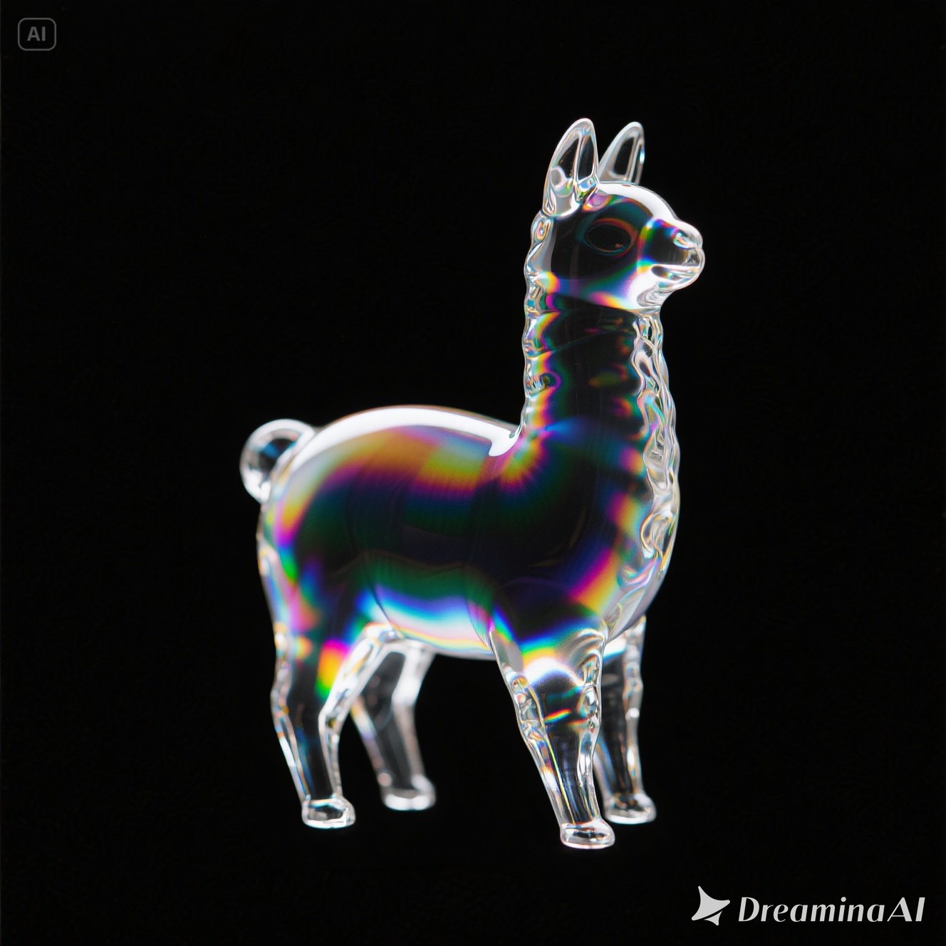 a llama shape made of glass. Black background. Rainbow glass refractions.