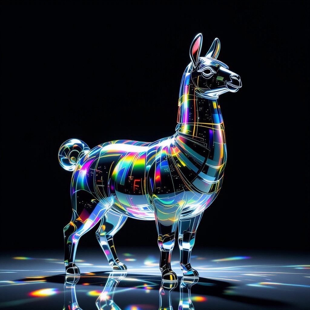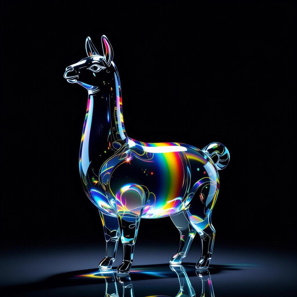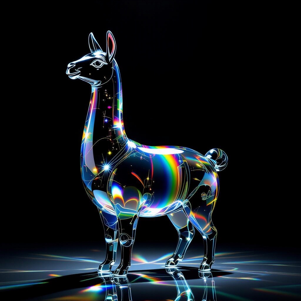 a llama shape made of glass. Black background. Rainbow glass refractions.