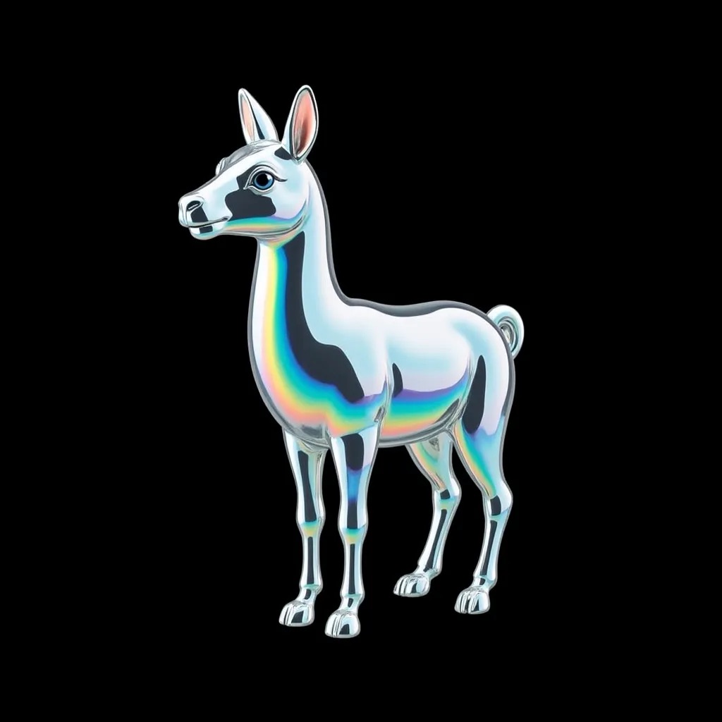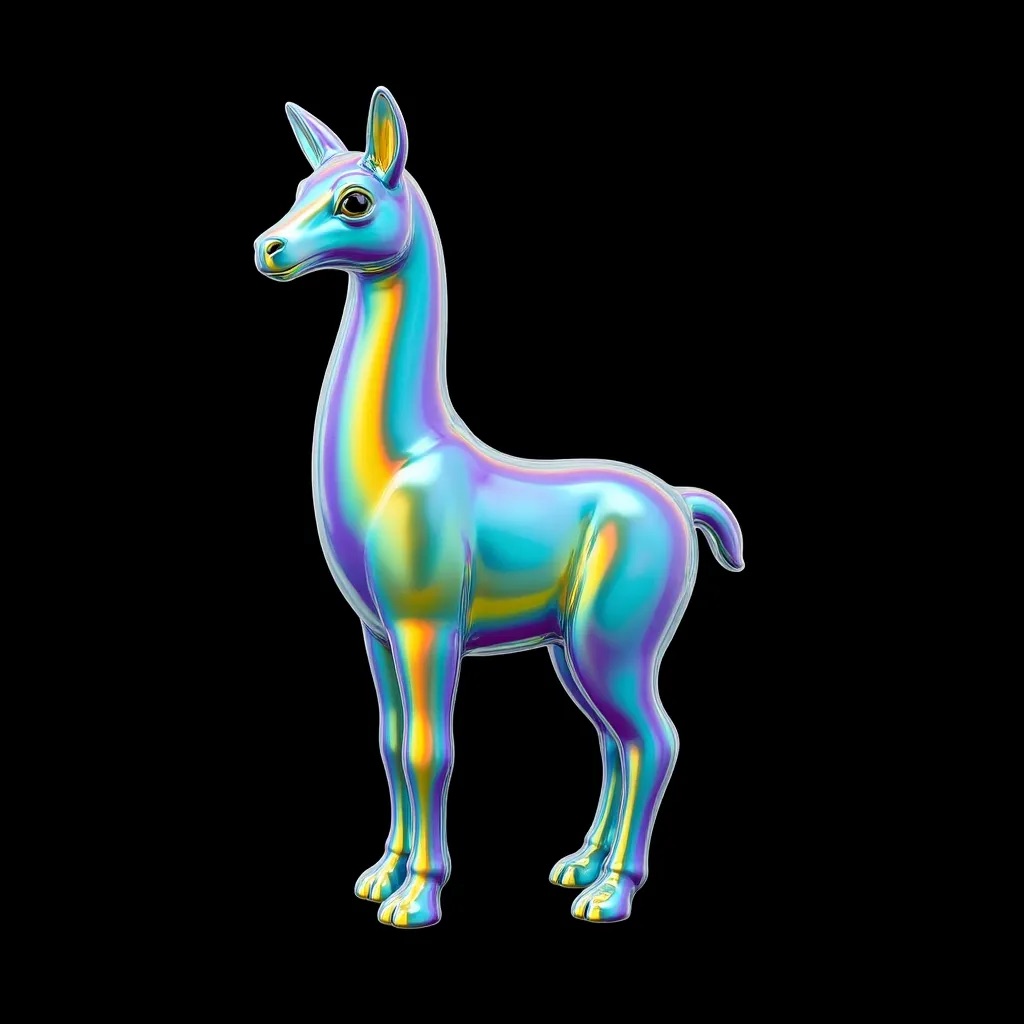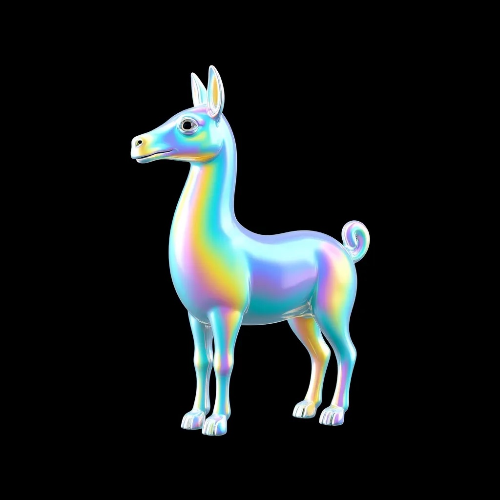 a llama shape made of glass. Black background. Rainbow glass refractions.