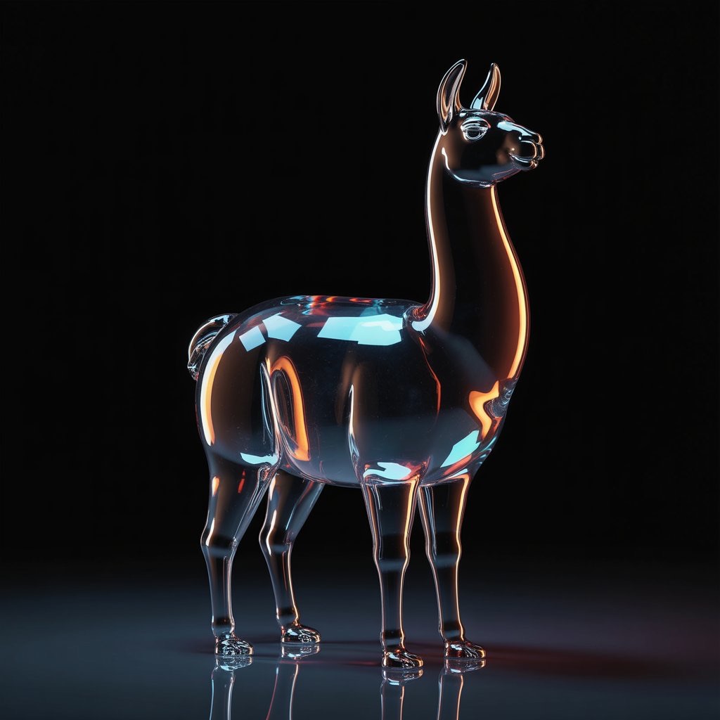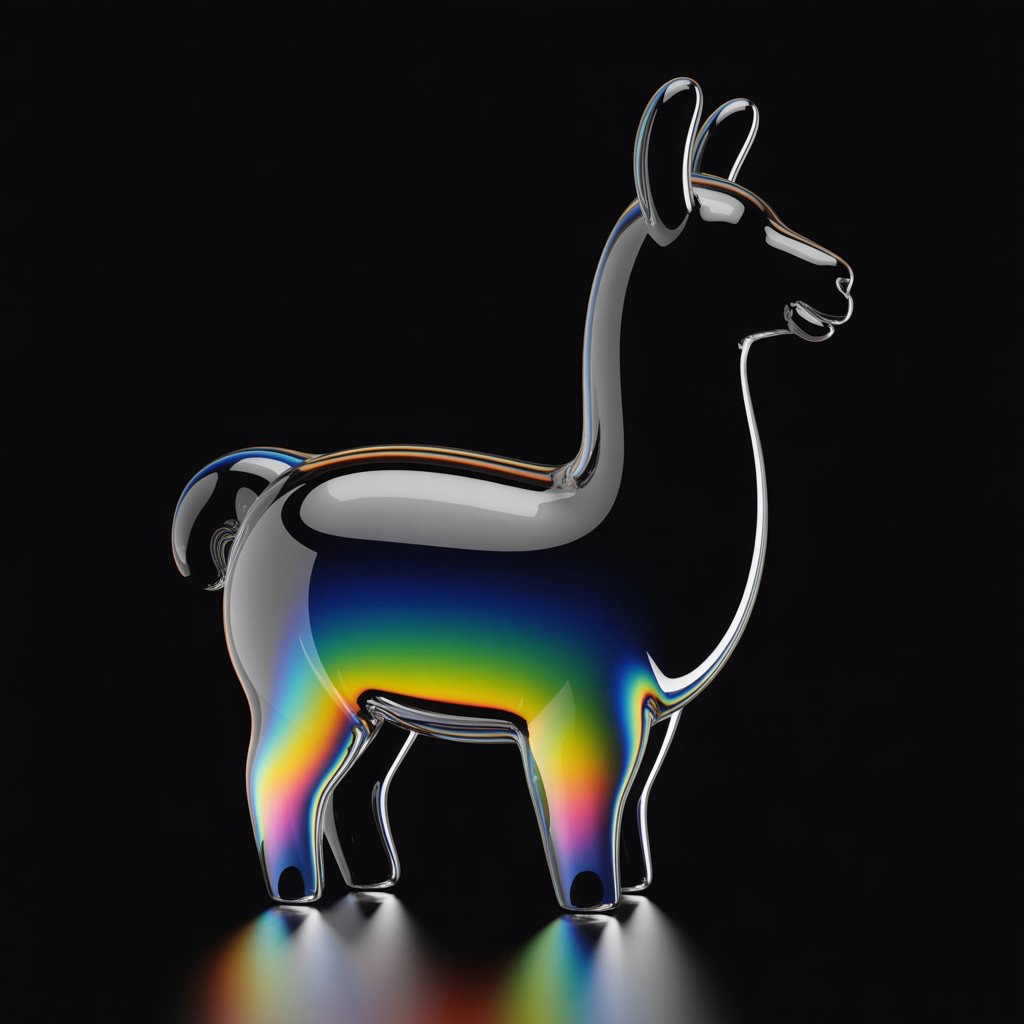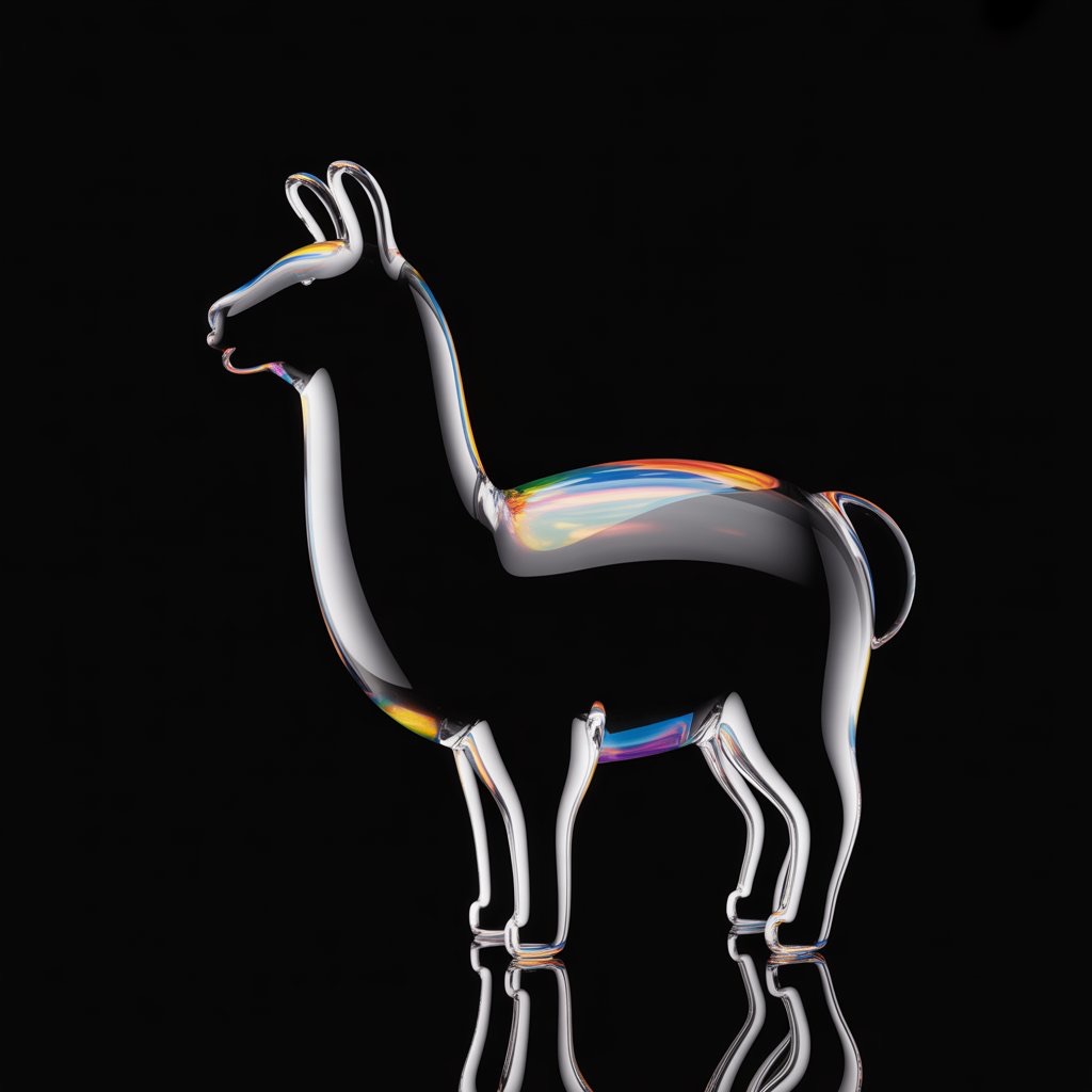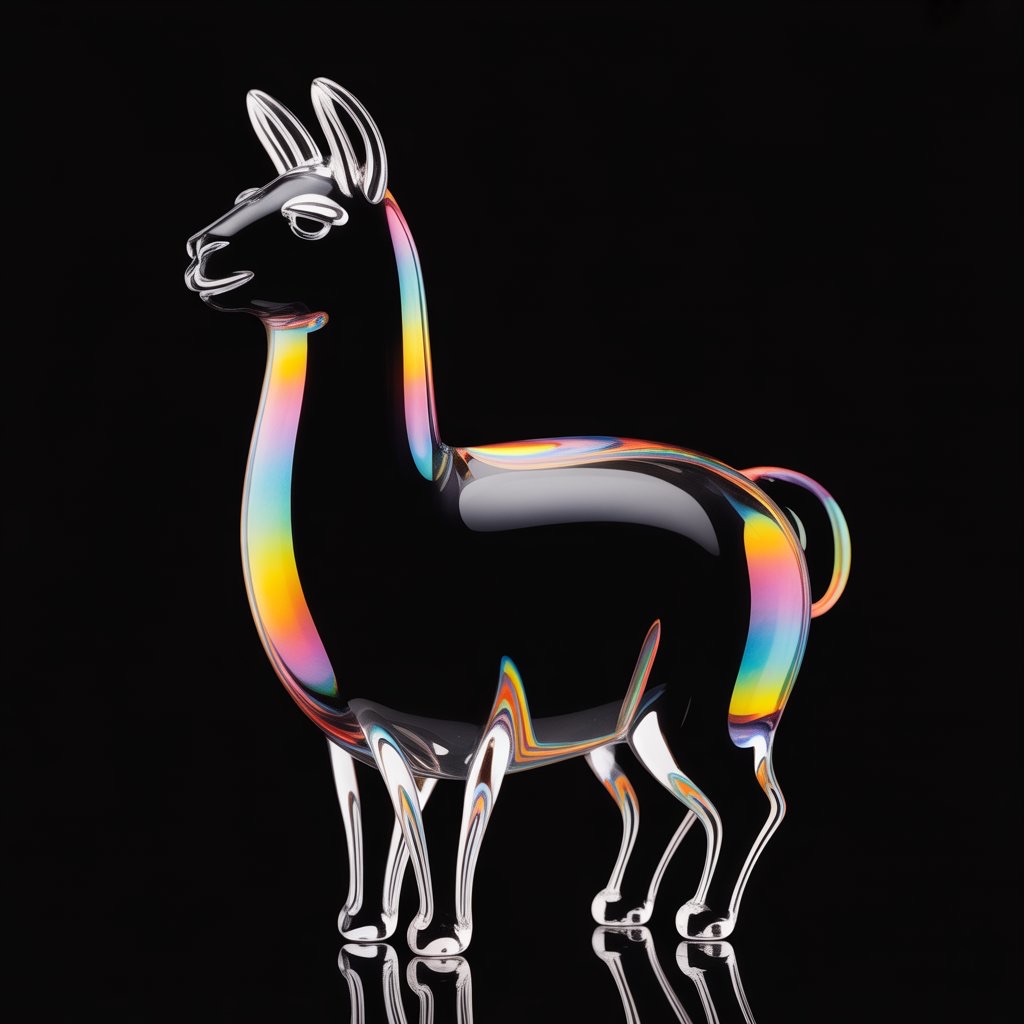 a llama shape made of glass. Black background. Rainbow glass refractions.