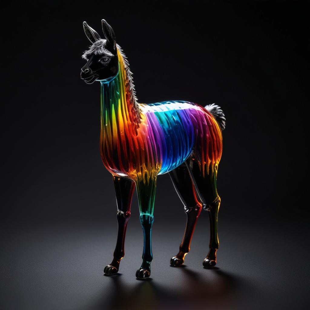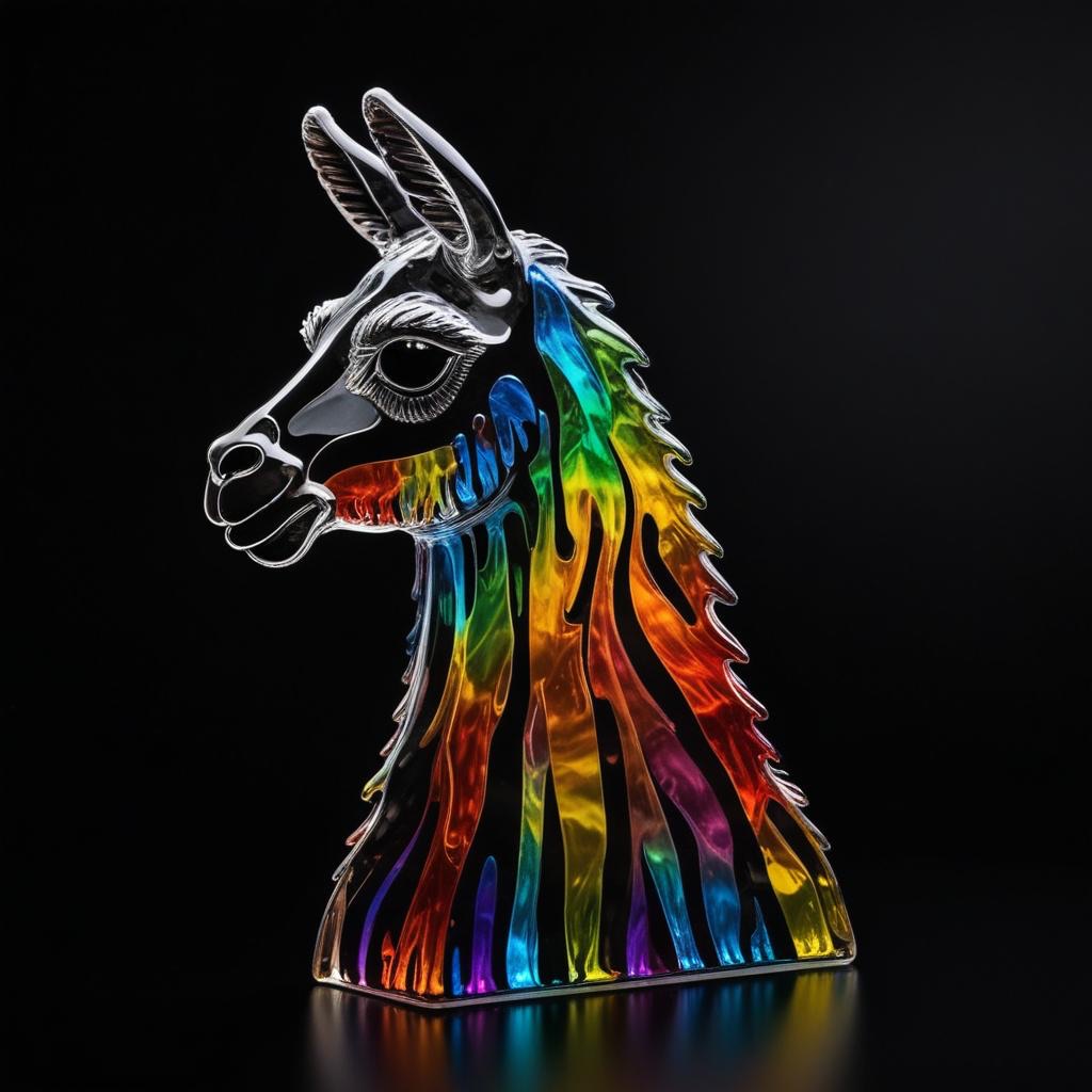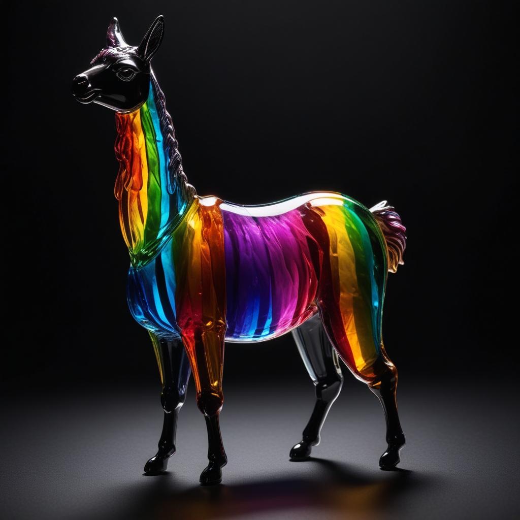 a llama shape made of glass. Black background. Rainbow glass refractions.