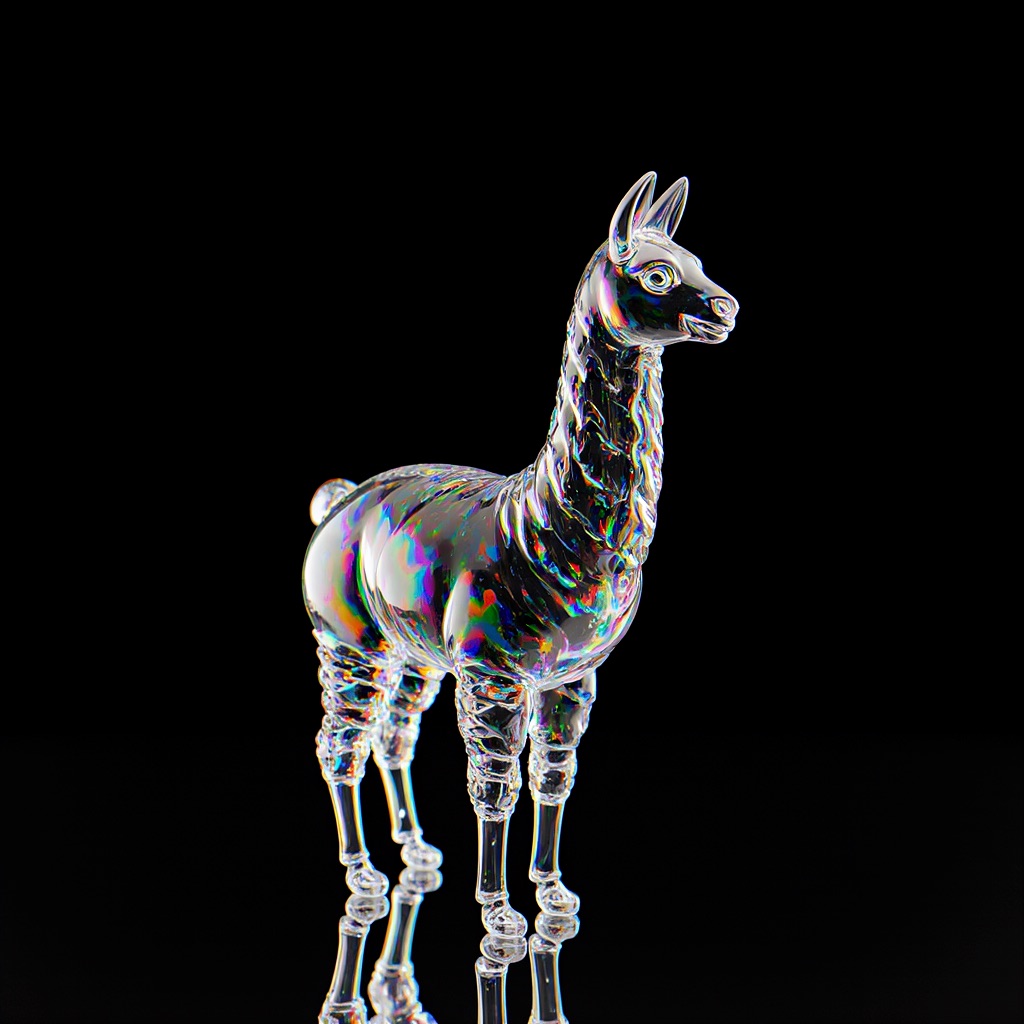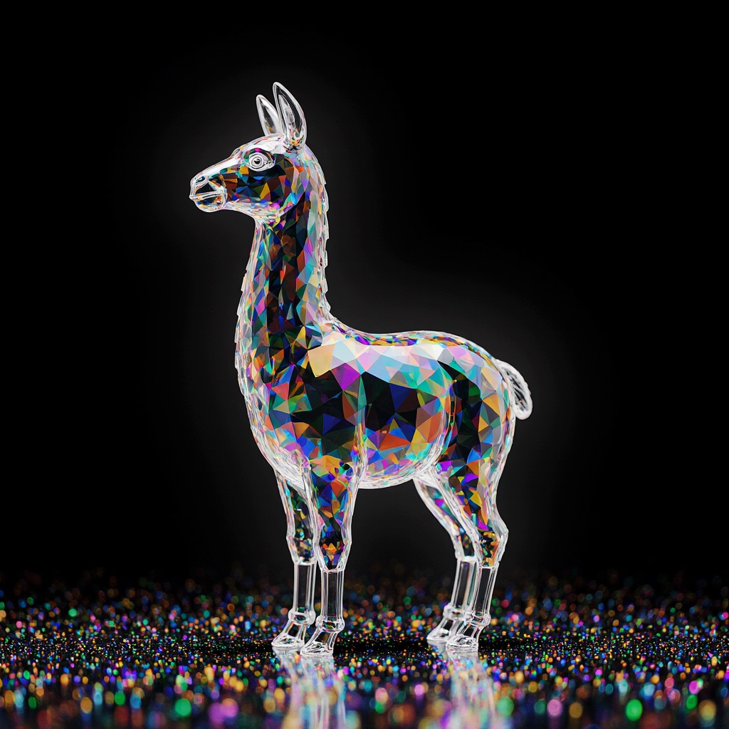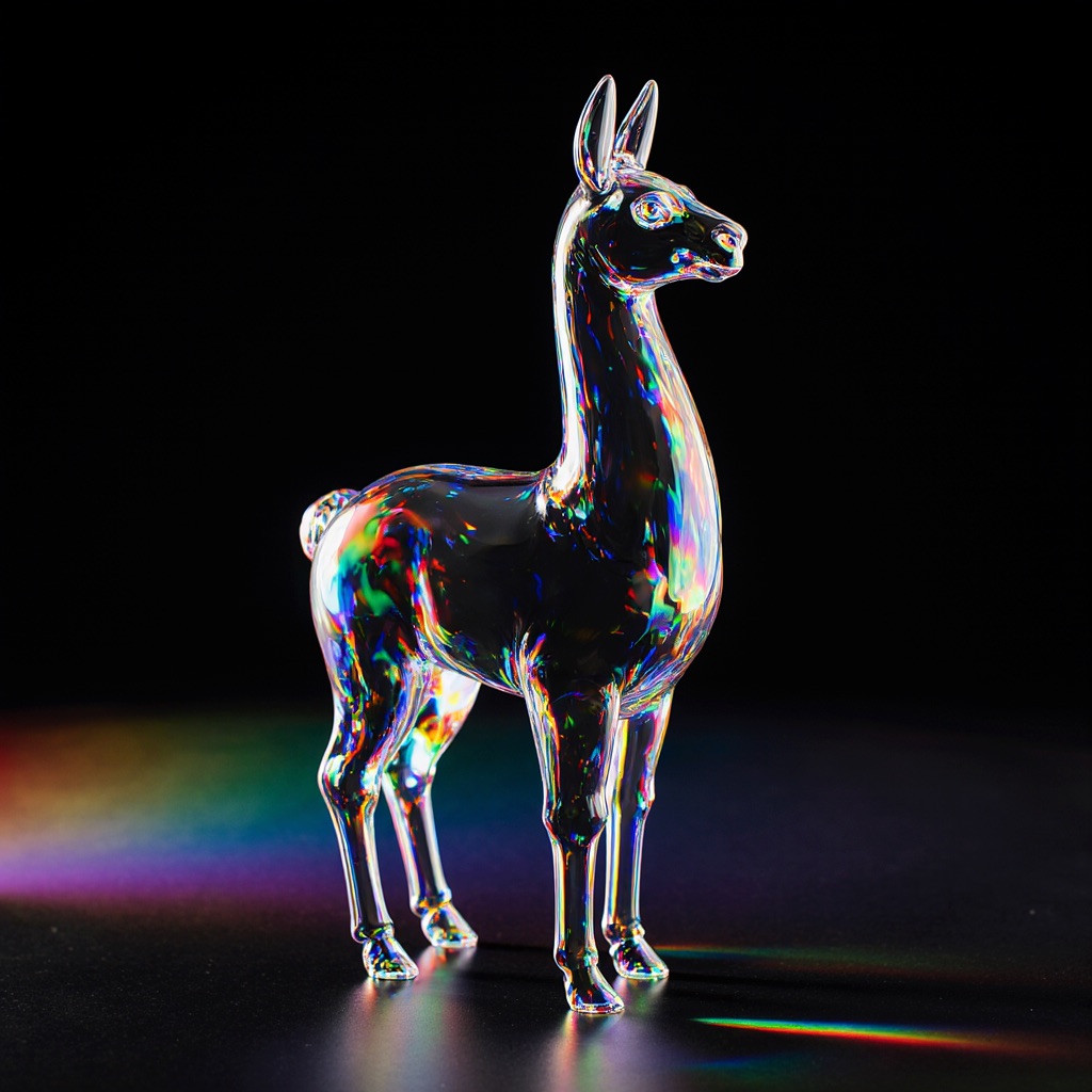 a llama shape made of glass. Black background. Rainbow glass refractions.