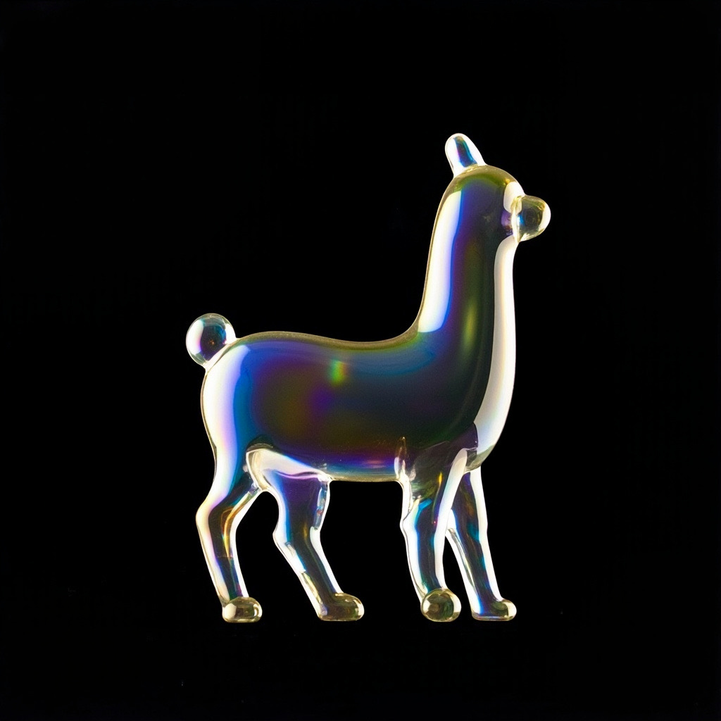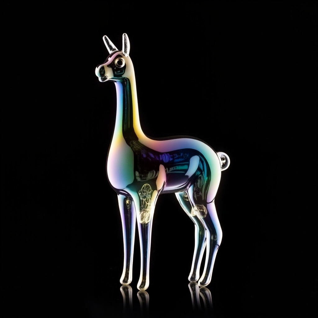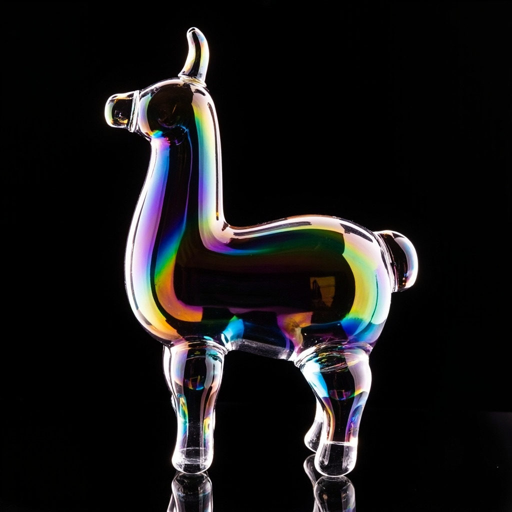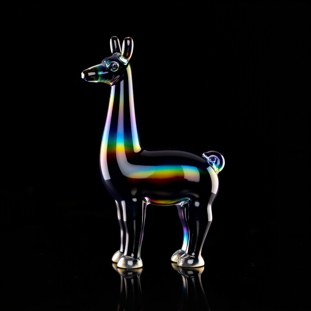 a llama shape made of glass. Black background. Rainbow glass refractions.