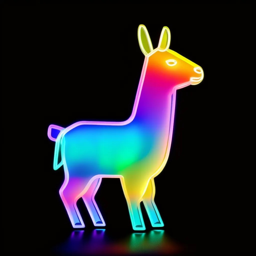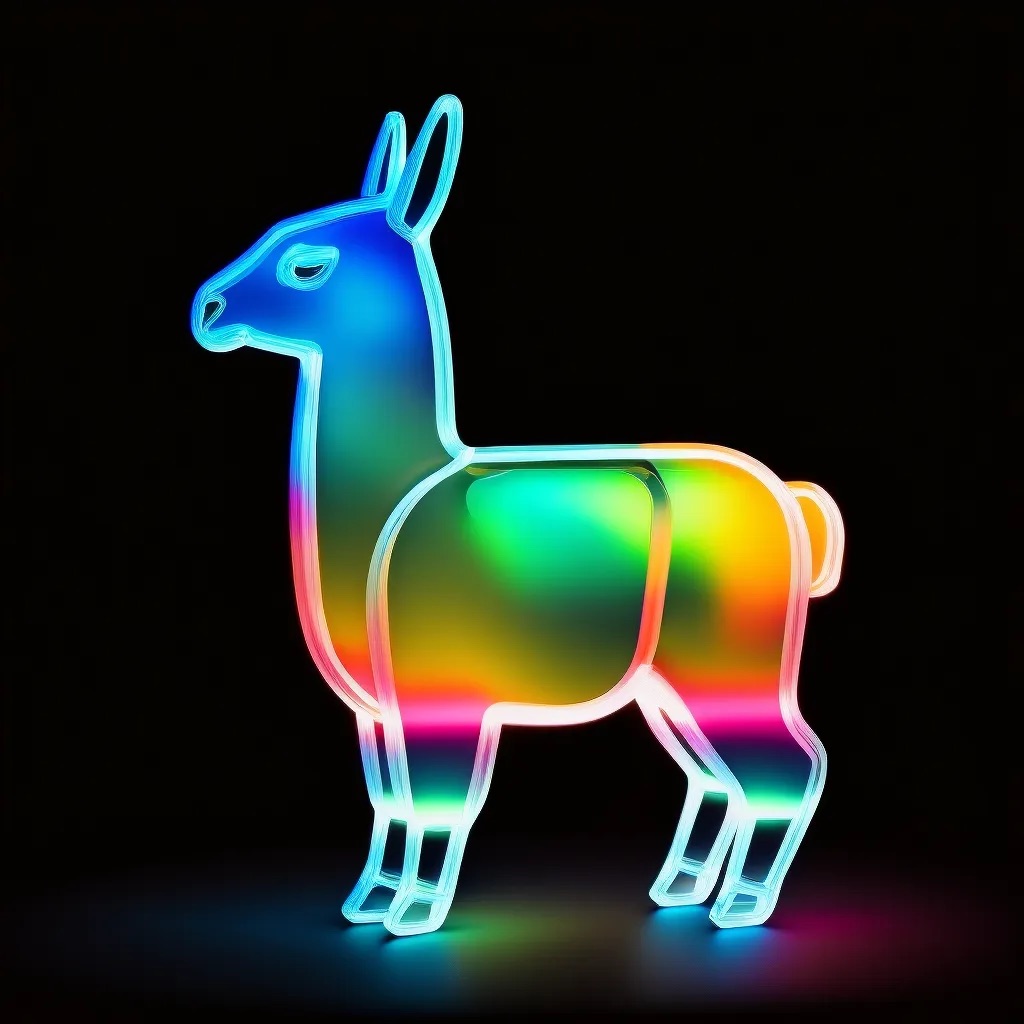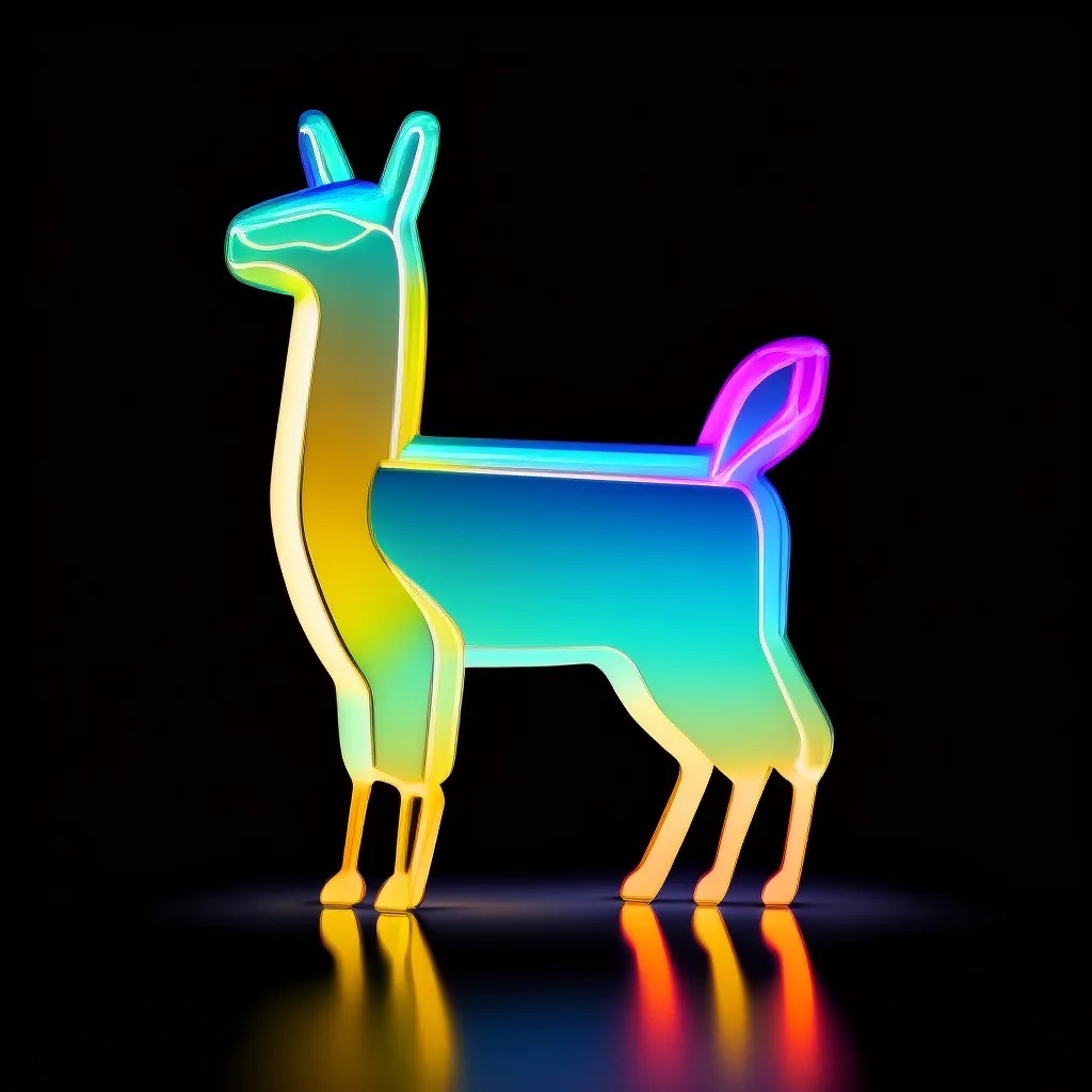 a llama shape made of glass. Black background. Rainbow glass refractions.