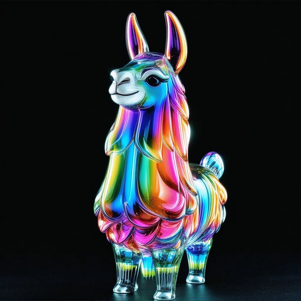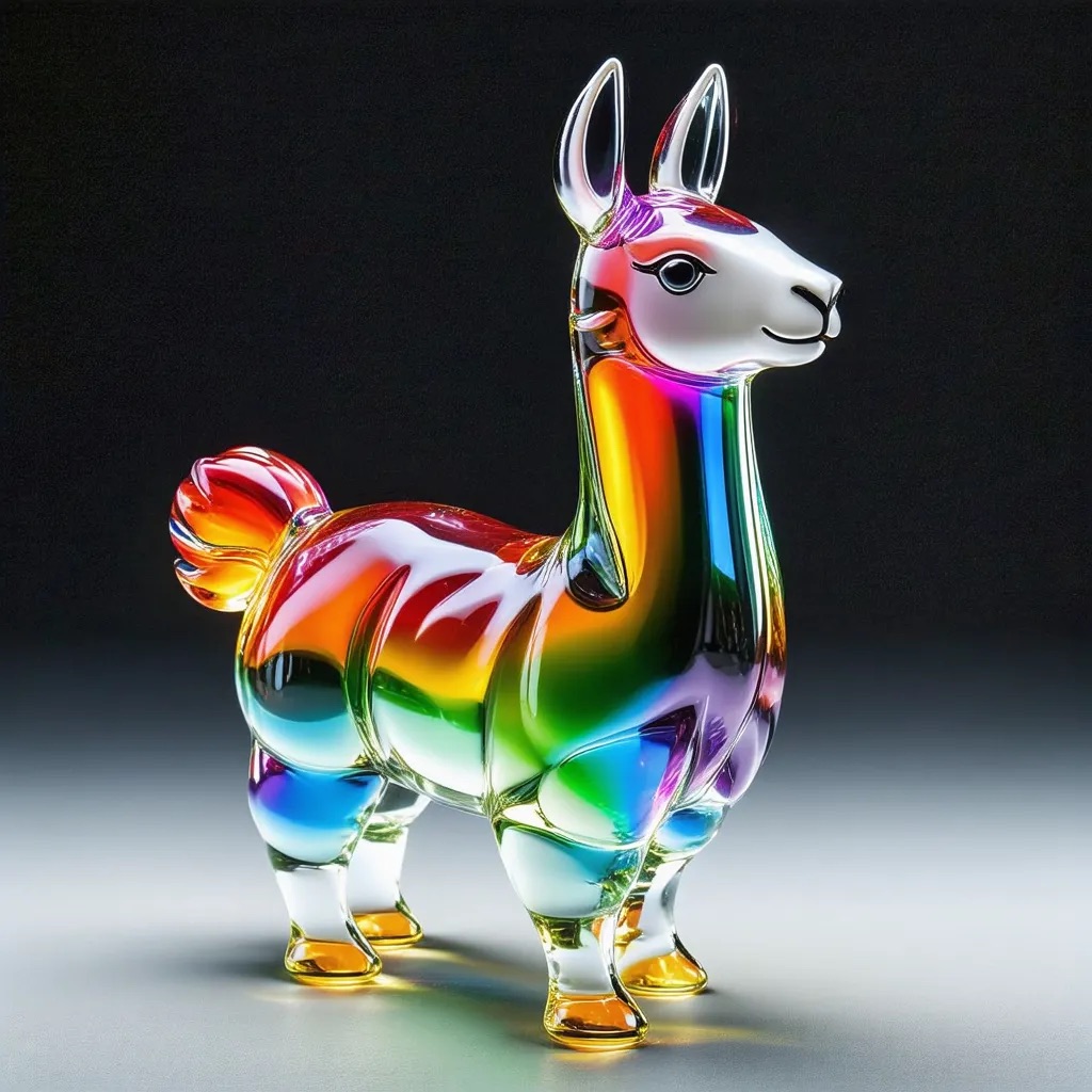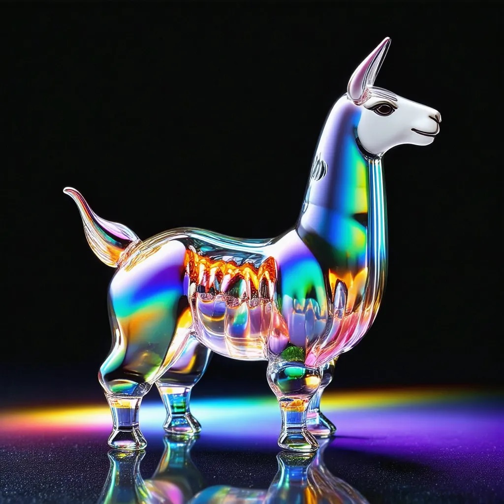 a llama shape made of glass. Black background. Rainbow glass refractions.