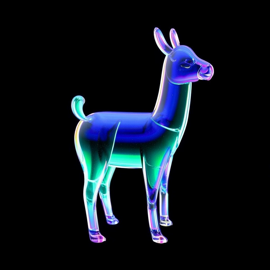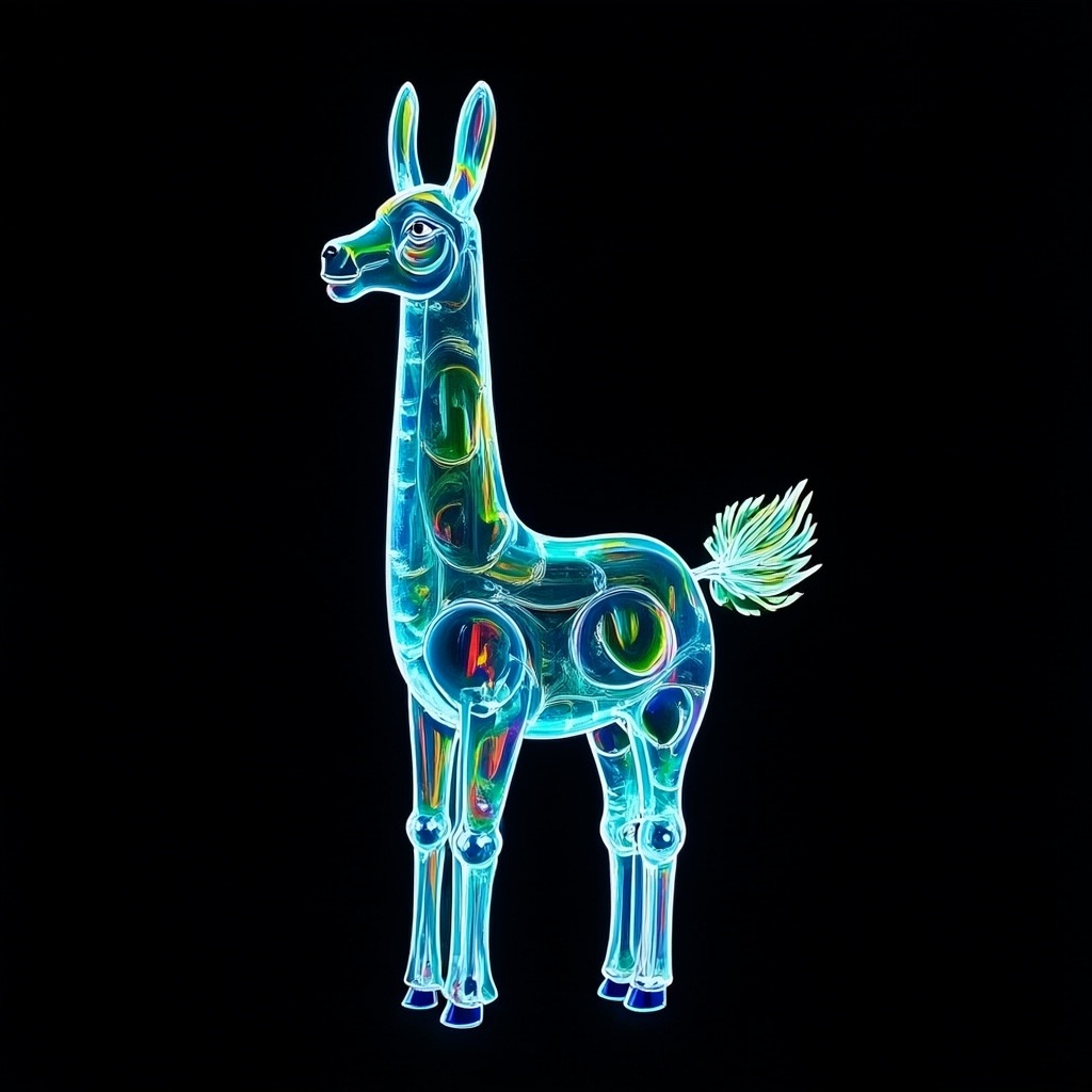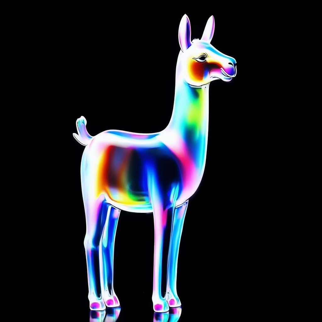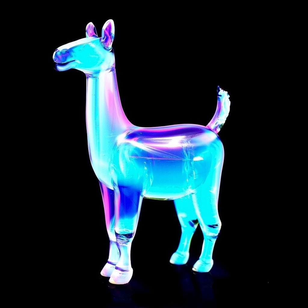 a llama shape made of glass. Black background. Rainbow glass refractions.