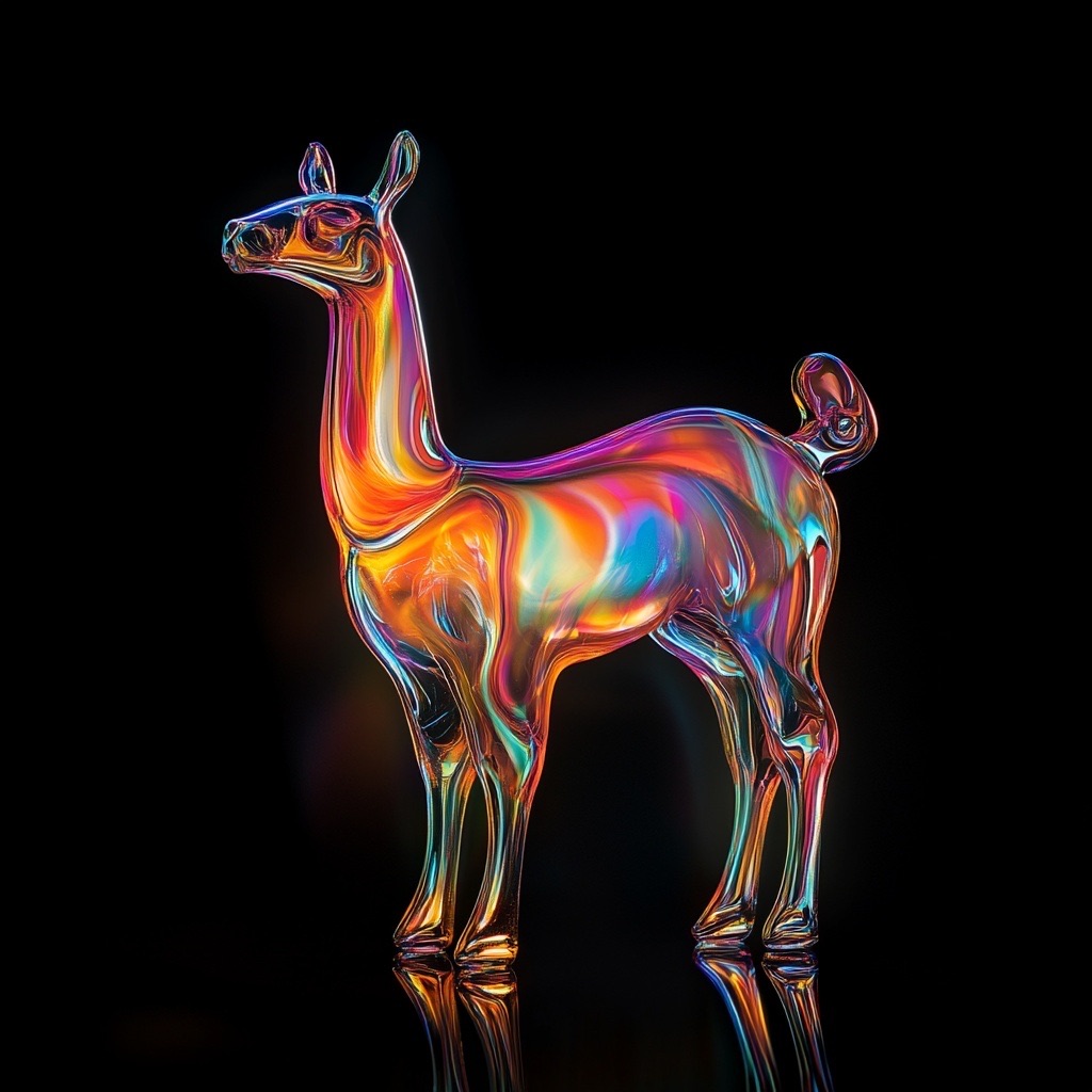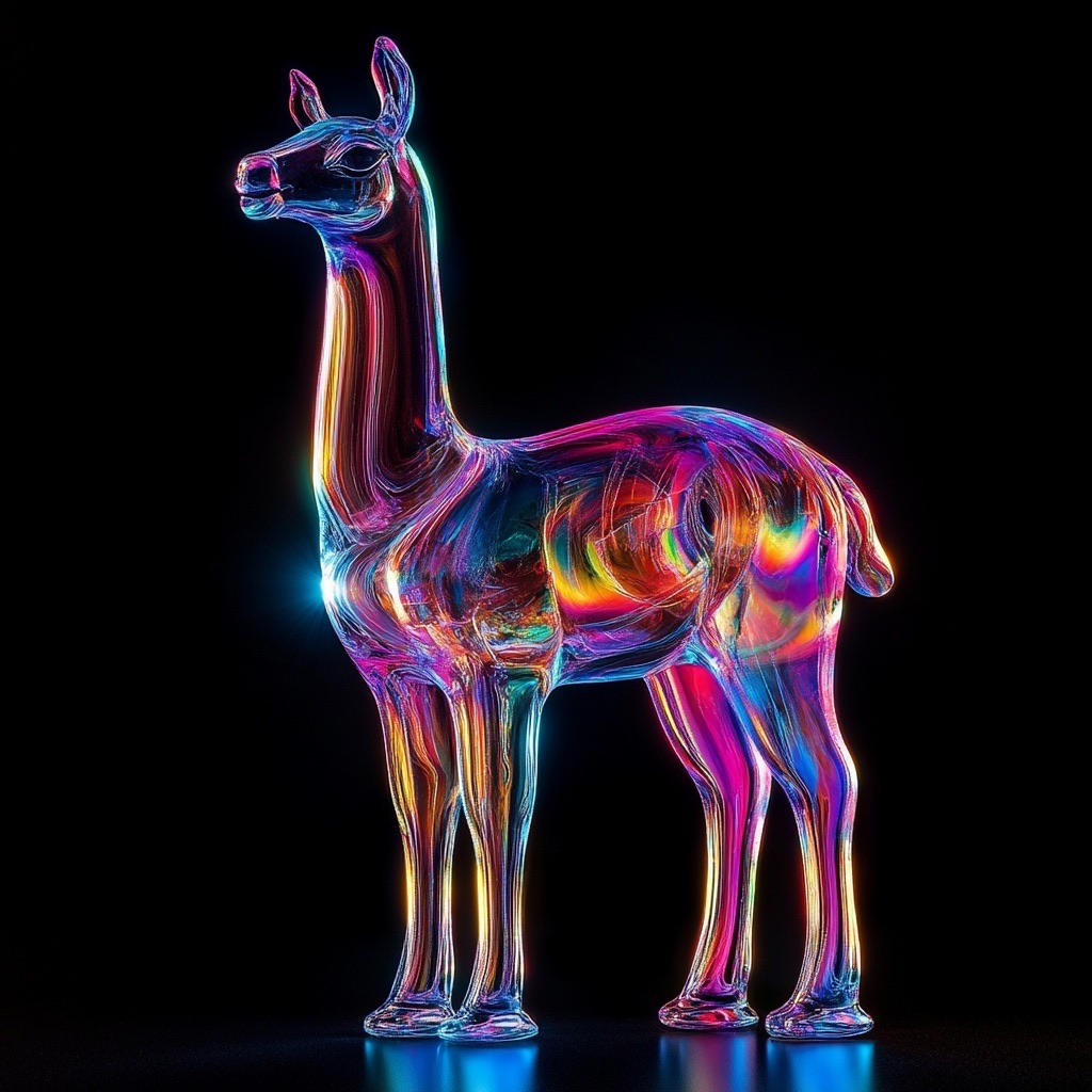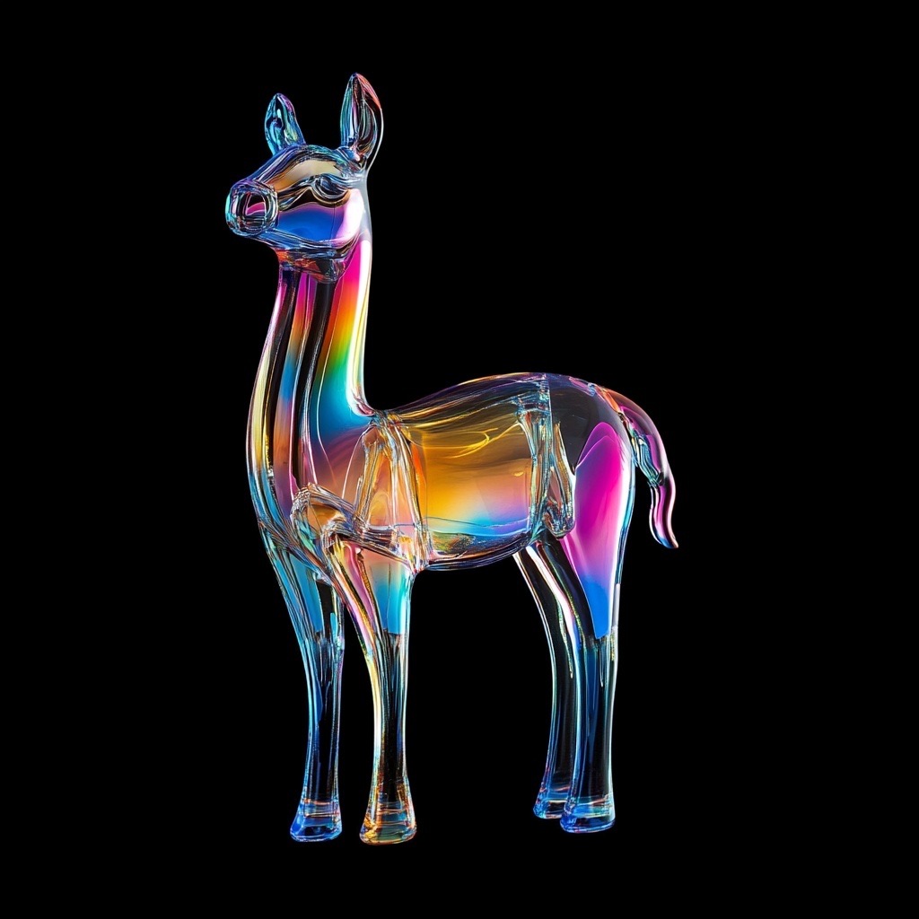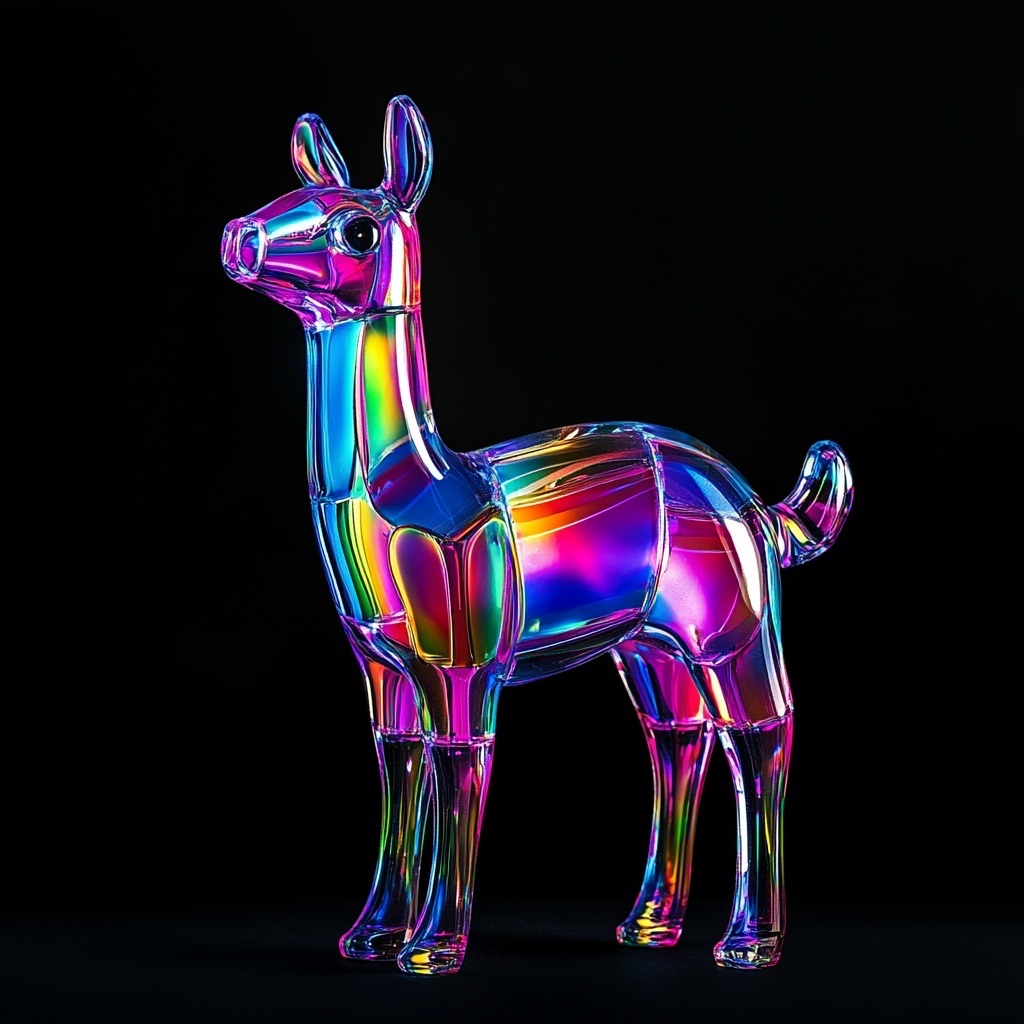 a llama shape made of glass. Black background. Rainbow glass refractions.
