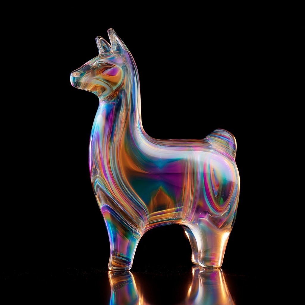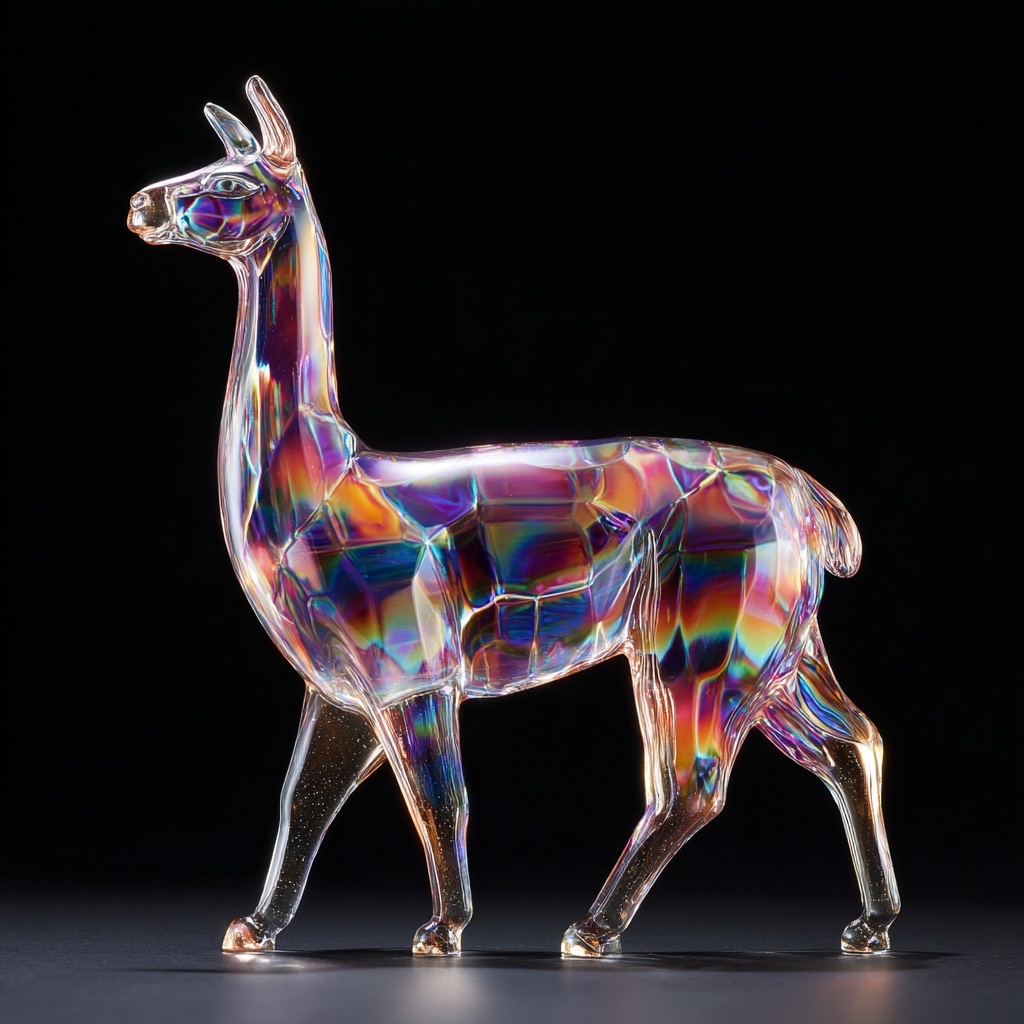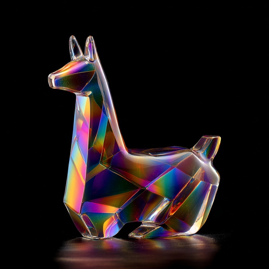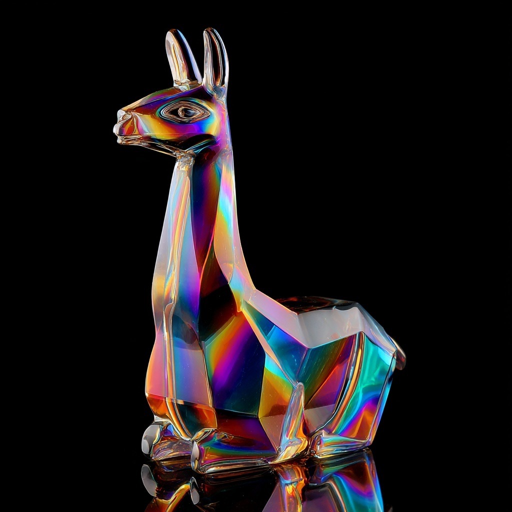 a llama shape made of glass. Black background. Rainbow glass refractions.