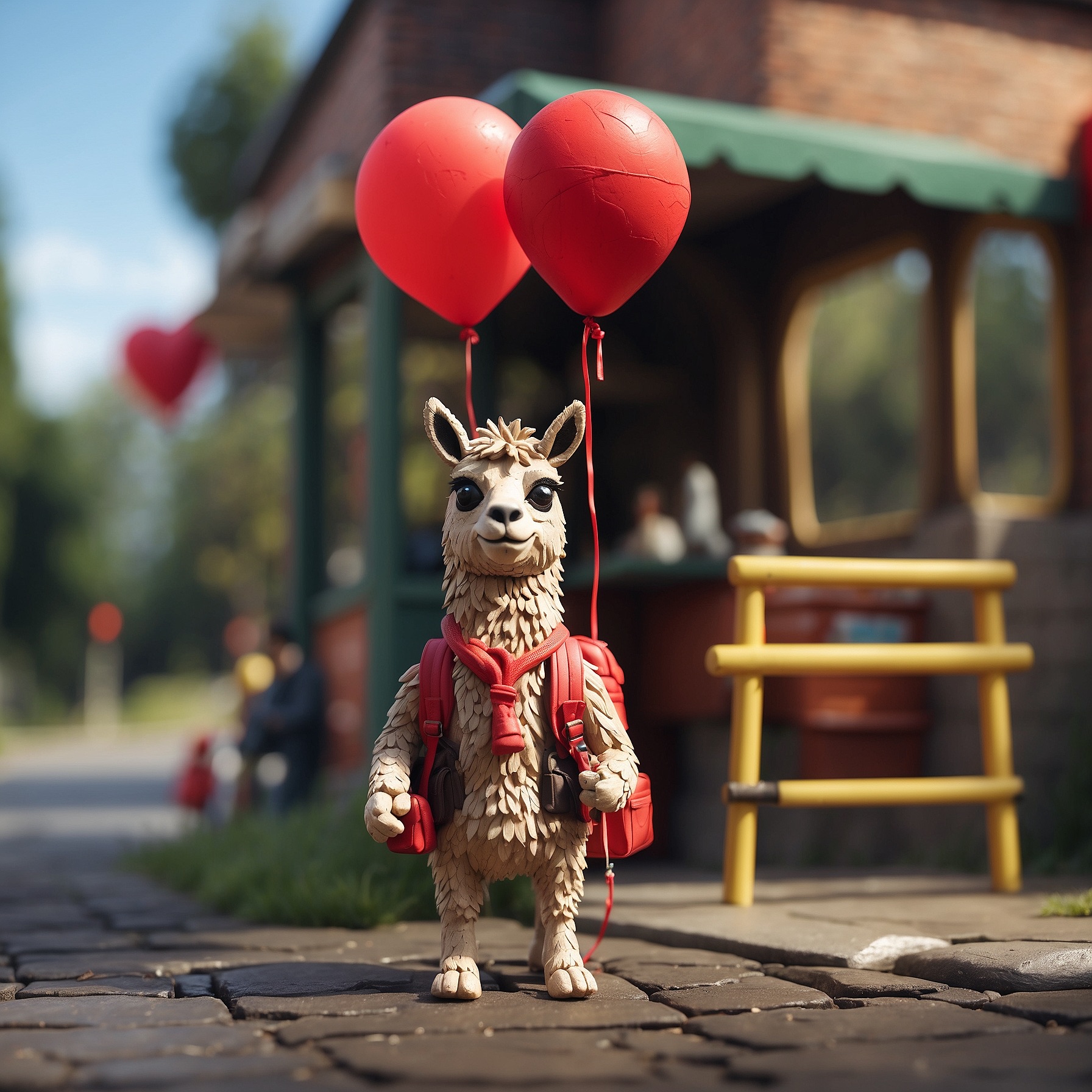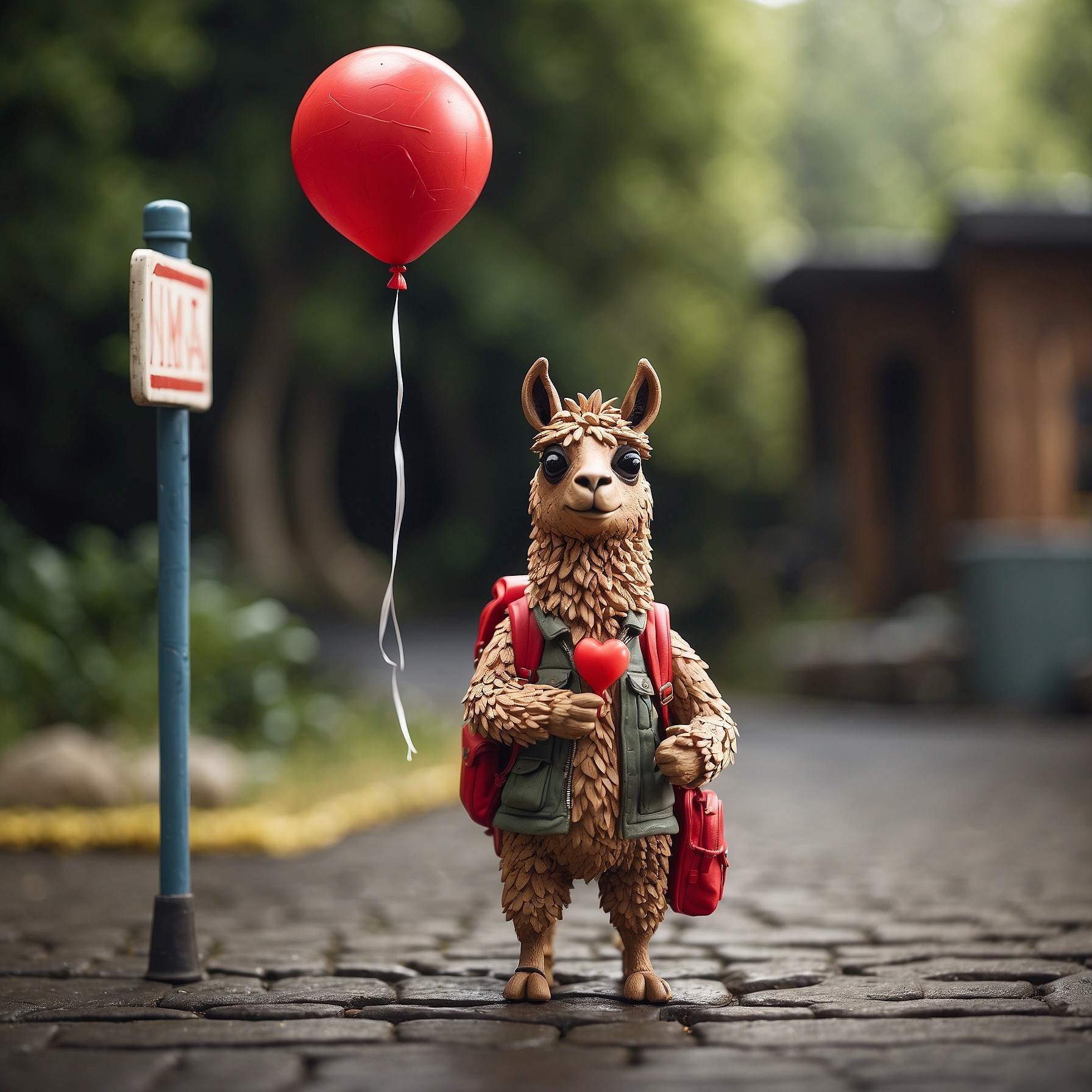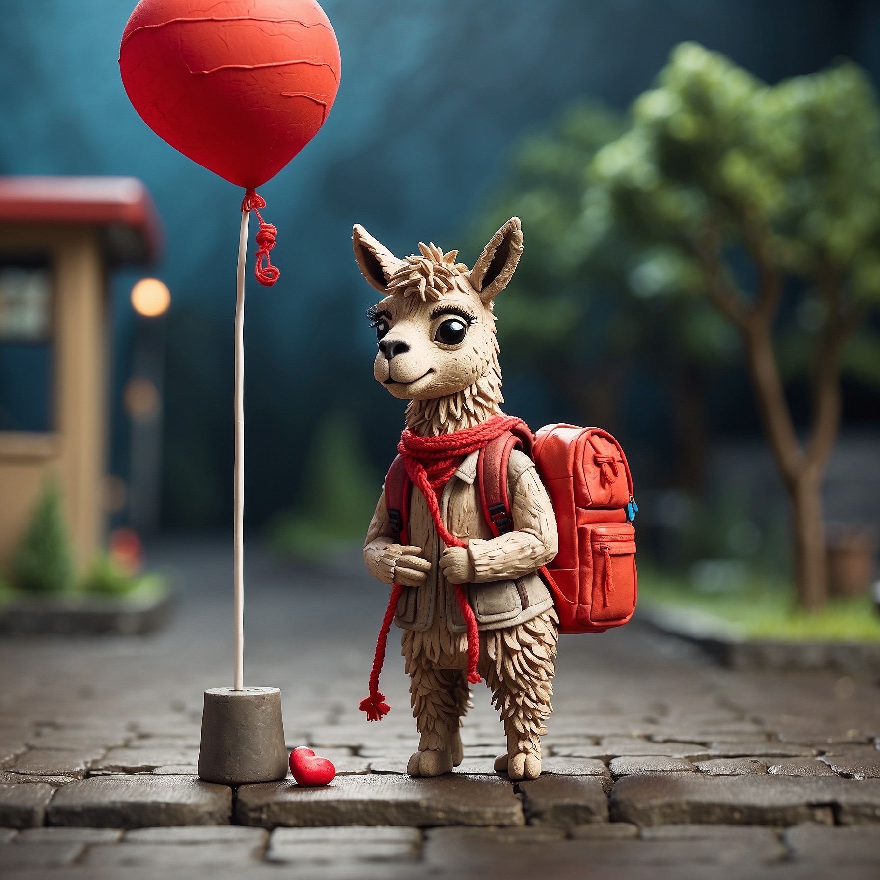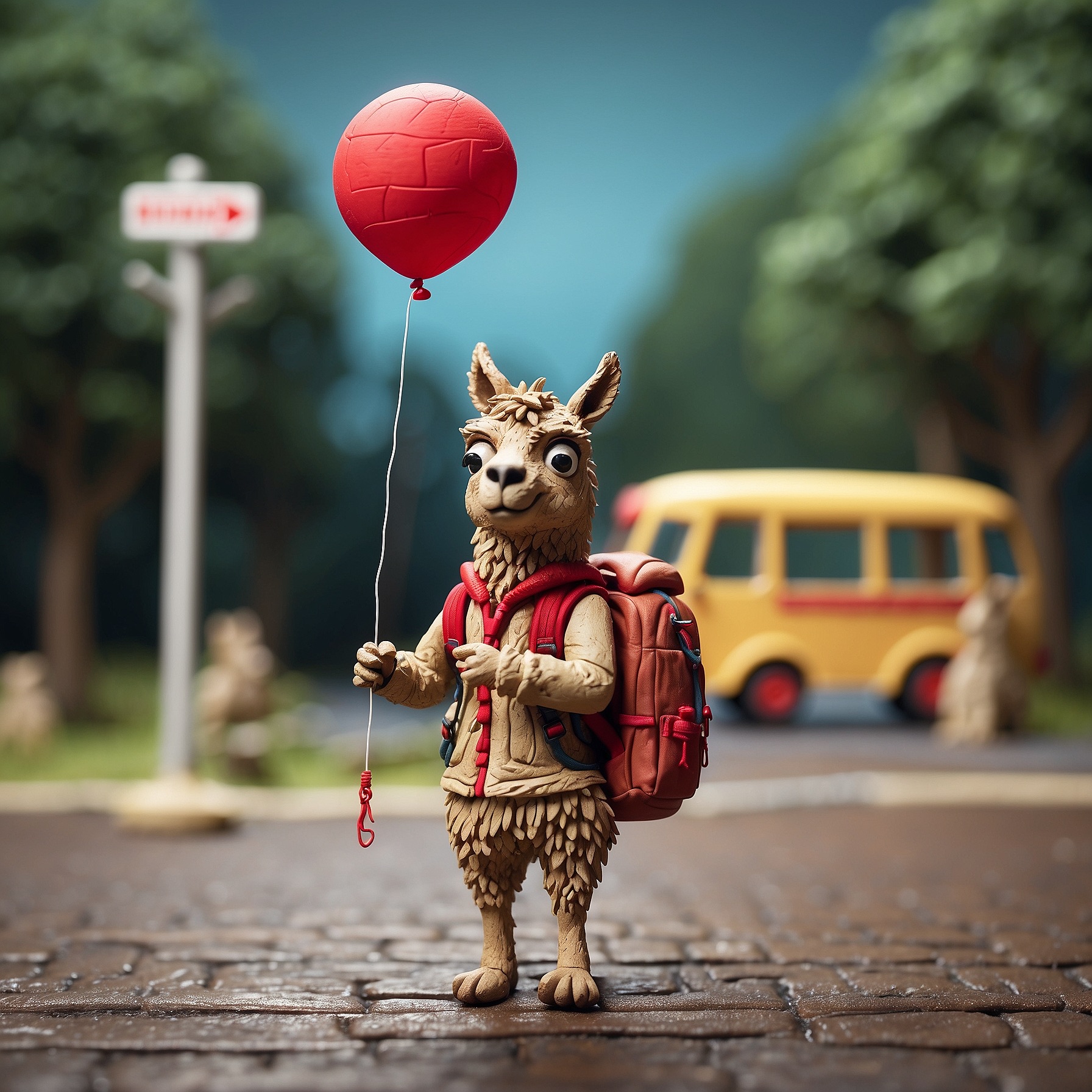 A tiny llama with a backpack waits at a toy-sized bus stop, holding a bright red balloon. The scene is crafted in clay, with chunky textures and soft, rounded shapes that feel handmade. Rendered in claymation stop-motion style with danger detail and dark
