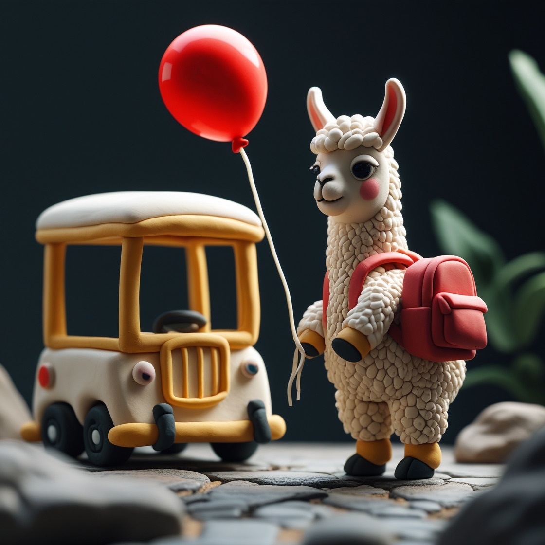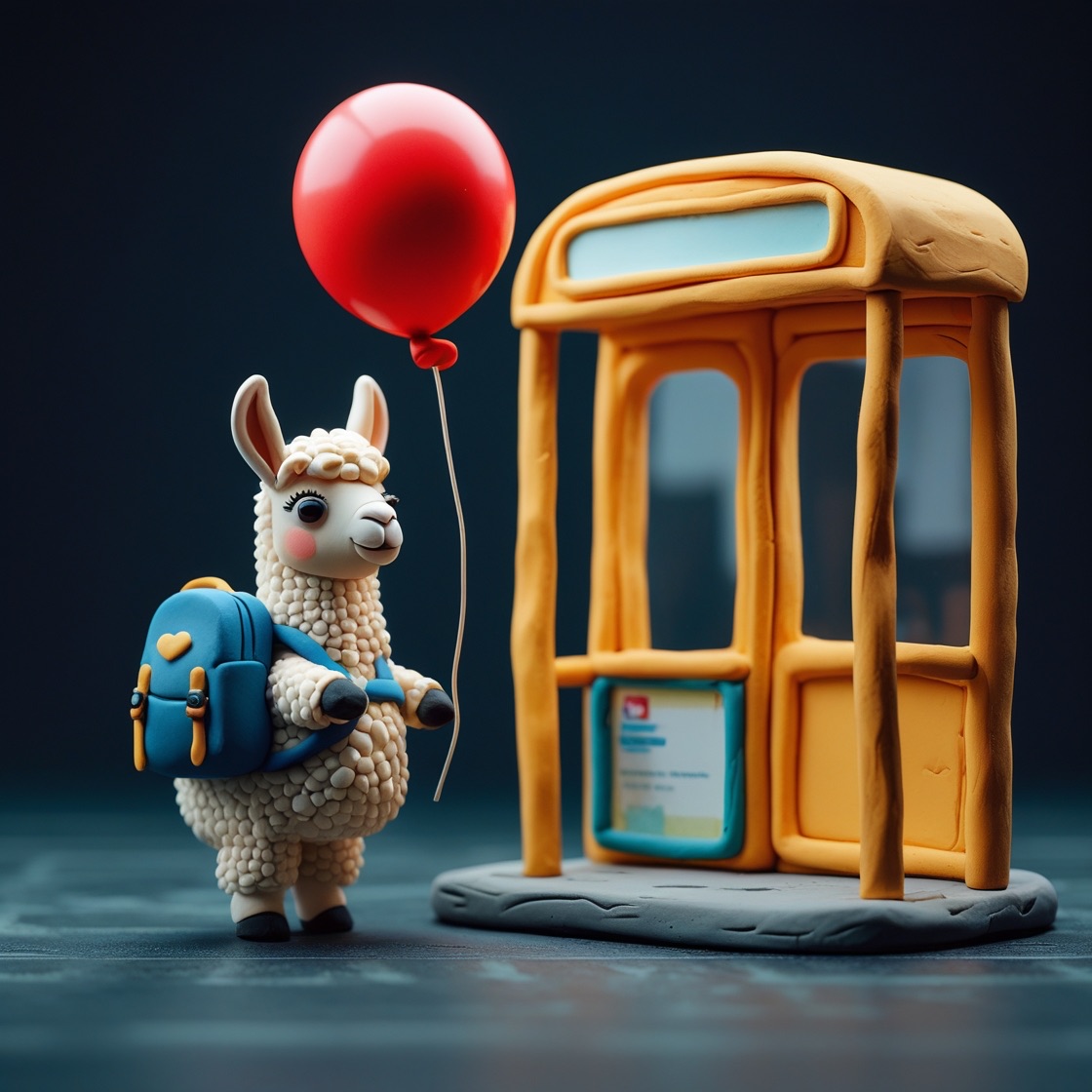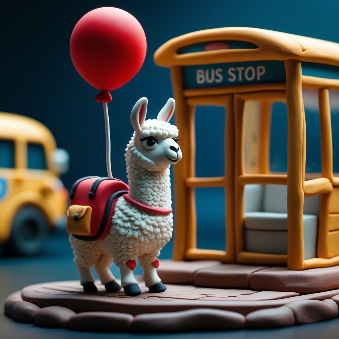 A tiny llama with a backpack waits at a toy-sized bus stop, holding a bright red balloon. The scene is crafted in clay, with chunky textures and soft, rounded shapes that feel handmade. Rendered in claymation stop-motion style with danger detail and dark