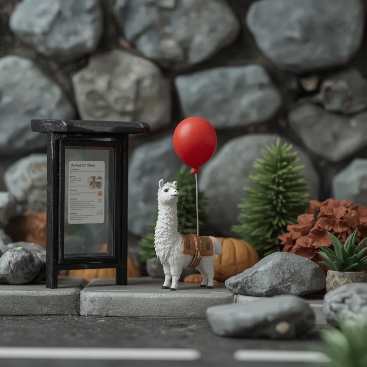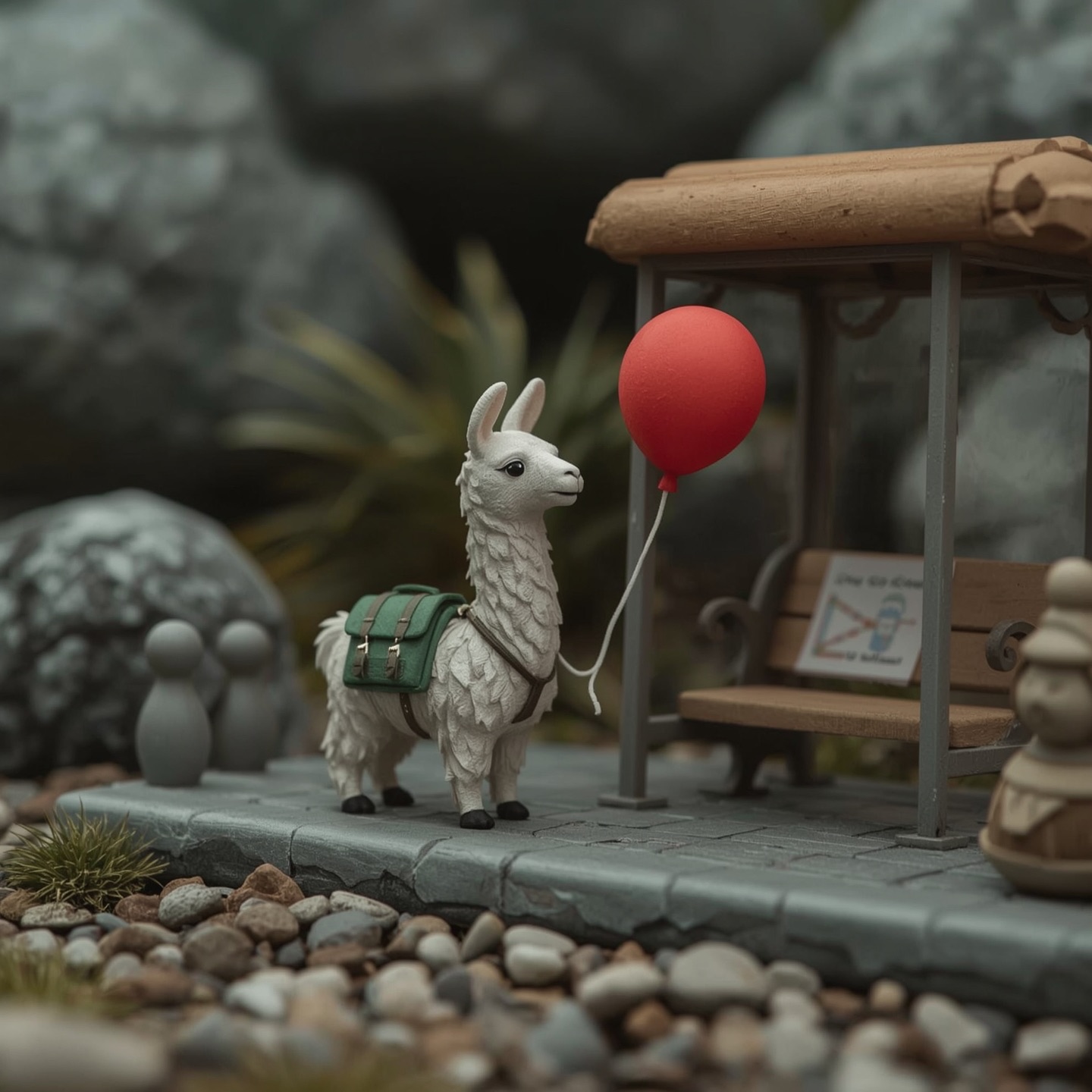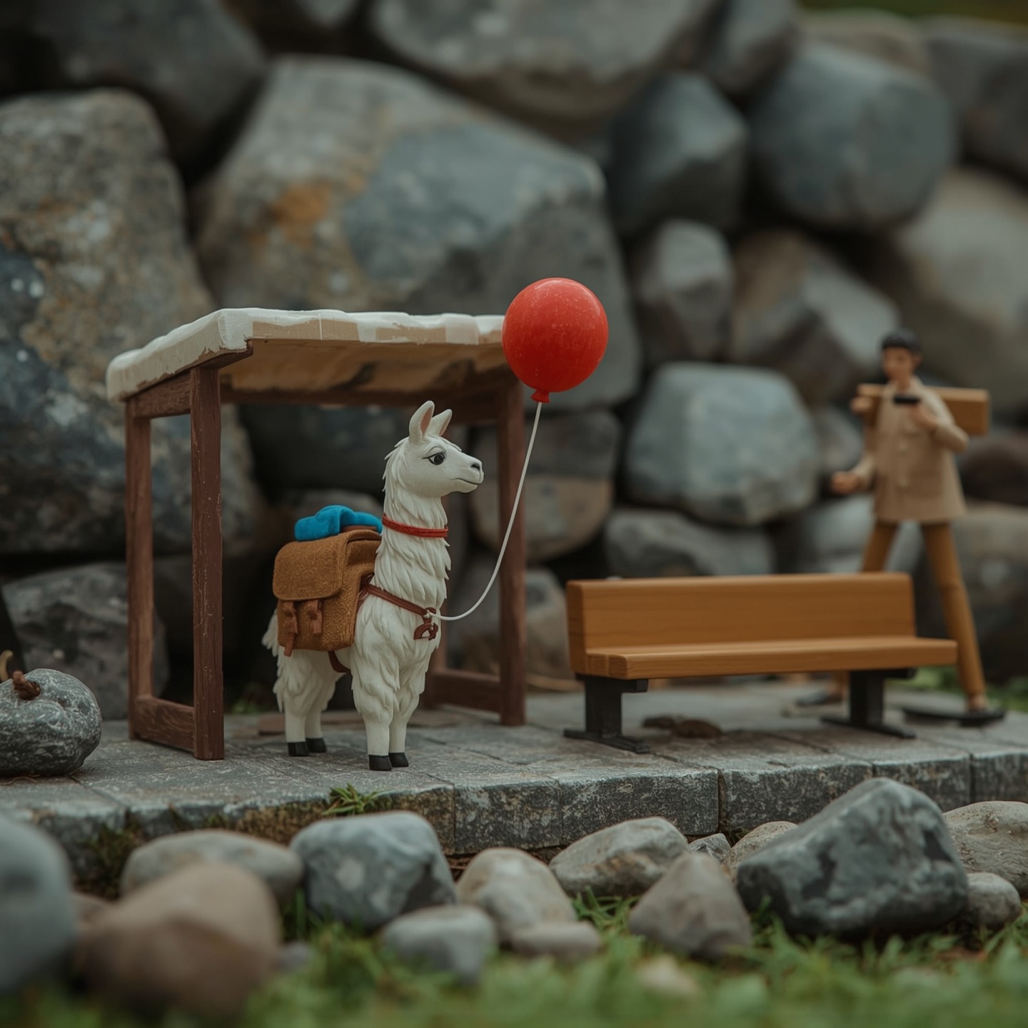 A tiny llama with a backpack waits at a toy-sized bus stop, holding a bright red balloon. The scene is crafted in clay, with chunky textures and soft, rounded shapes that feel handmade. Rendered in claymation stop-motion style with danger detail and dark