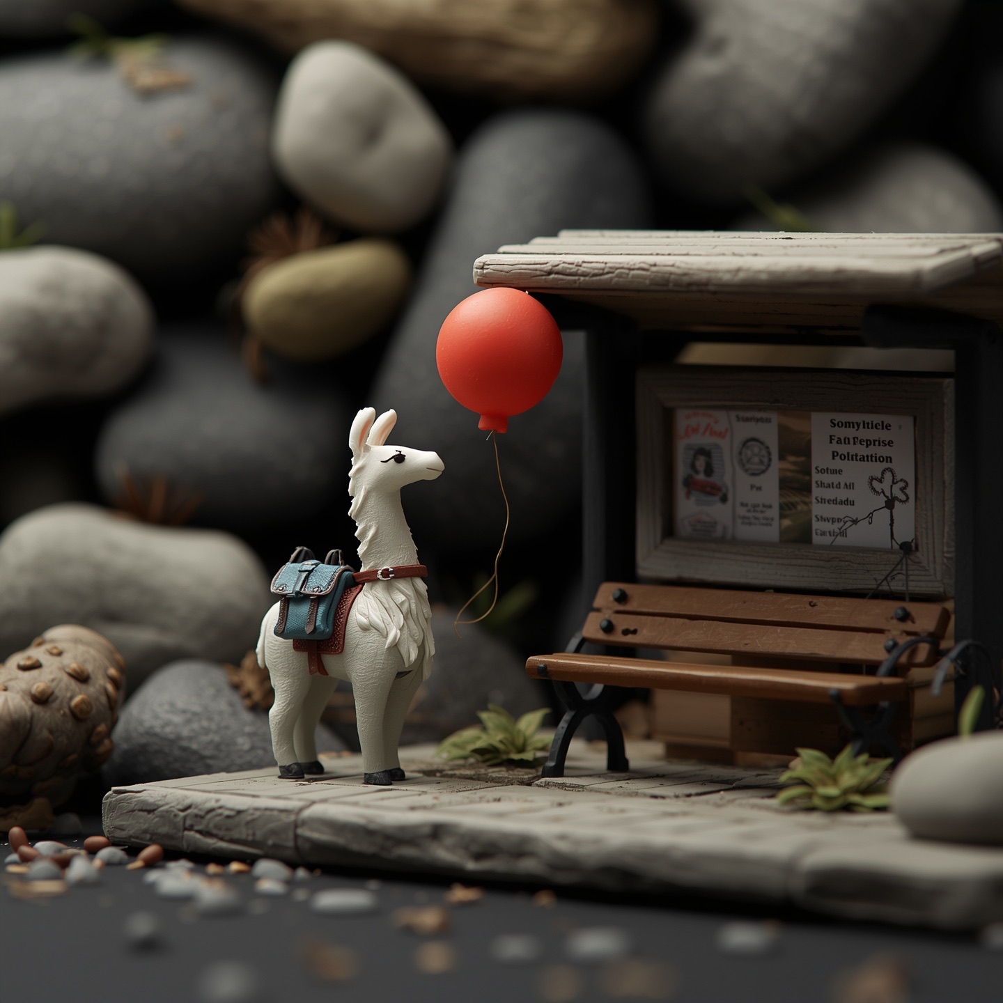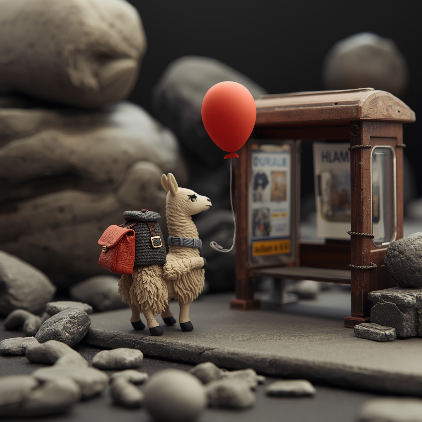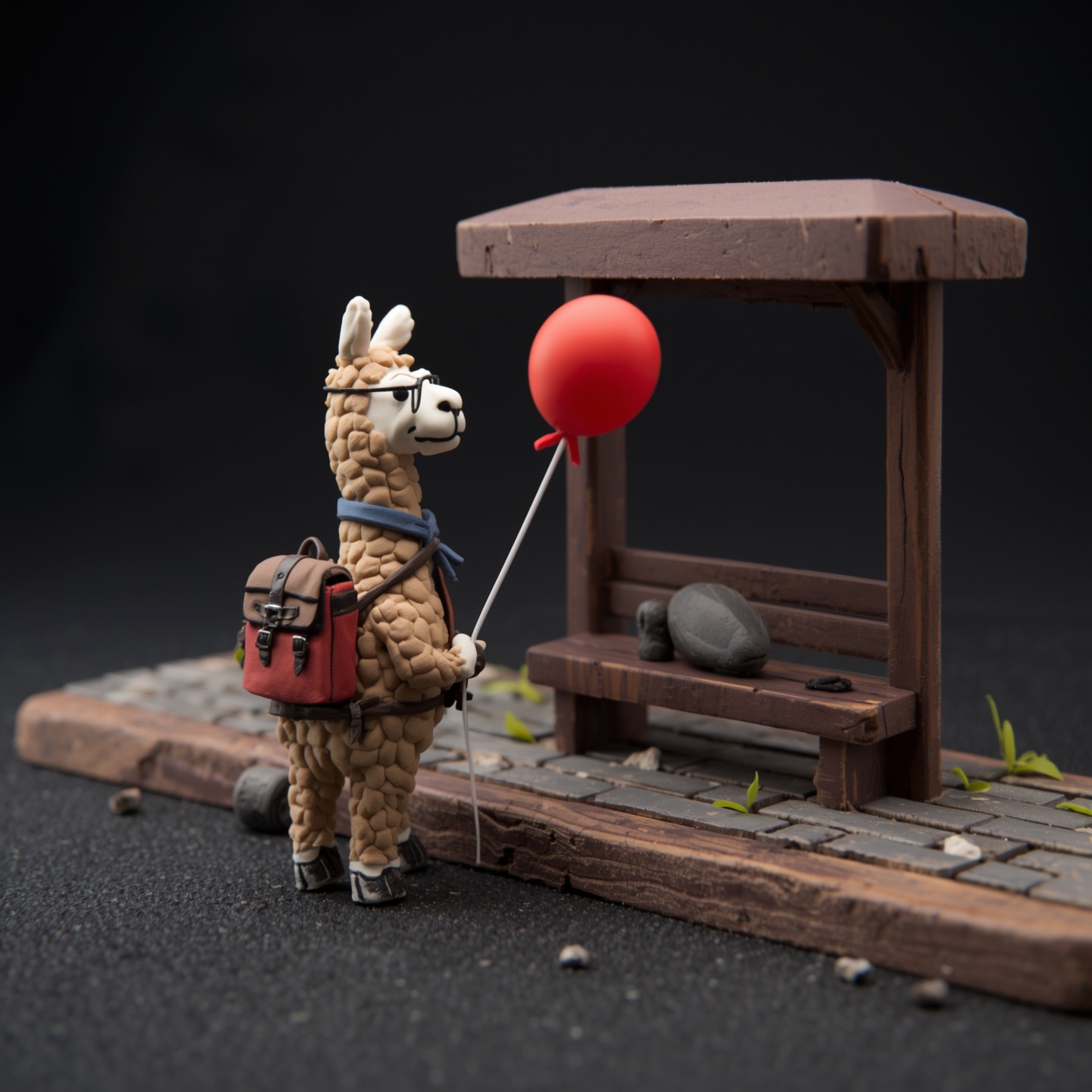 A tiny llama with a backpack waits at a toy-sized bus stop, holding a bright red balloon. The scene is crafted in clay, with chunky textures and soft, rounded shapes that feel handmade. Rendered in claymation stop-motion style with danger detail and dark