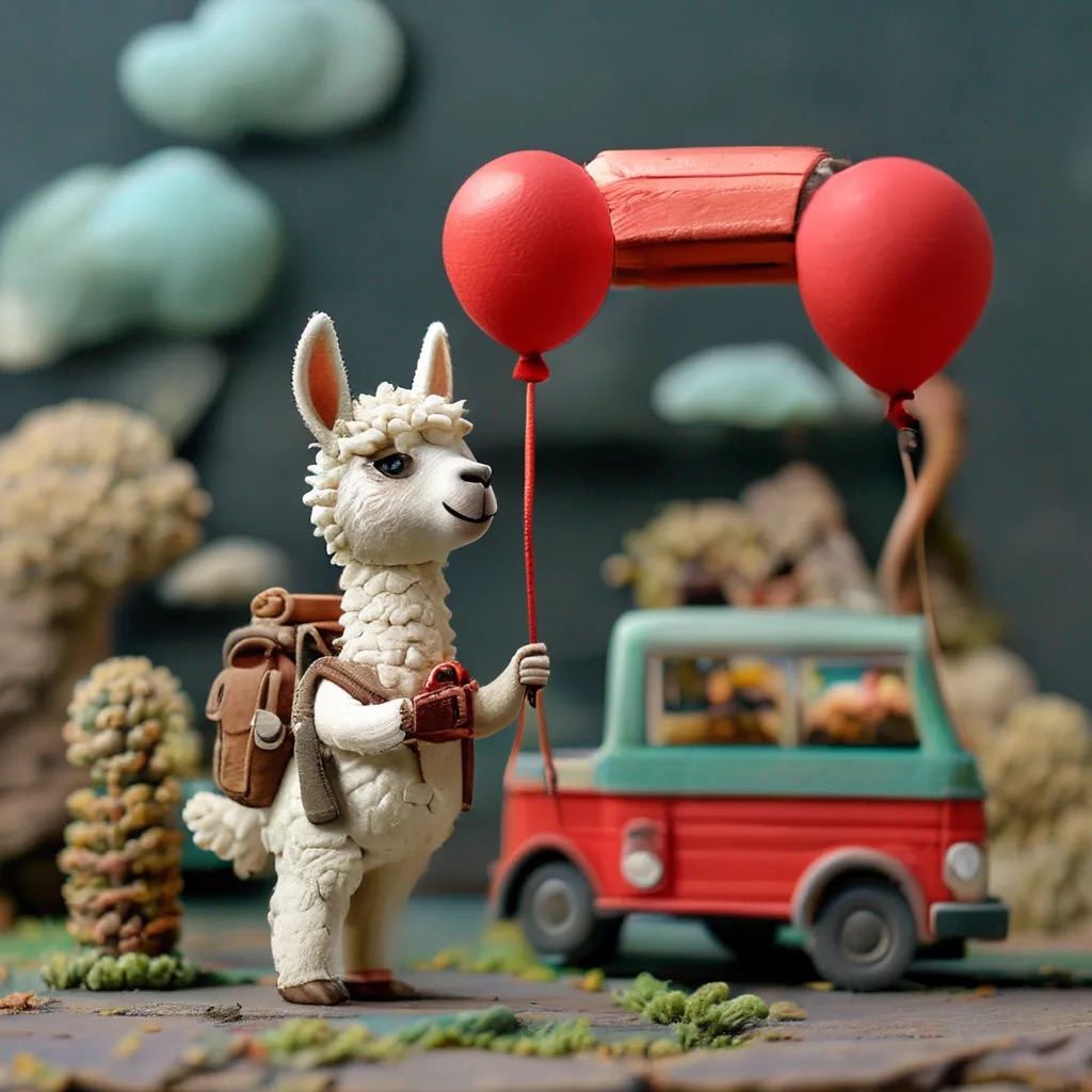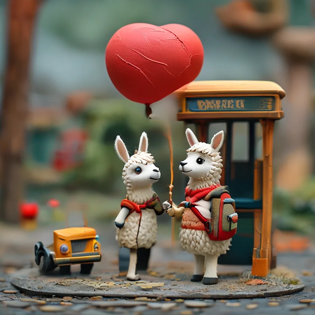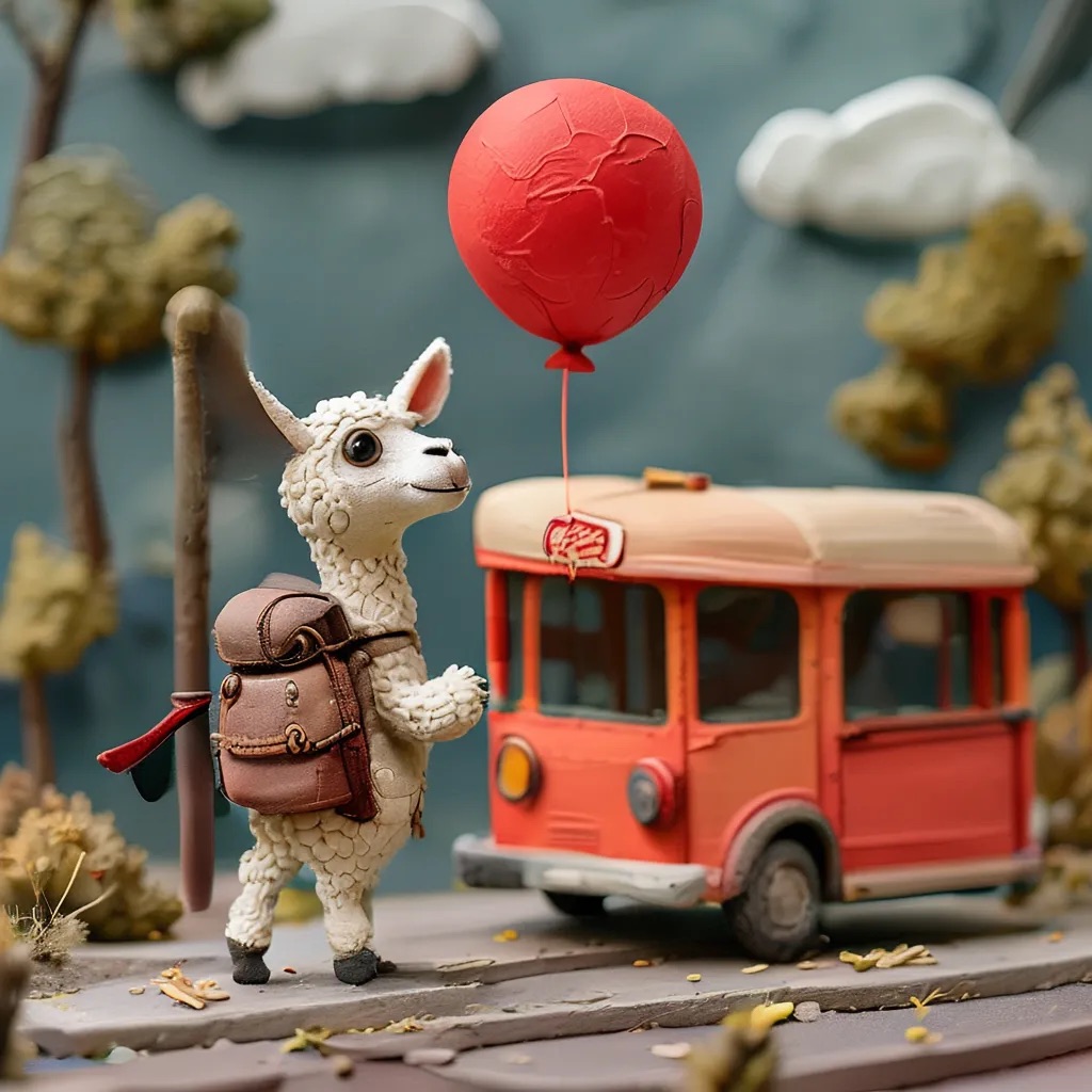 A tiny llama with a backpack waits at a toy-sized bus stop, holding a bright red balloon. The scene is crafted in clay, with chunky textures and soft, rounded shapes that feel handmade. Rendered in claymation stop-motion style with danger detail and dark