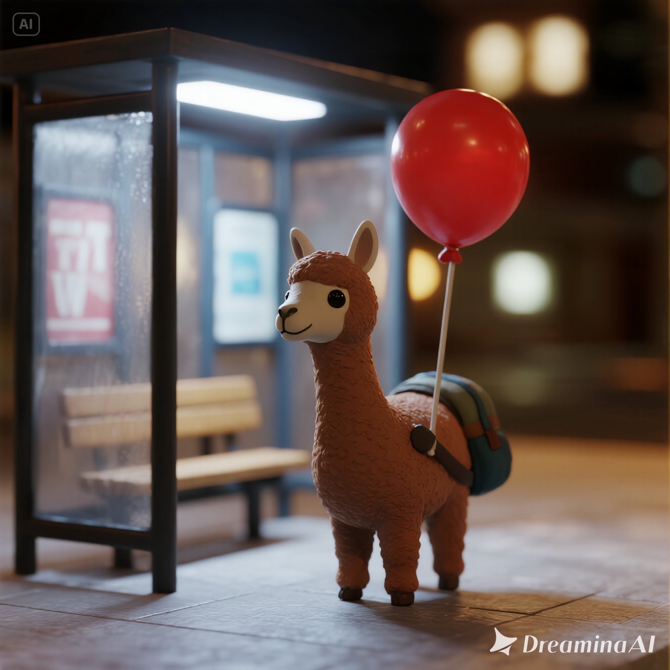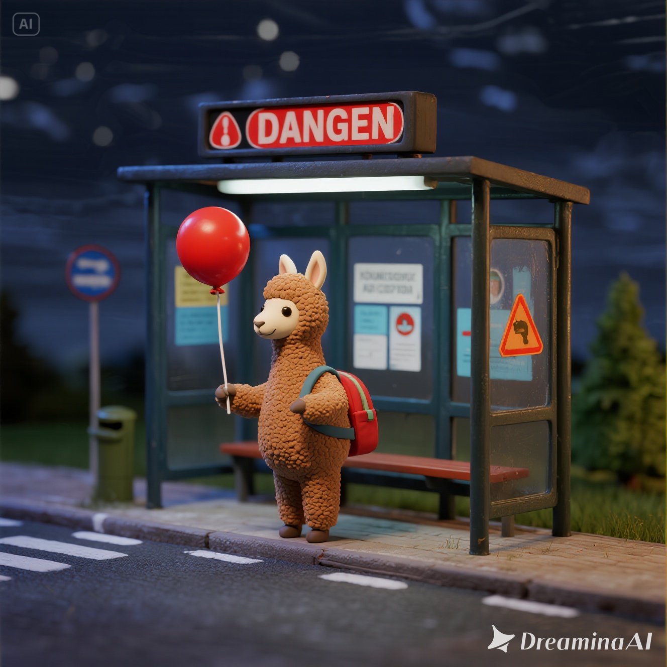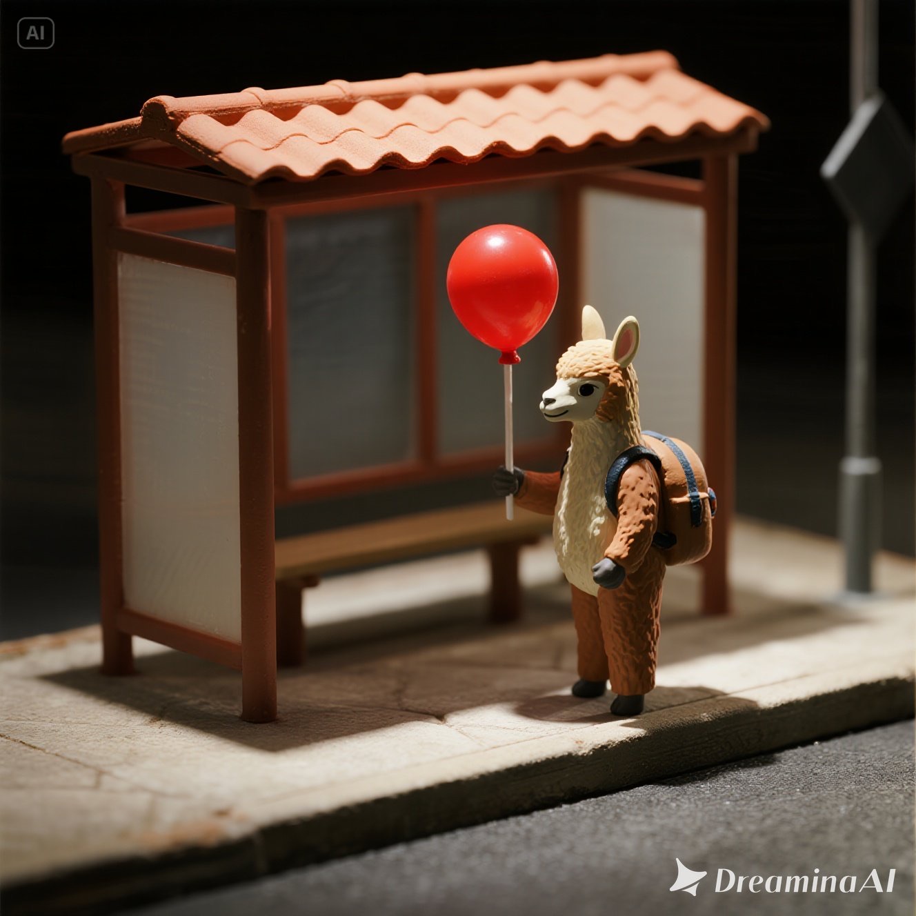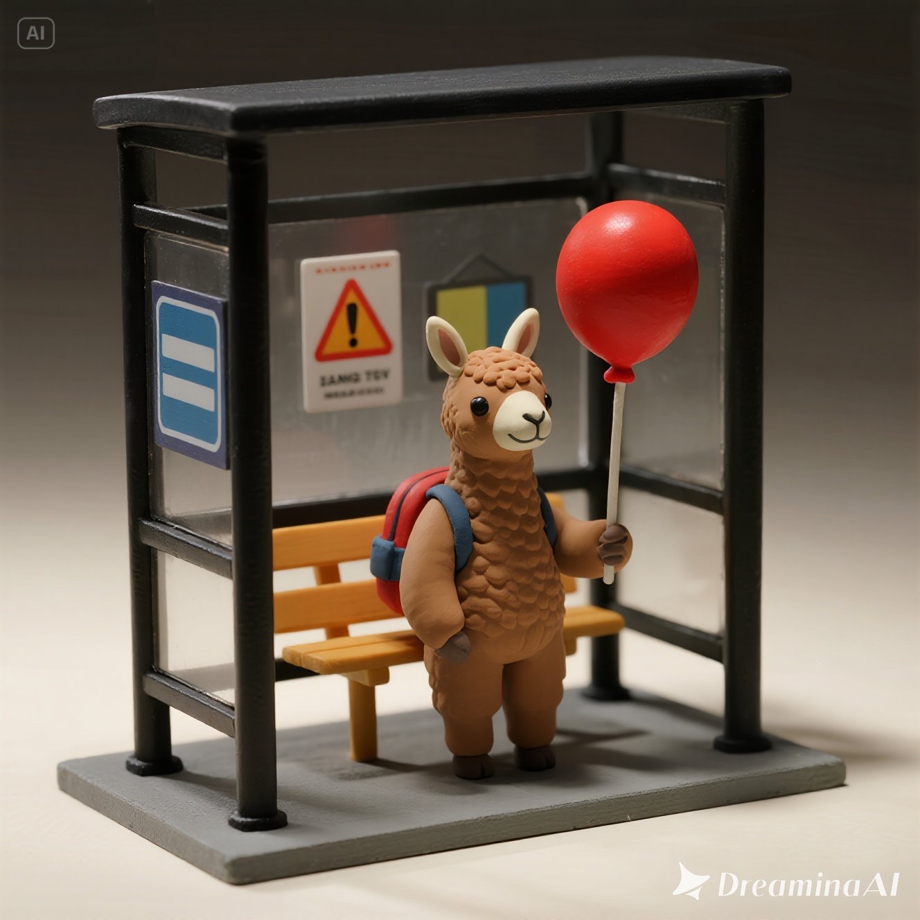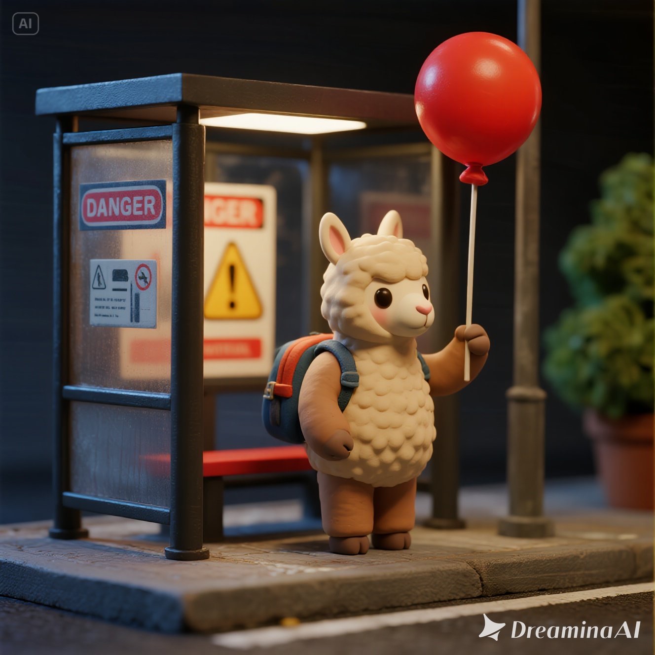 A tiny llama with a backpack waits at a toy-sized bus stop, holding a bright red balloon. The scene is crafted in clay, with chunky textures and soft, rounded shapes that feel handmade. Rendered in claymation stop-motion style with danger detail and dark