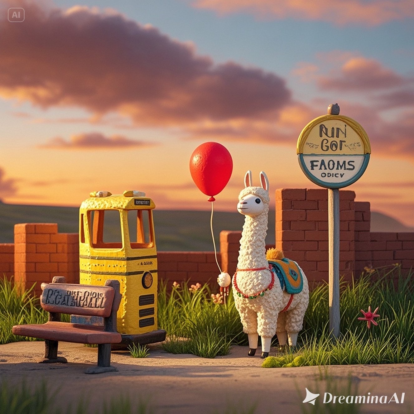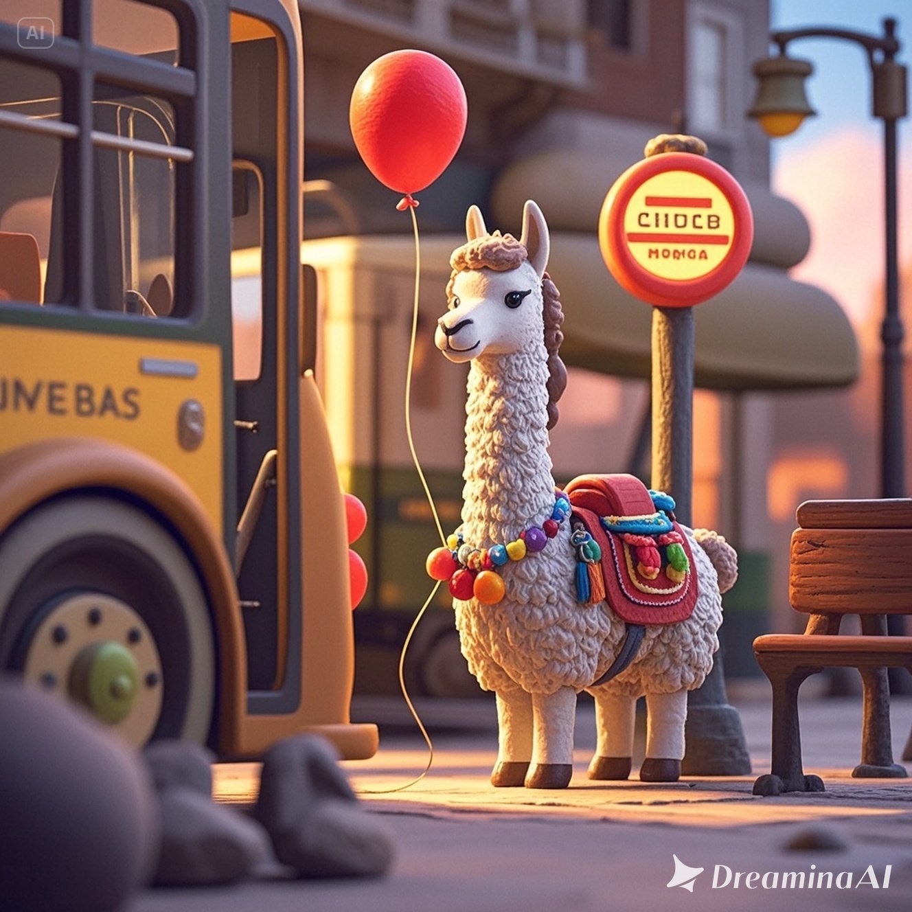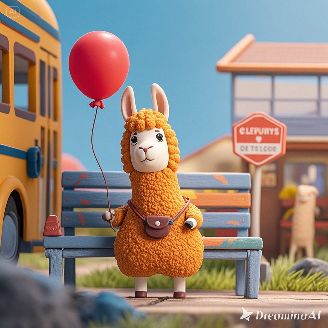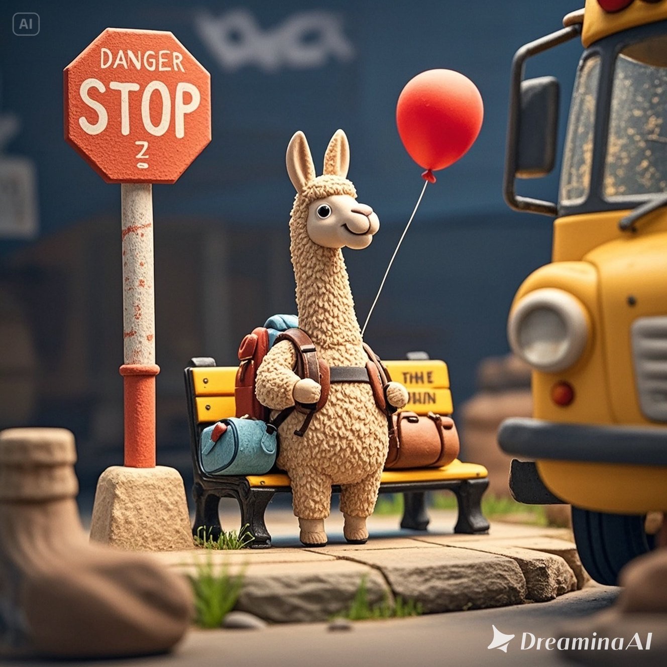 A tiny llama with a backpack waits at a toy-sized bus stop, holding a bright red balloon. The scene is crafted in clay, with chunky textures and soft, rounded shapes that feel handmade. Rendered in claymation stop-motion style with danger detail and dark