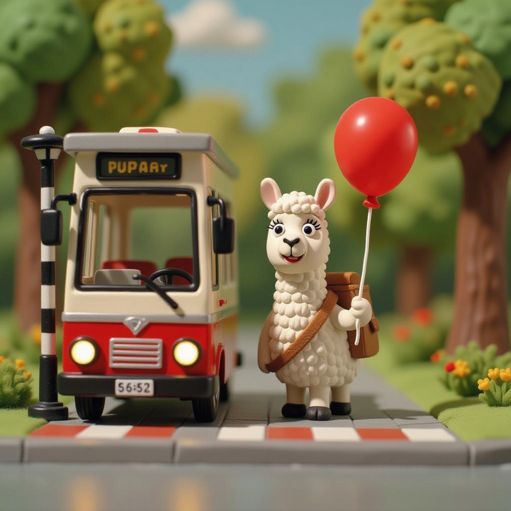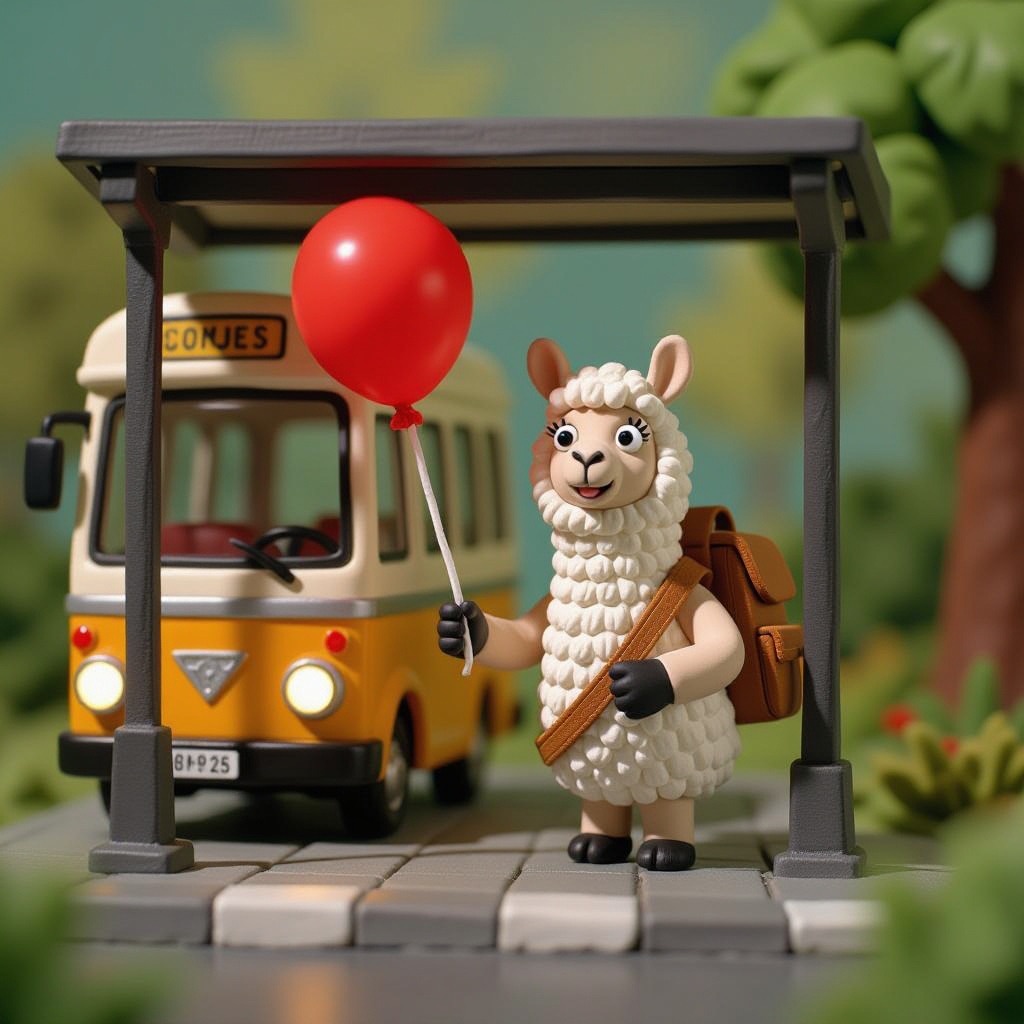 A tiny llama with a backpack waits at a toy-sized bus stop, holding a bright red balloon. The scene is crafted in clay, with chunky textures and soft, rounded shapes that feel handmade. Rendered in claymation stop-motion style with danger detail and dark