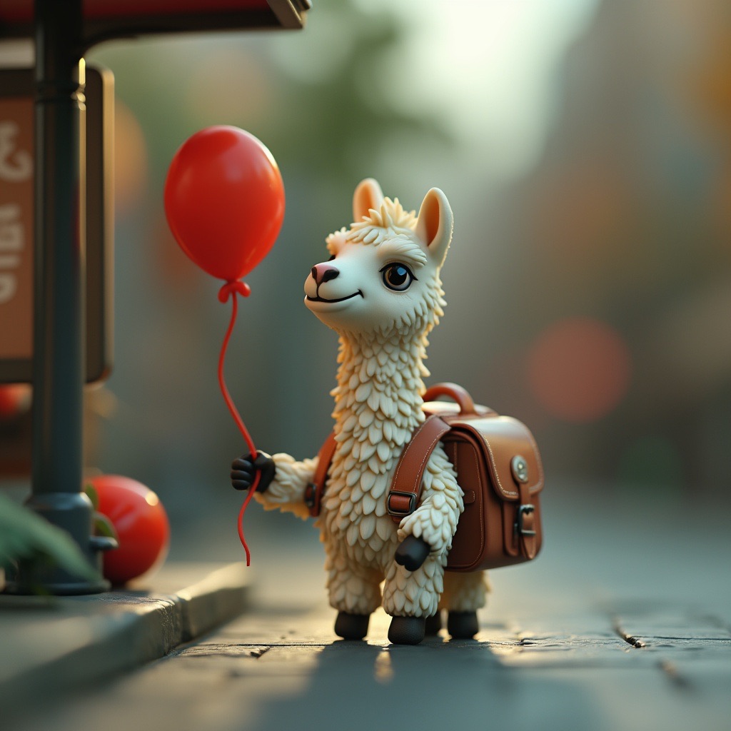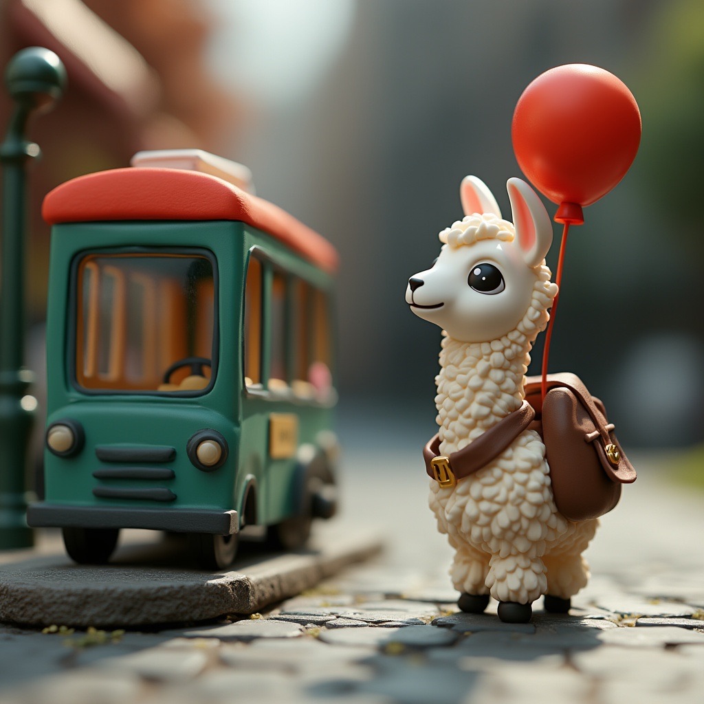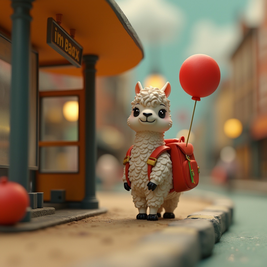A tiny llama with a backpack waits at a toy-sized bus stop, holding a bright red balloon. The scene is crafted in clay, with chunky textures and soft, rounded shapes that feel handmade. Rendered in claymation stop-motion style with danger detail and dark