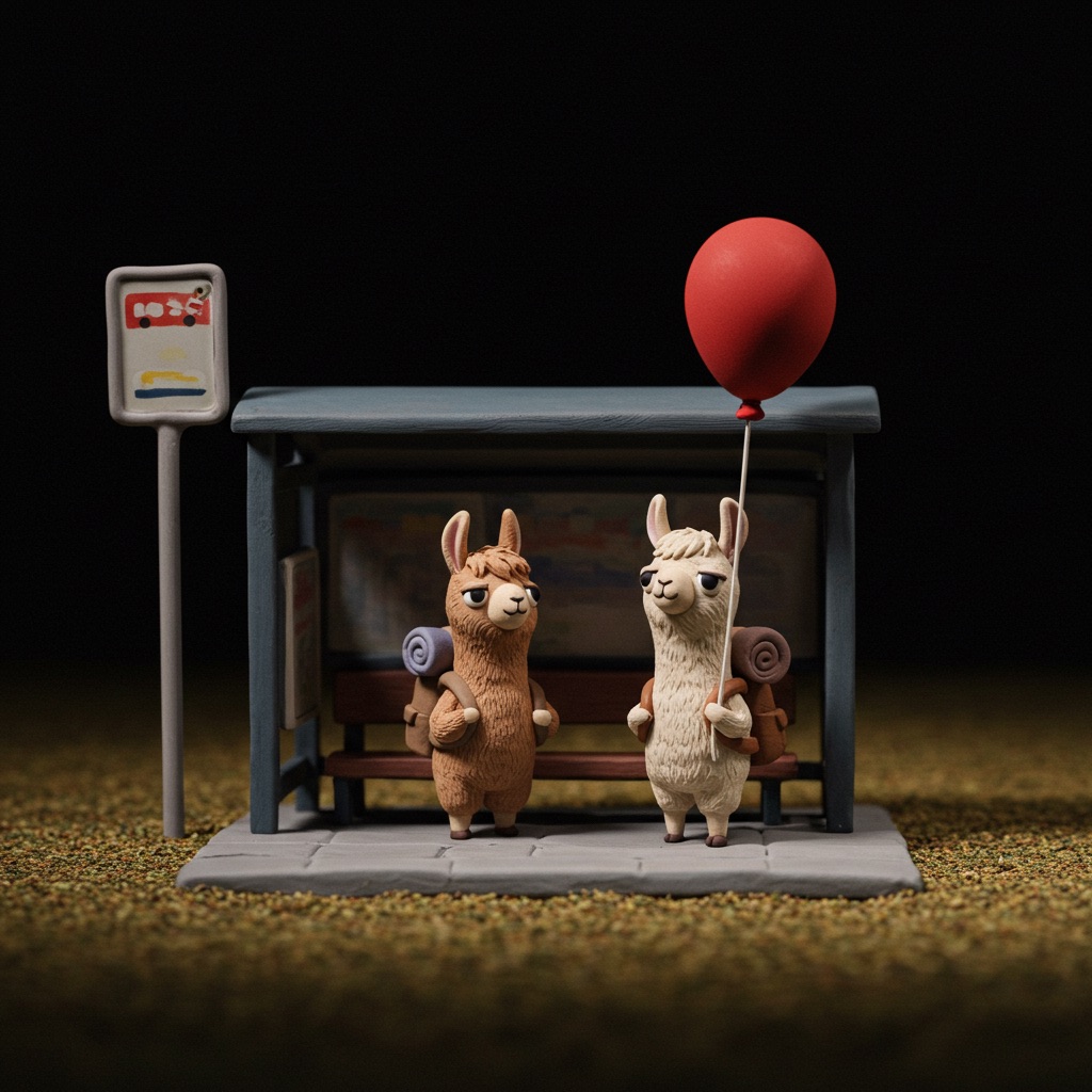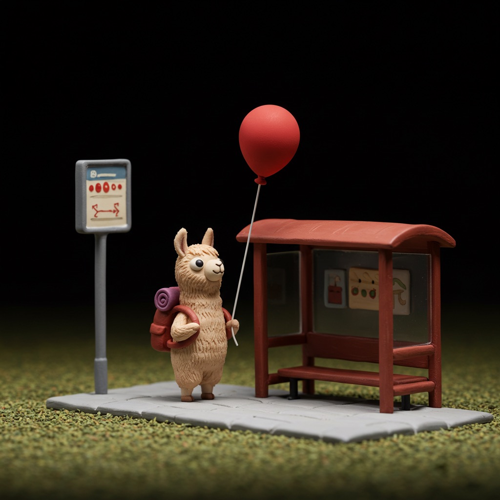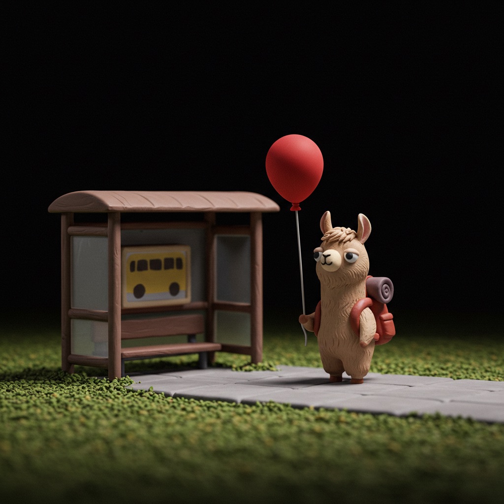 A tiny llama with a backpack waits at a toy-sized bus stop, holding a bright red balloon. The scene is crafted in clay, with chunky textures and soft, rounded shapes that feel handmade. Rendered in claymation stop-motion style with danger detail and dark