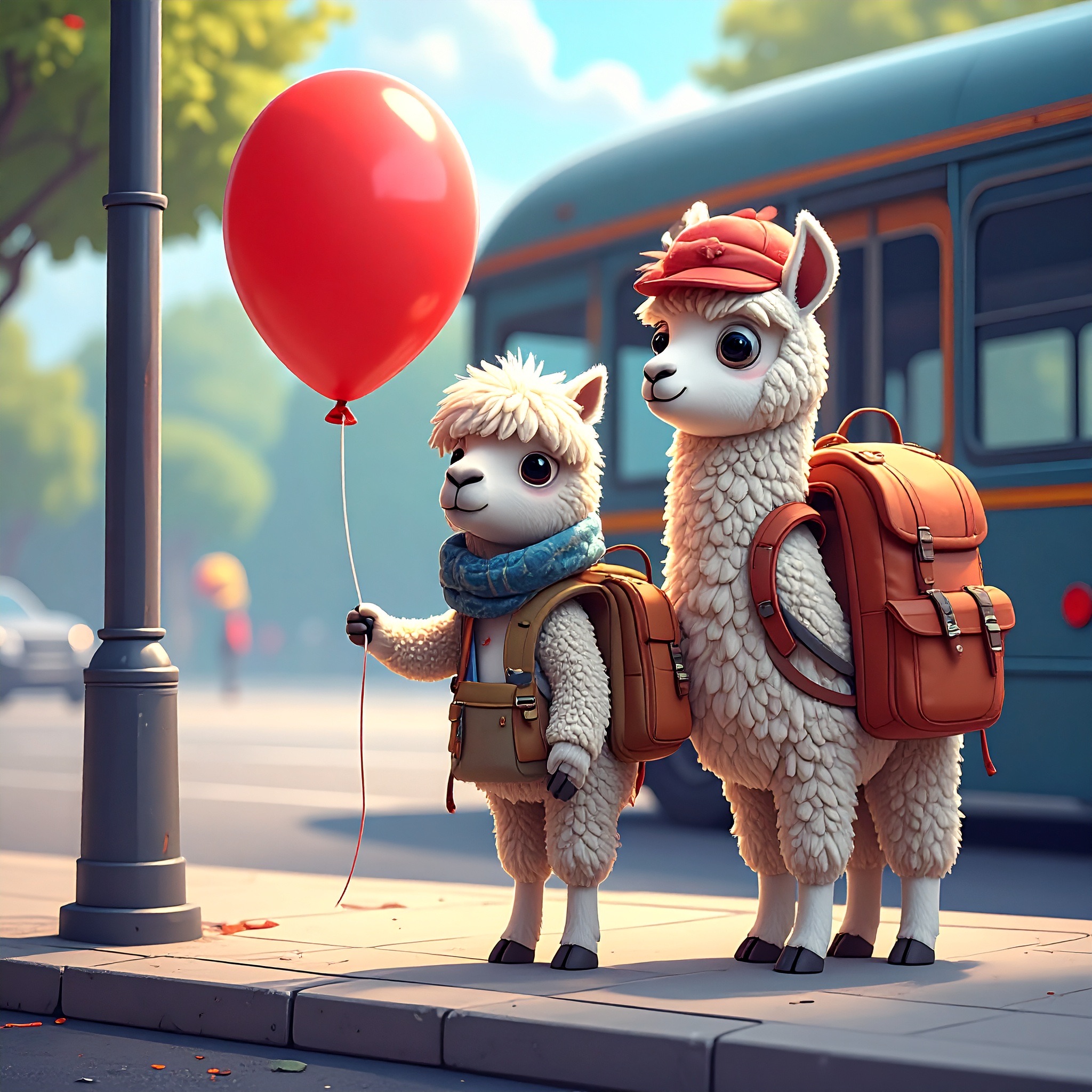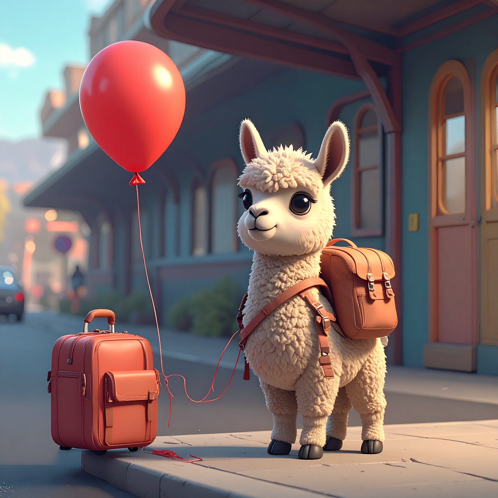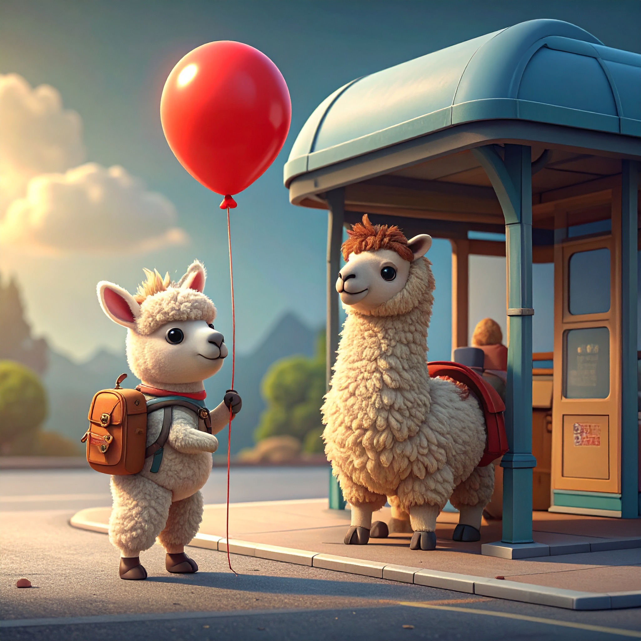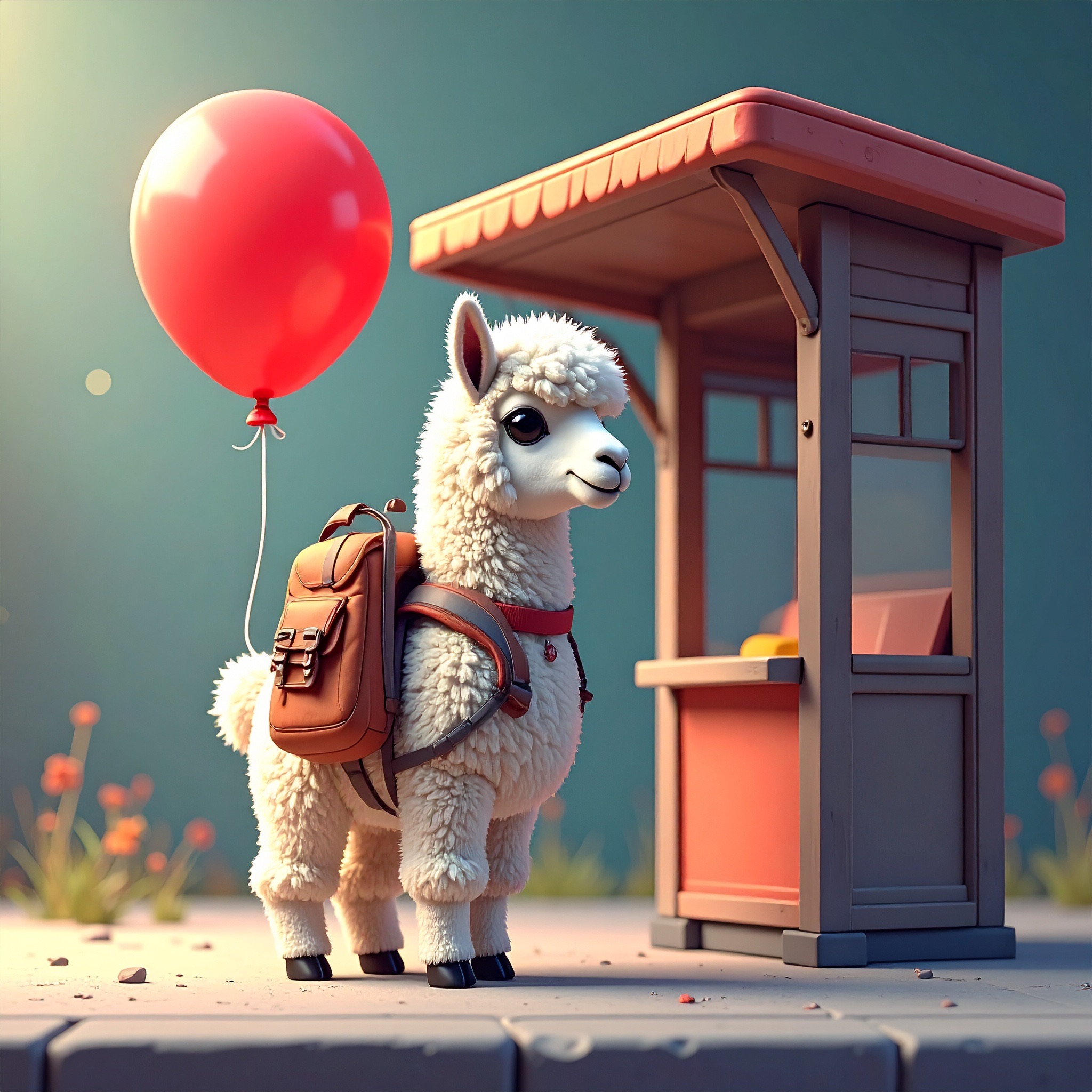 A tiny llama with a backpack waits at a toy-sized bus stop, holding a bright red balloon. The scene is crafted in clay, with chunky textures and soft, rounded shapes that feel handmade. Rendered in claymation stop-motion style with danger detail and dark
