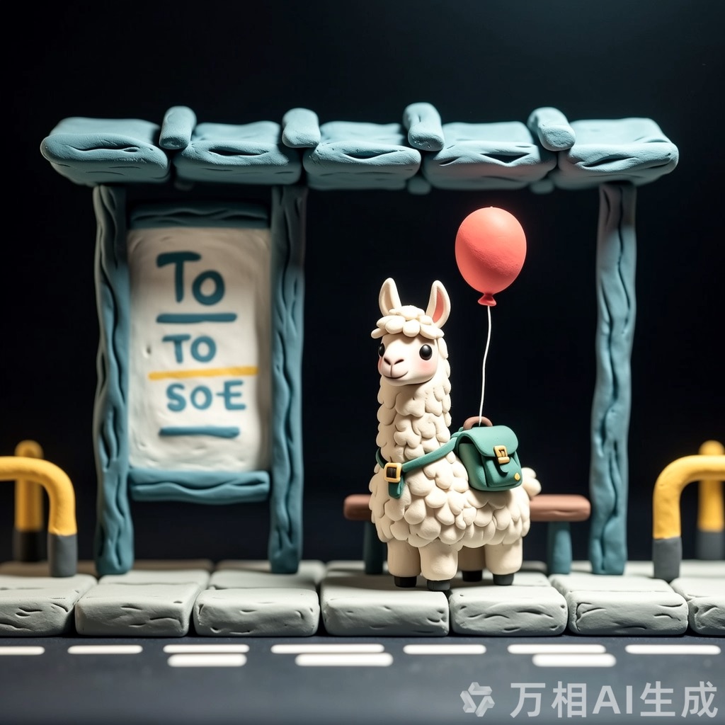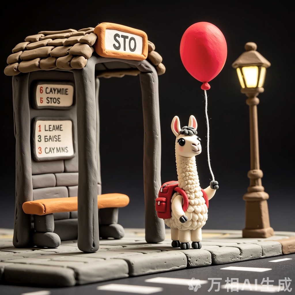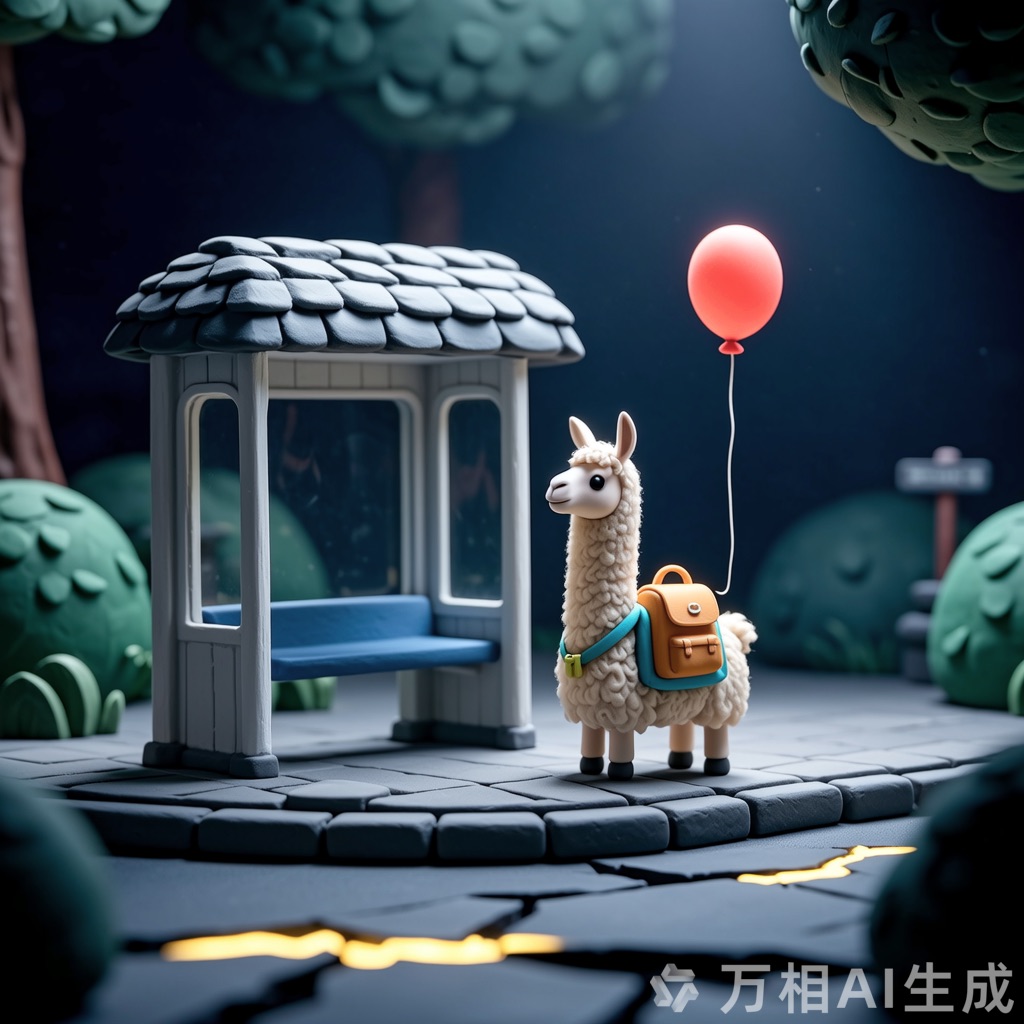 A tiny llama with a backpack waits at a toy-sized bus stop, holding a bright red balloon. The scene is crafted in clay, with chunky textures and soft, rounded shapes that feel handmade. Rendered in claymation stop-motion style with danger detail and dark