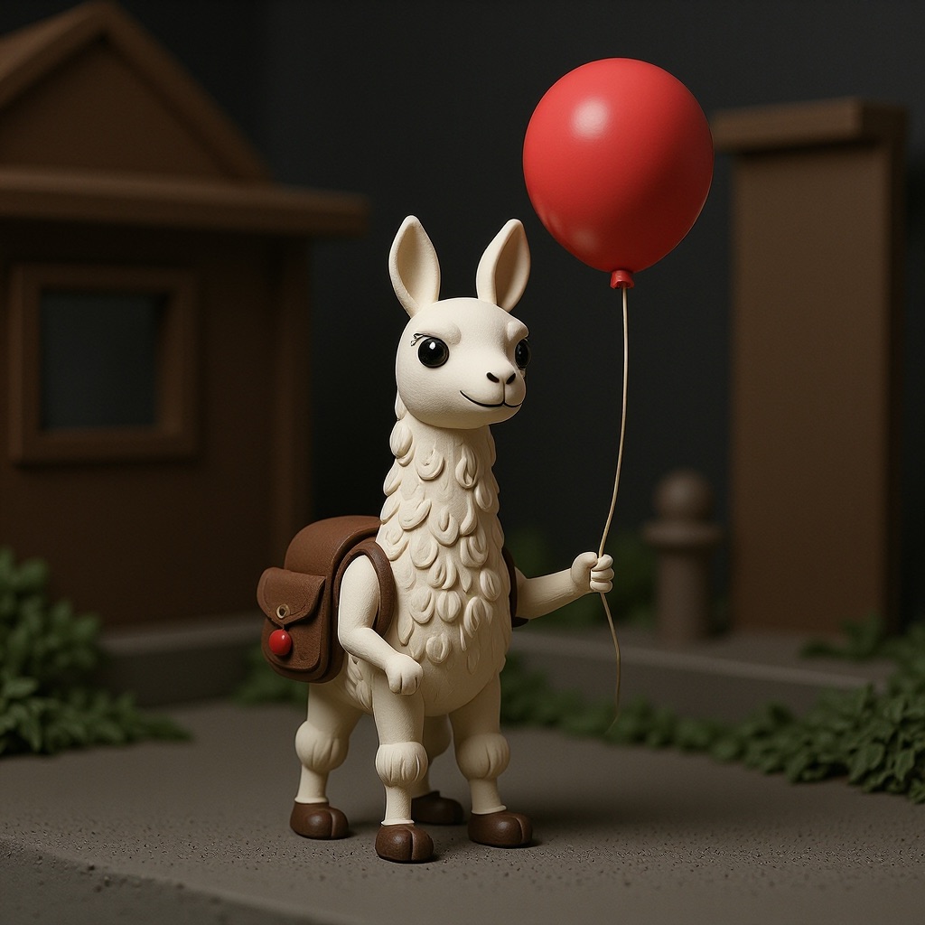 A tiny llama with a backpack waits at a toy-sized bus stop, holding a bright red balloon. The scene is crafted in clay, with chunky textures and soft, rounded shapes that feel handmade. Rendered in claymation stop-motion style with danger detail and dark