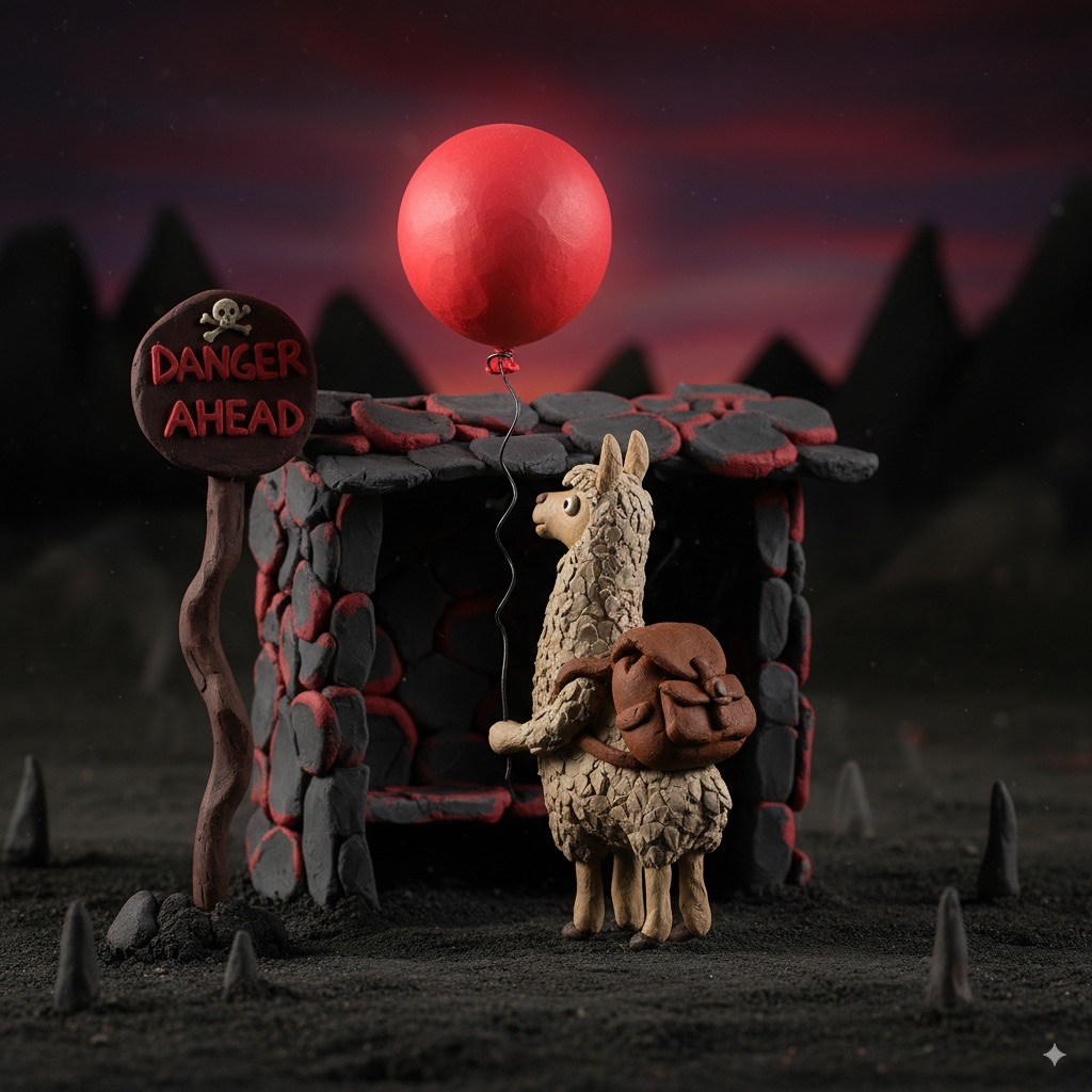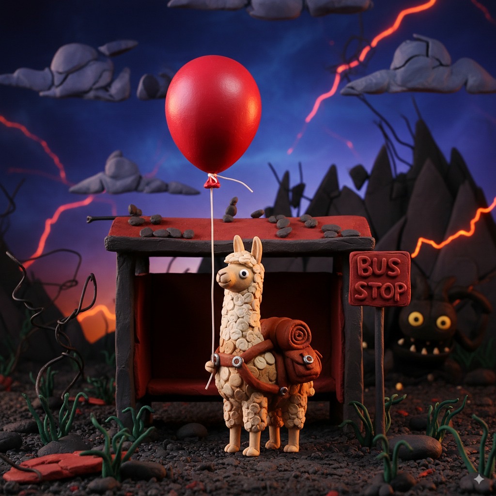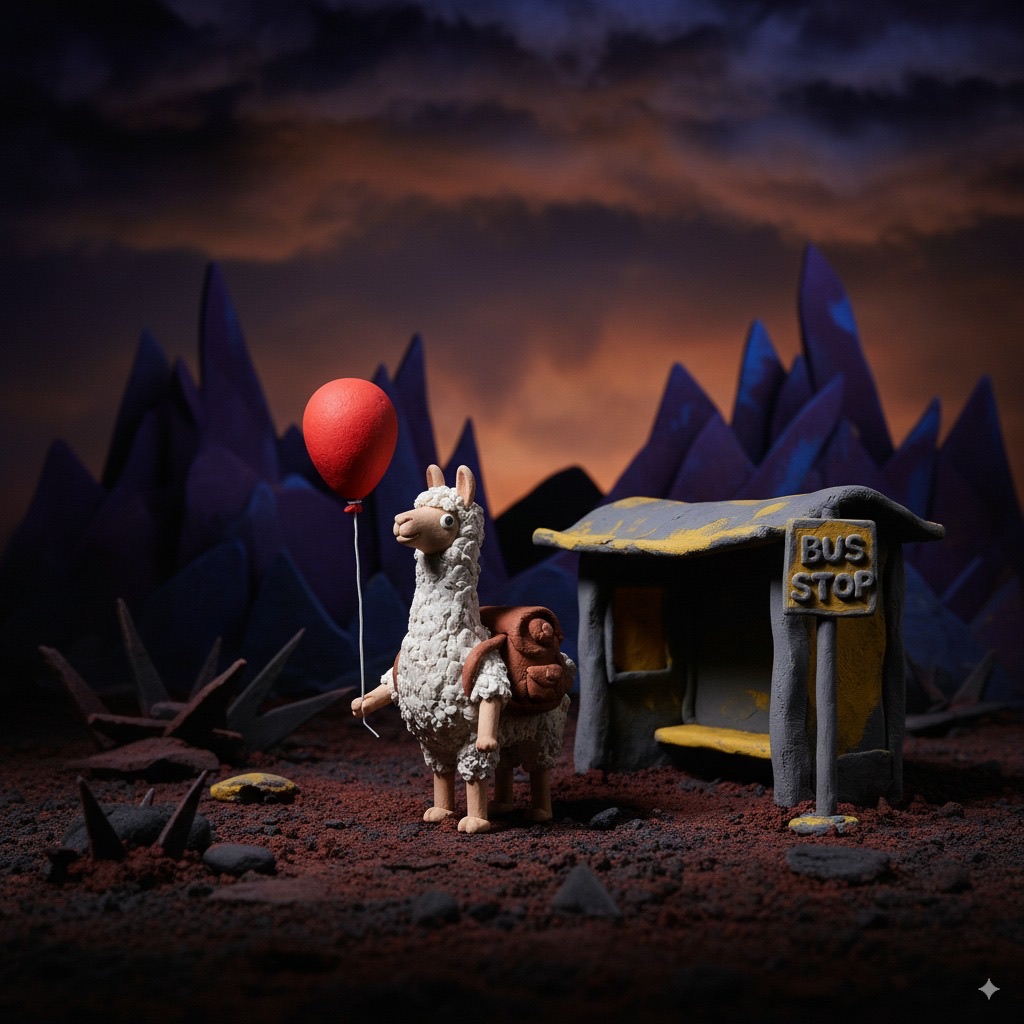A tiny llama with a backpack waits at a toy-sized bus stop, holding a bright red balloon. The scene is crafted in clay, with chunky textures and soft, rounded shapes that feel handmade. Rendered in claymation stop-motion style with danger detail and dark