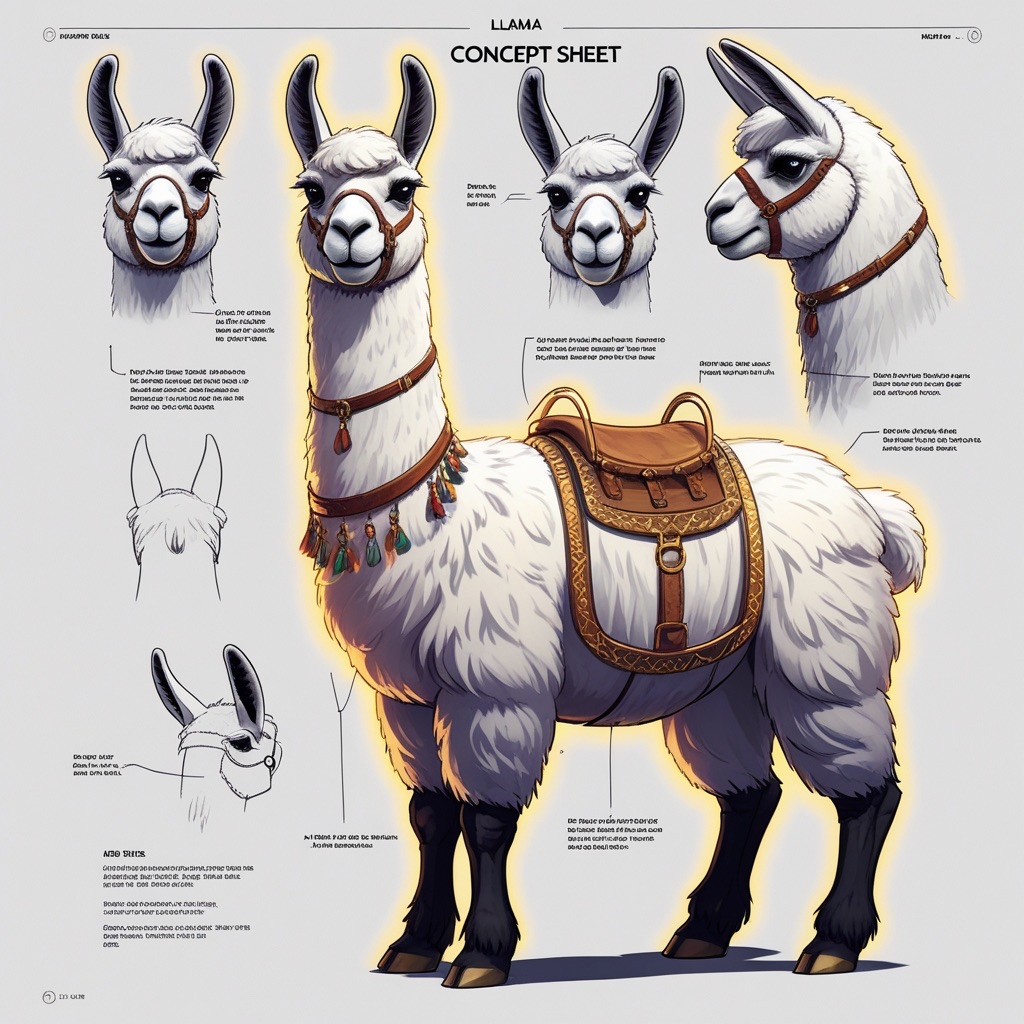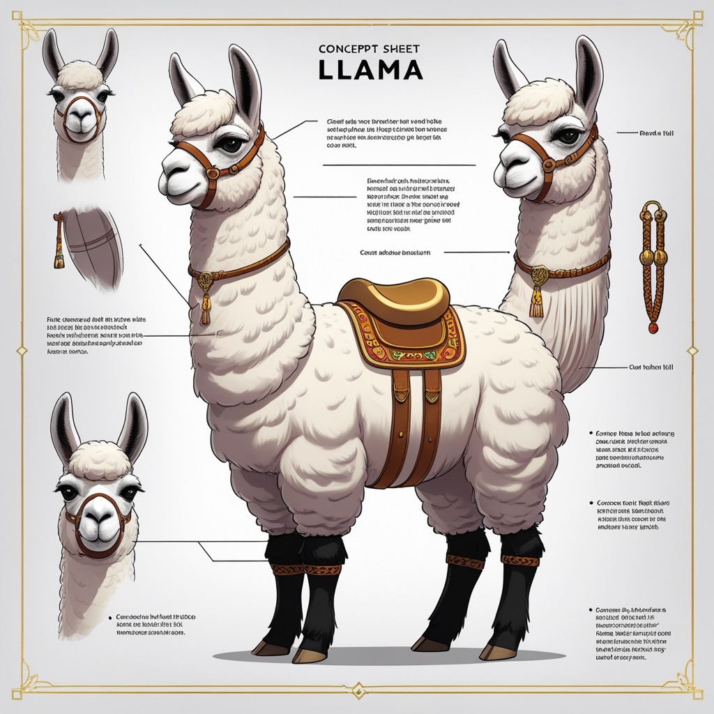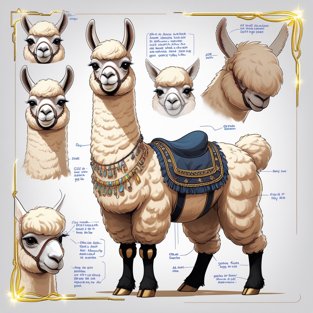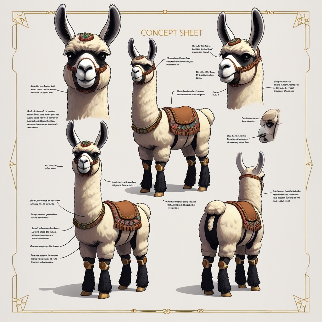 A concept sheet for a llama, detailed with front, back, and side views, including close-up sketches of facial features and accessories, annotated with design notes and labeled components, drawn in blueprint style with glowing trim in gold and base structure in black, presented on a clean white background