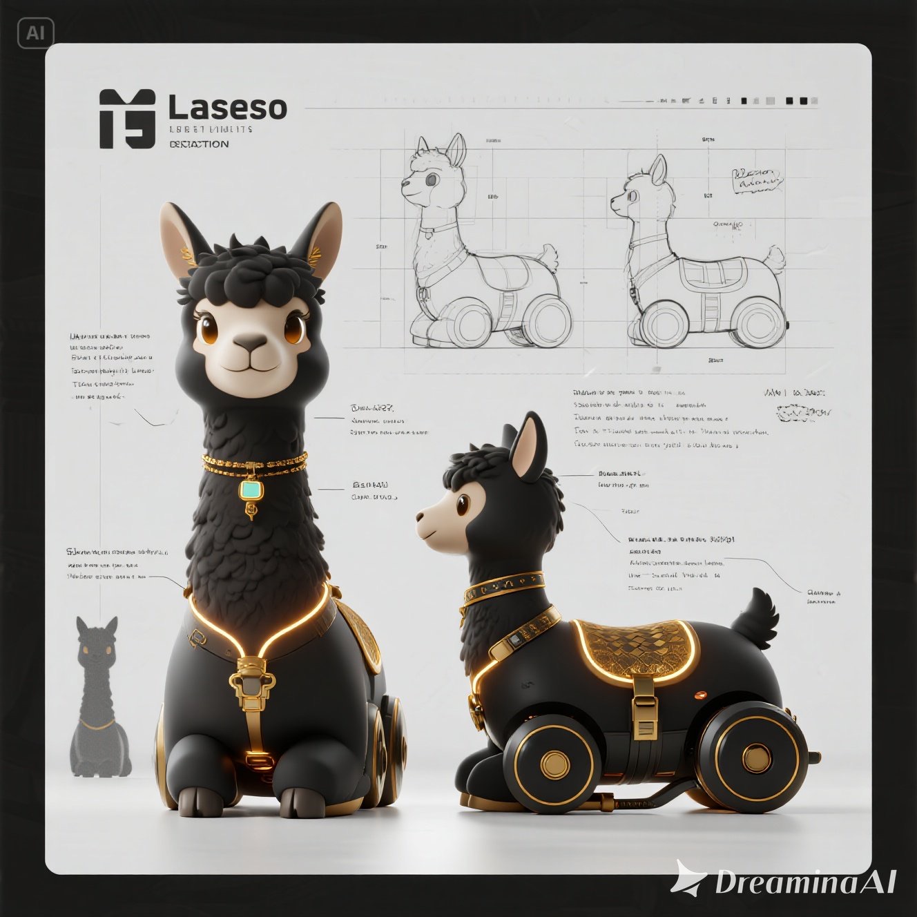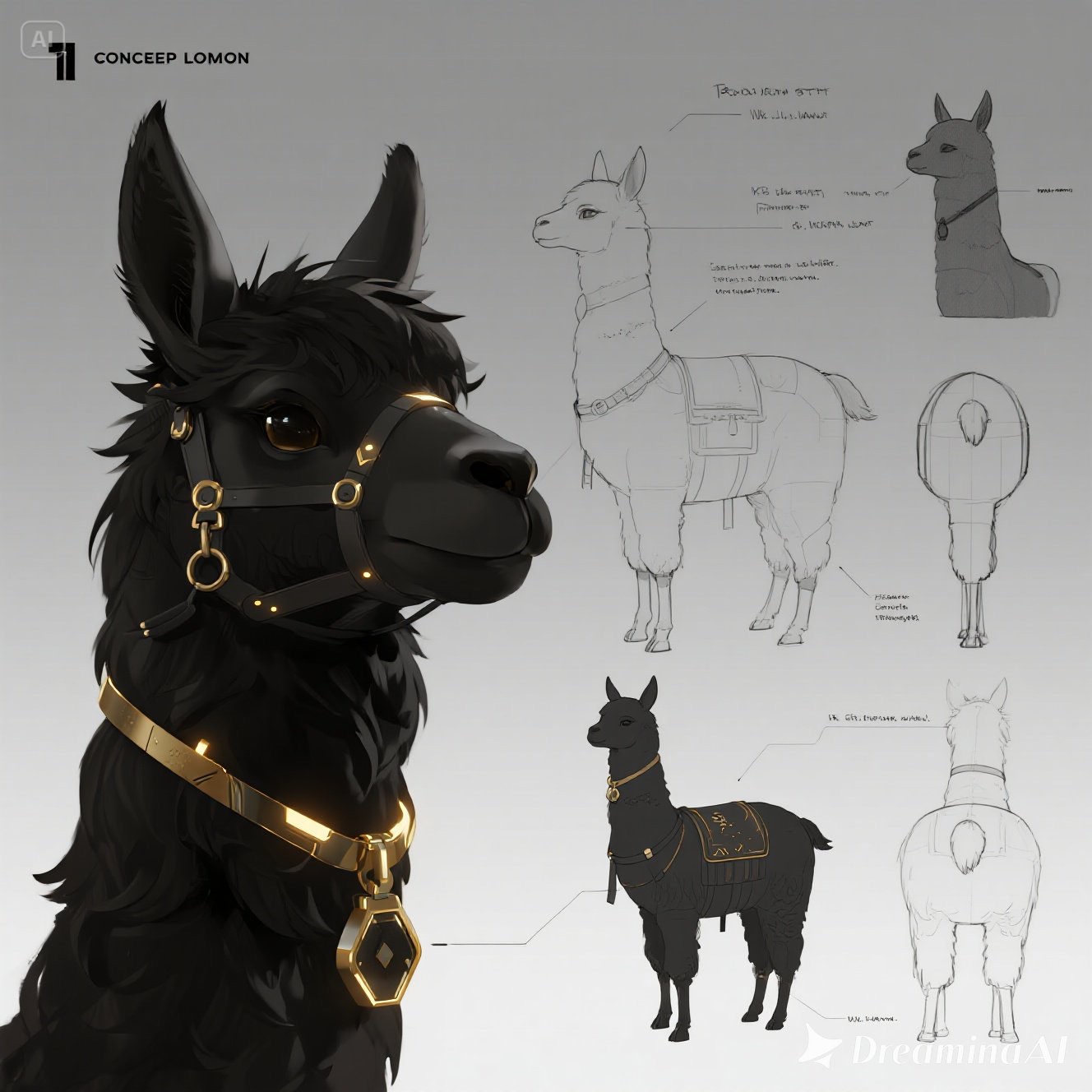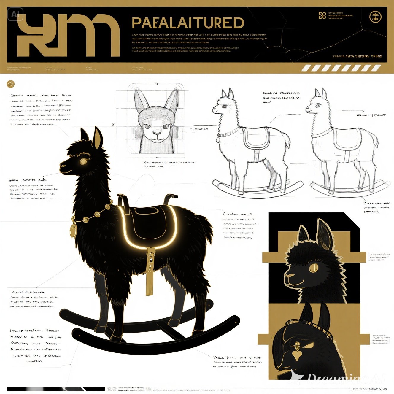 A concept sheet for a llama, detailed with front, back, and side views, including close-up sketches of facial features and accessories, annotated with design notes and labeled components, drawn in blueprint style with glowing trim in gold and base structure in black, presented on a clean white background