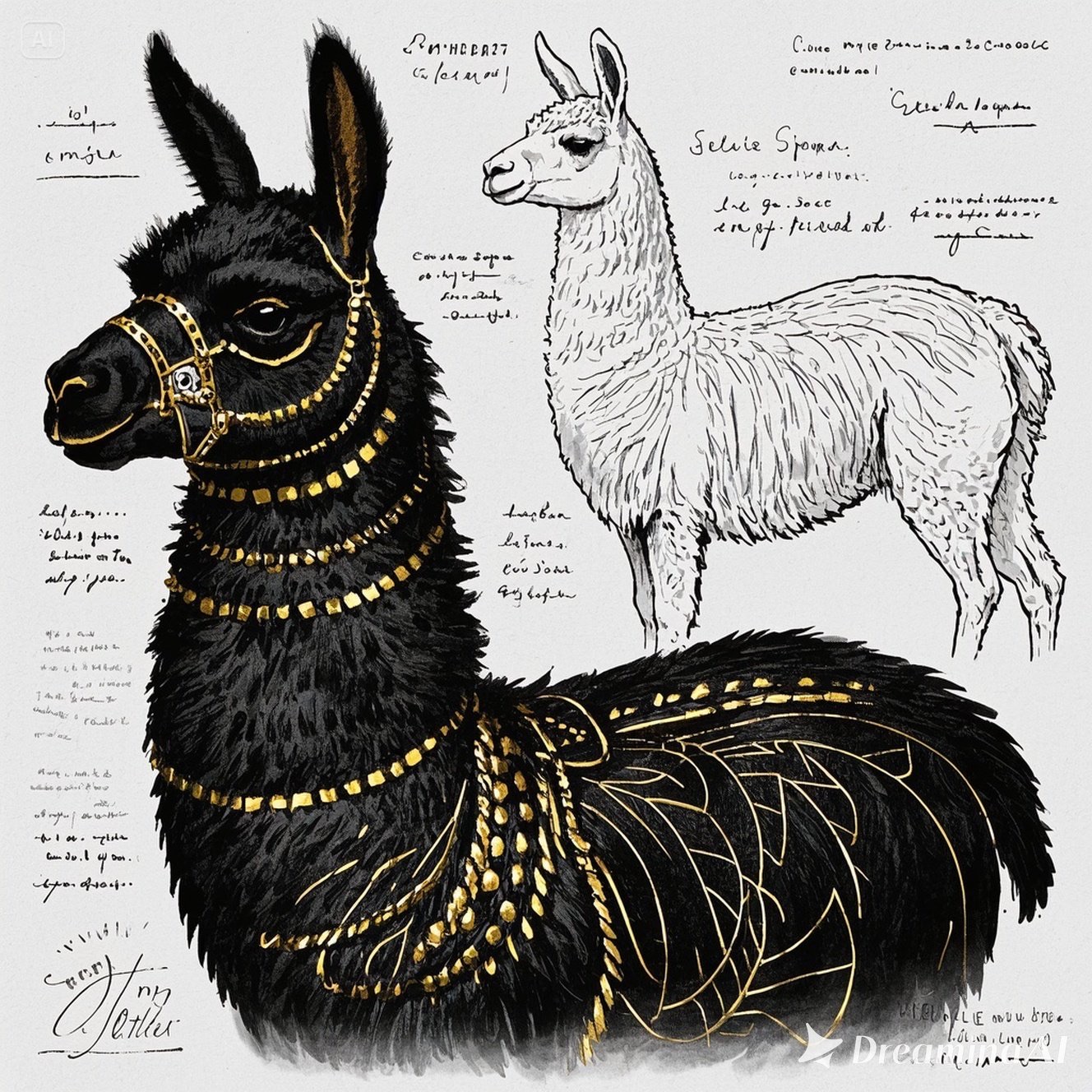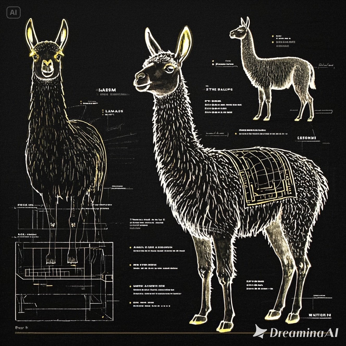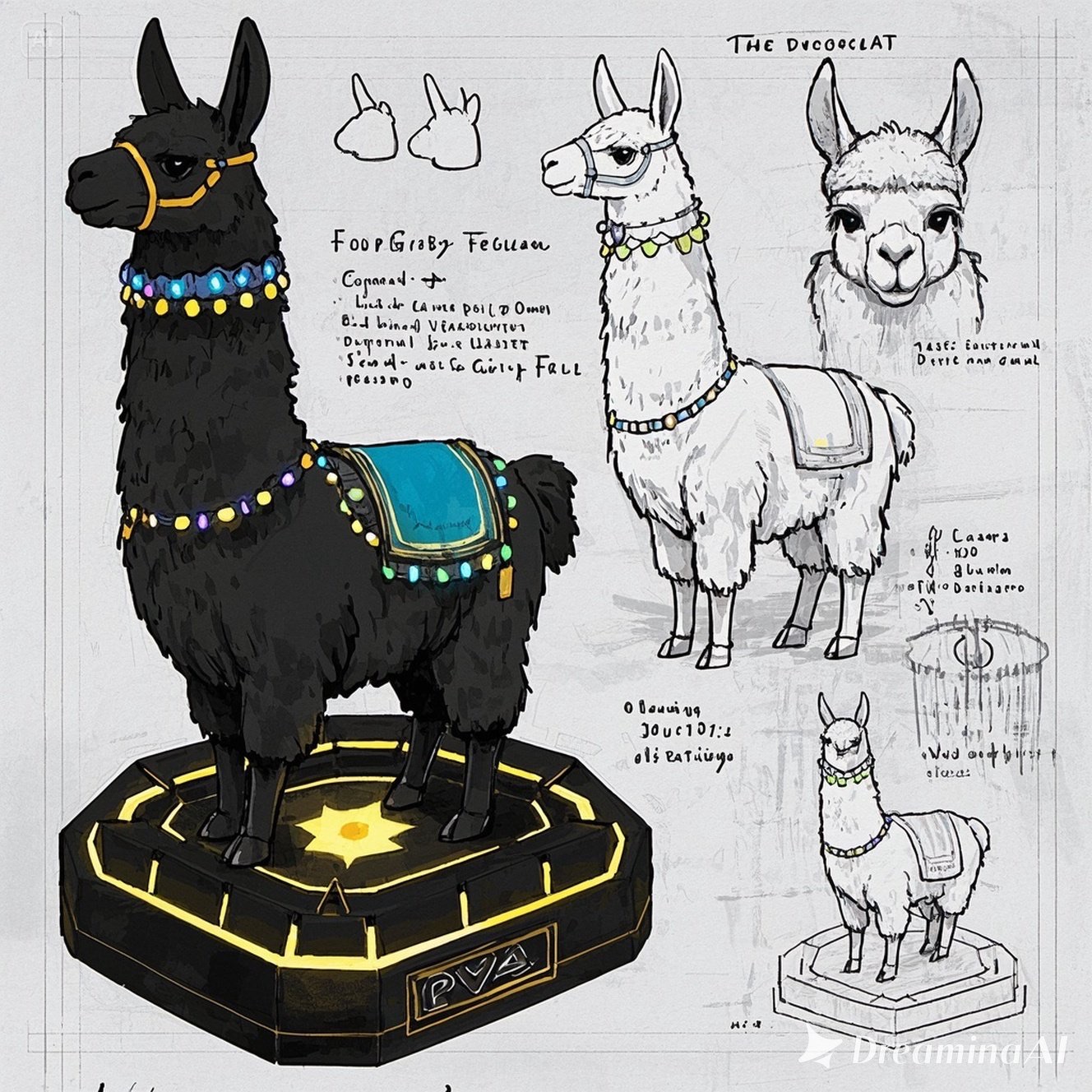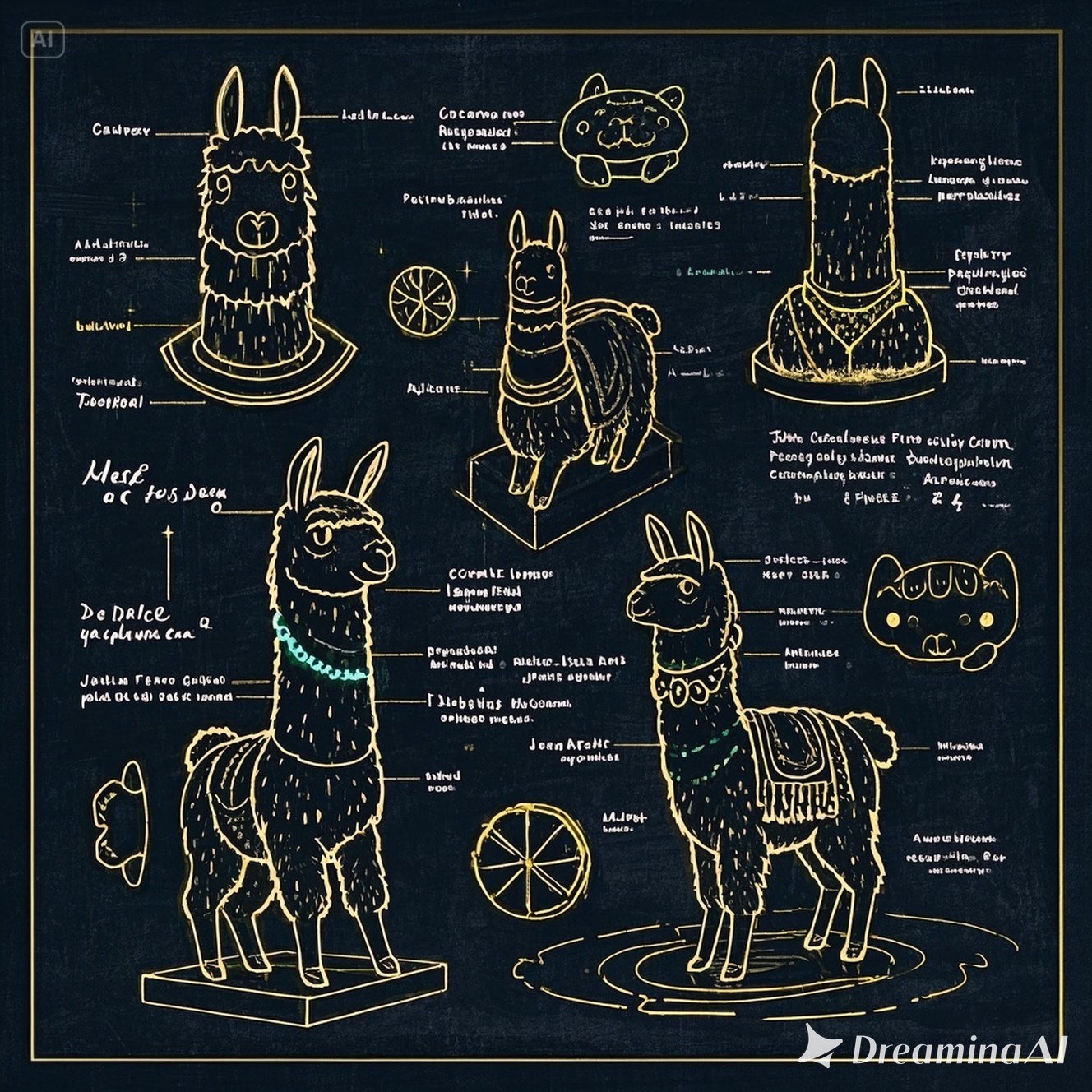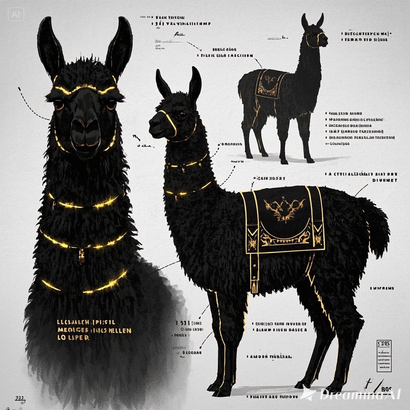 A concept sheet for a llama, detailed with front, back, and side views, including close-up sketches of facial features and accessories, annotated with design notes and labeled components, drawn in blueprint style with glowing trim in gold and base structure in black, presented on a clean white background