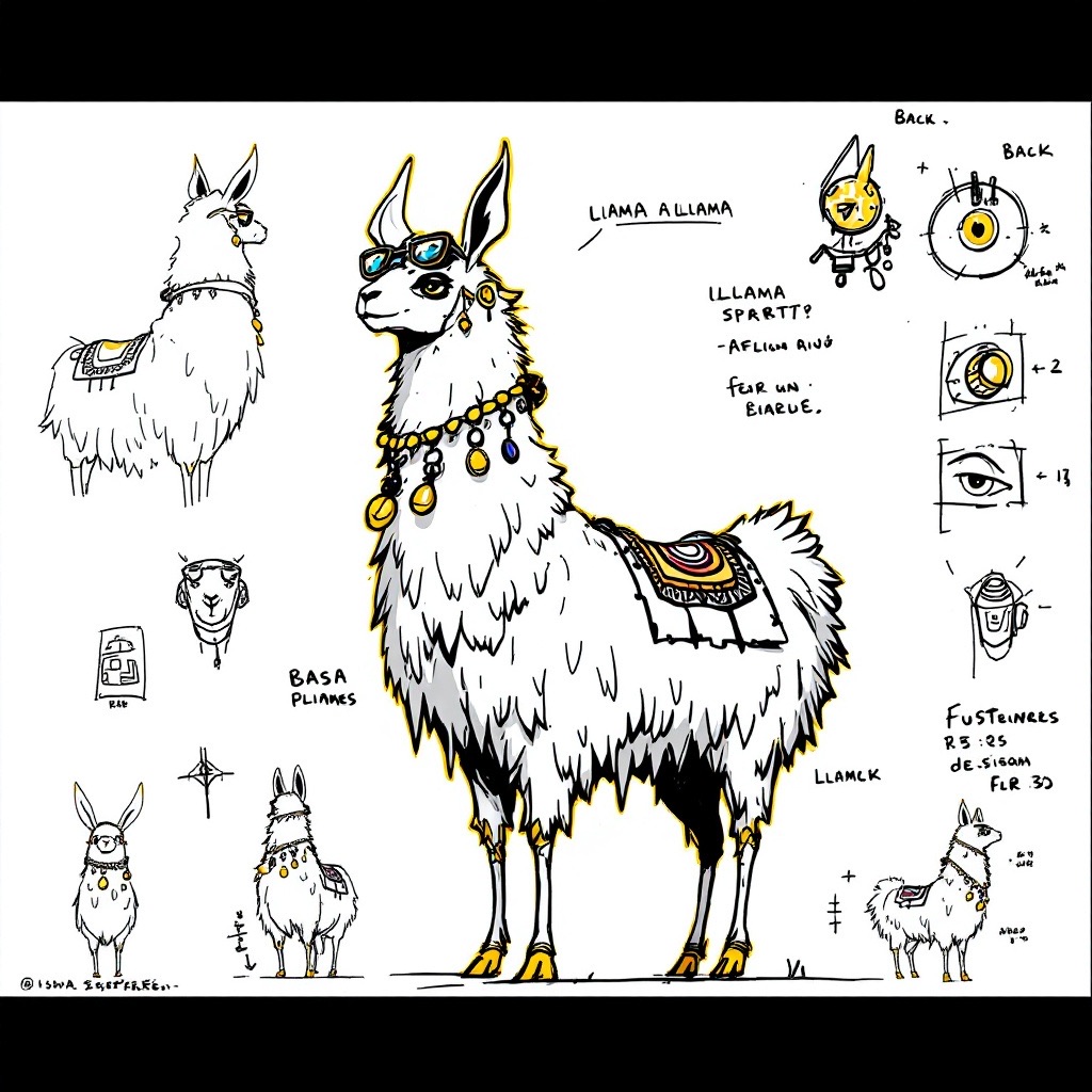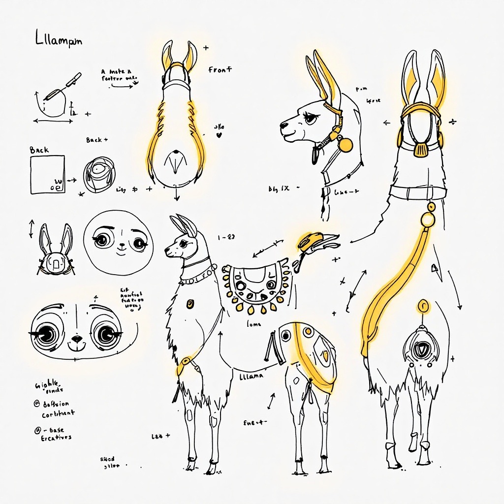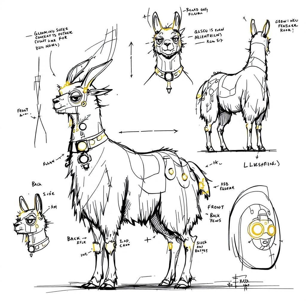 A concept sheet for a llama, detailed with front, back, and side views, including close-up sketches of facial features and accessories, annotated with design notes and labeled components, drawn in blueprint style with glowing trim in gold and base structure in black, presented on a clean white background