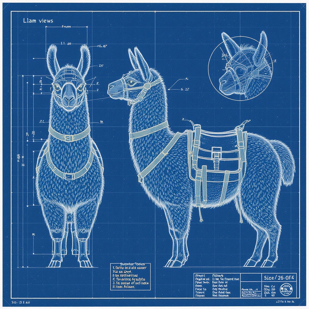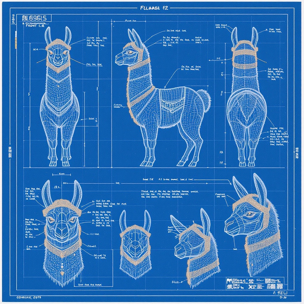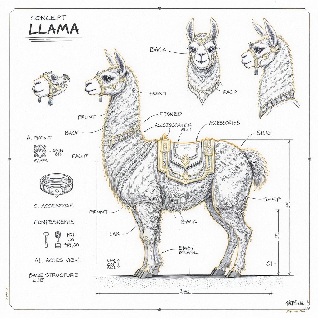 A concept sheet for a llama, detailed with front, back, and side views, including close-up sketches of facial features and accessories, annotated with design notes and labeled components, drawn in blueprint style with glowing trim in gold and base structure in black, presented on a clean white background