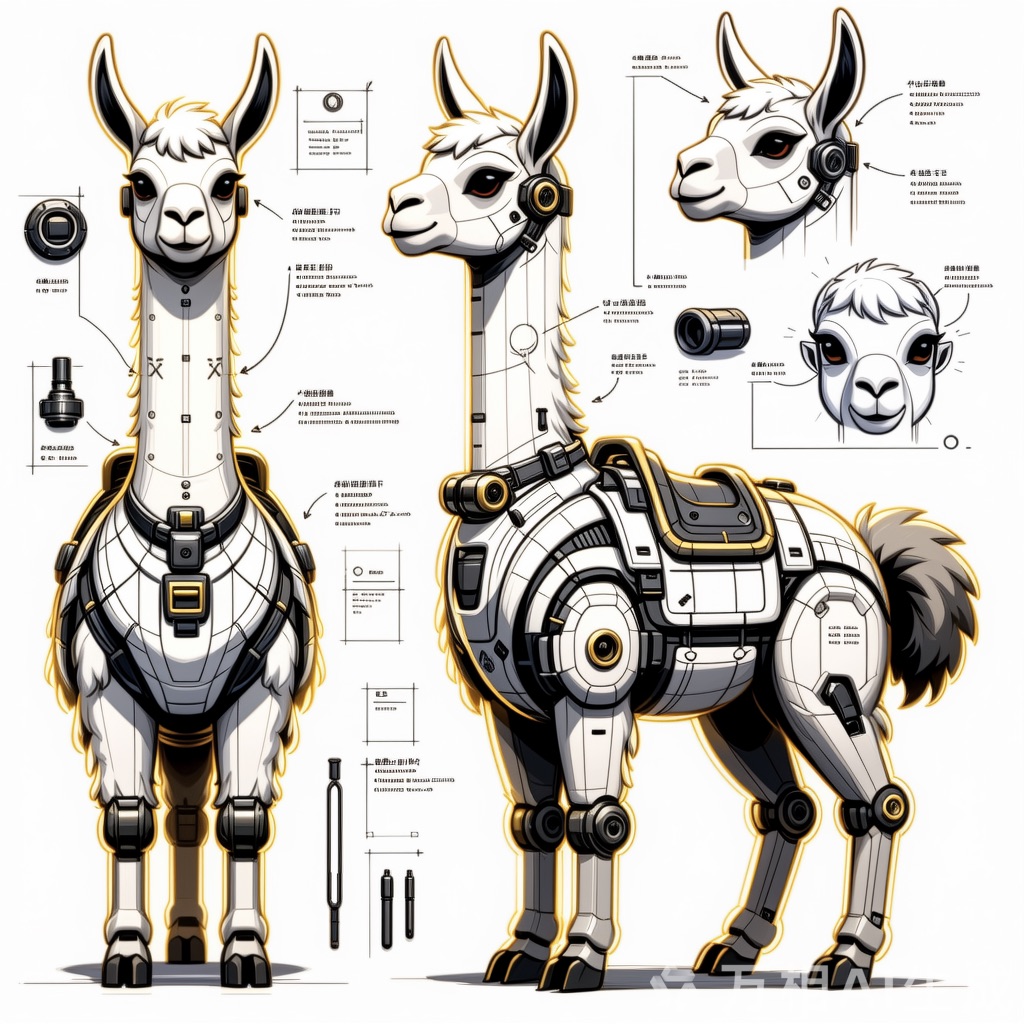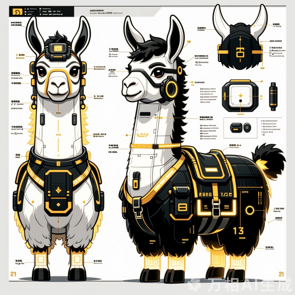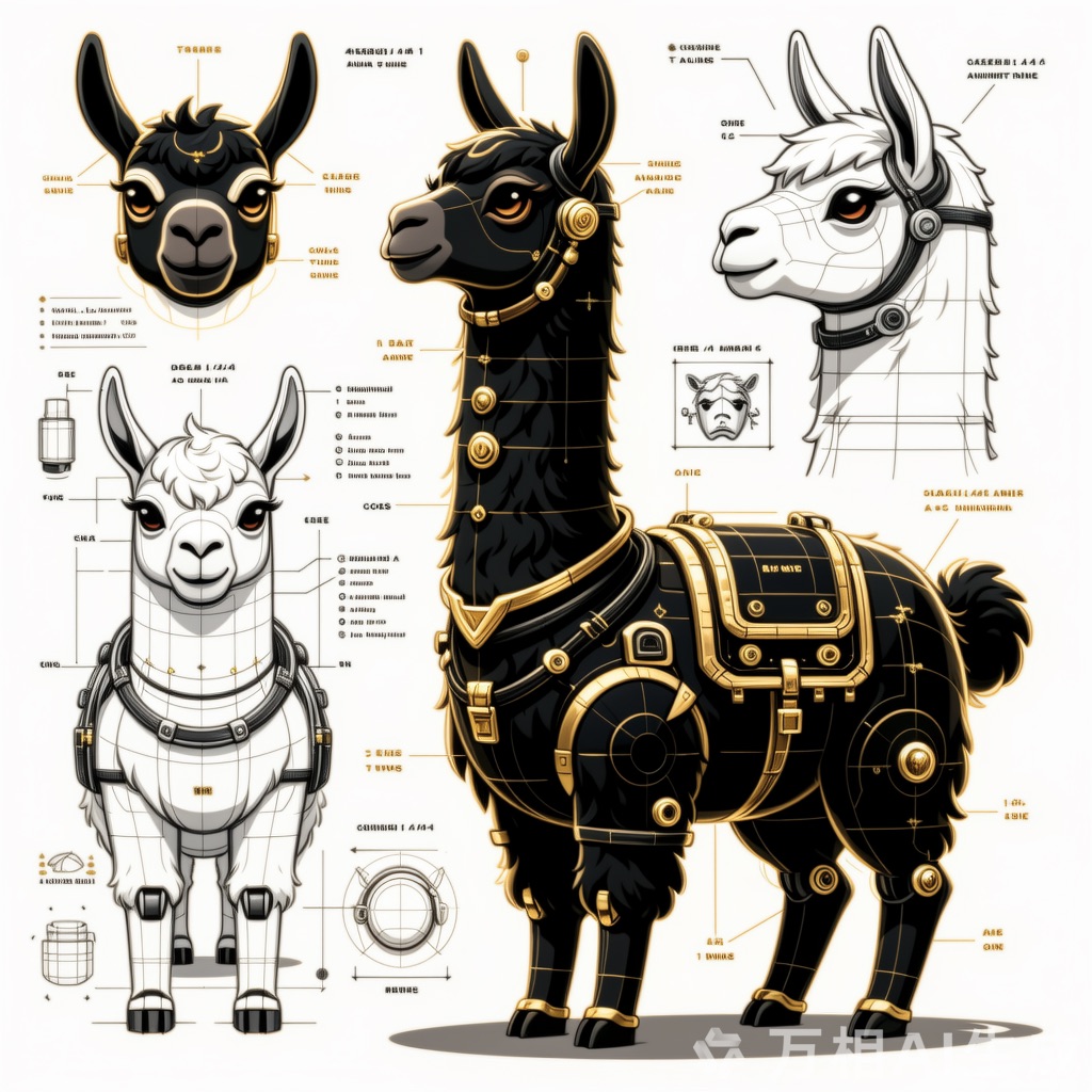 A concept sheet for a llama, detailed with front, back, and side views, including close-up sketches of facial features and accessories, annotated with design notes and labeled components, drawn in blueprint style with glowing trim in gold and base structure in black, presented on a clean white background
