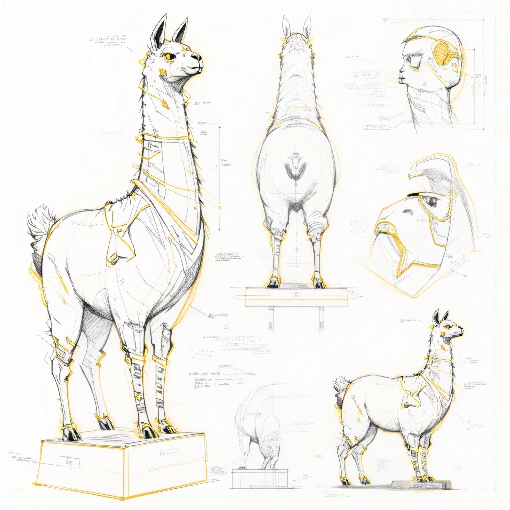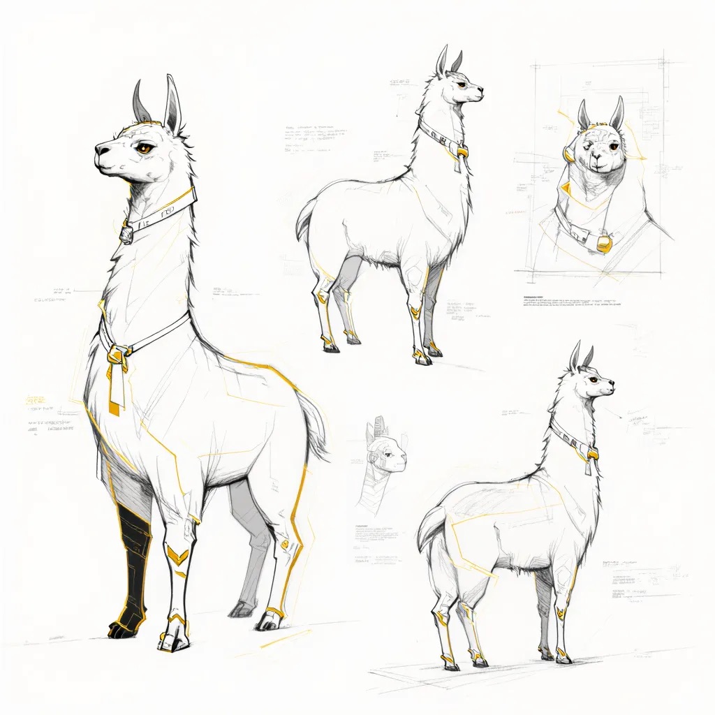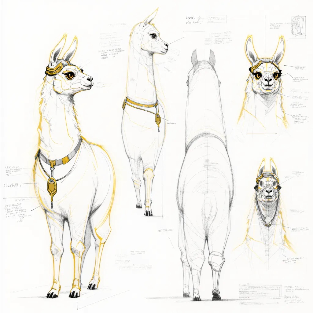 A concept sheet for a llama, detailed with front, back, and side views, including close-up sketches of facial features and accessories, annotated with design notes and labeled components, drawn in blueprint style with glowing trim in gold and base structure in black, presented on a clean white background