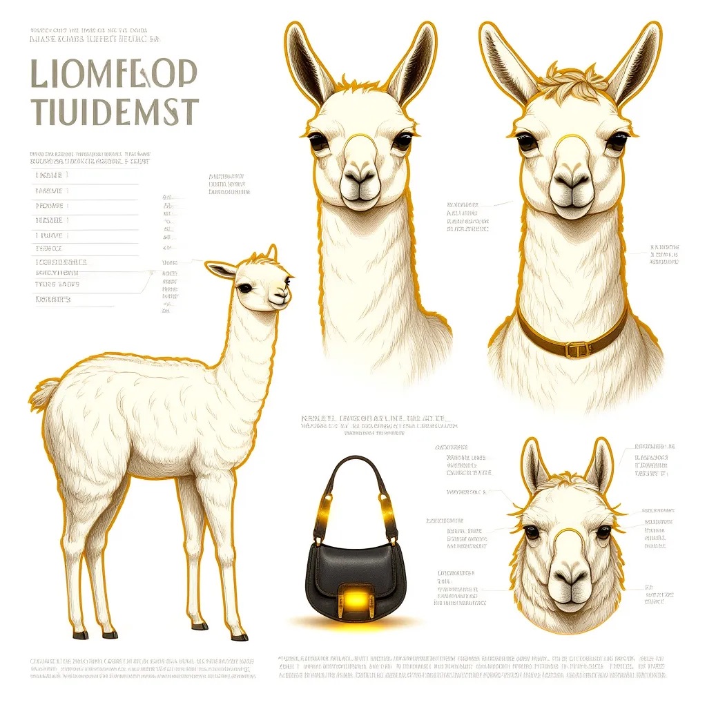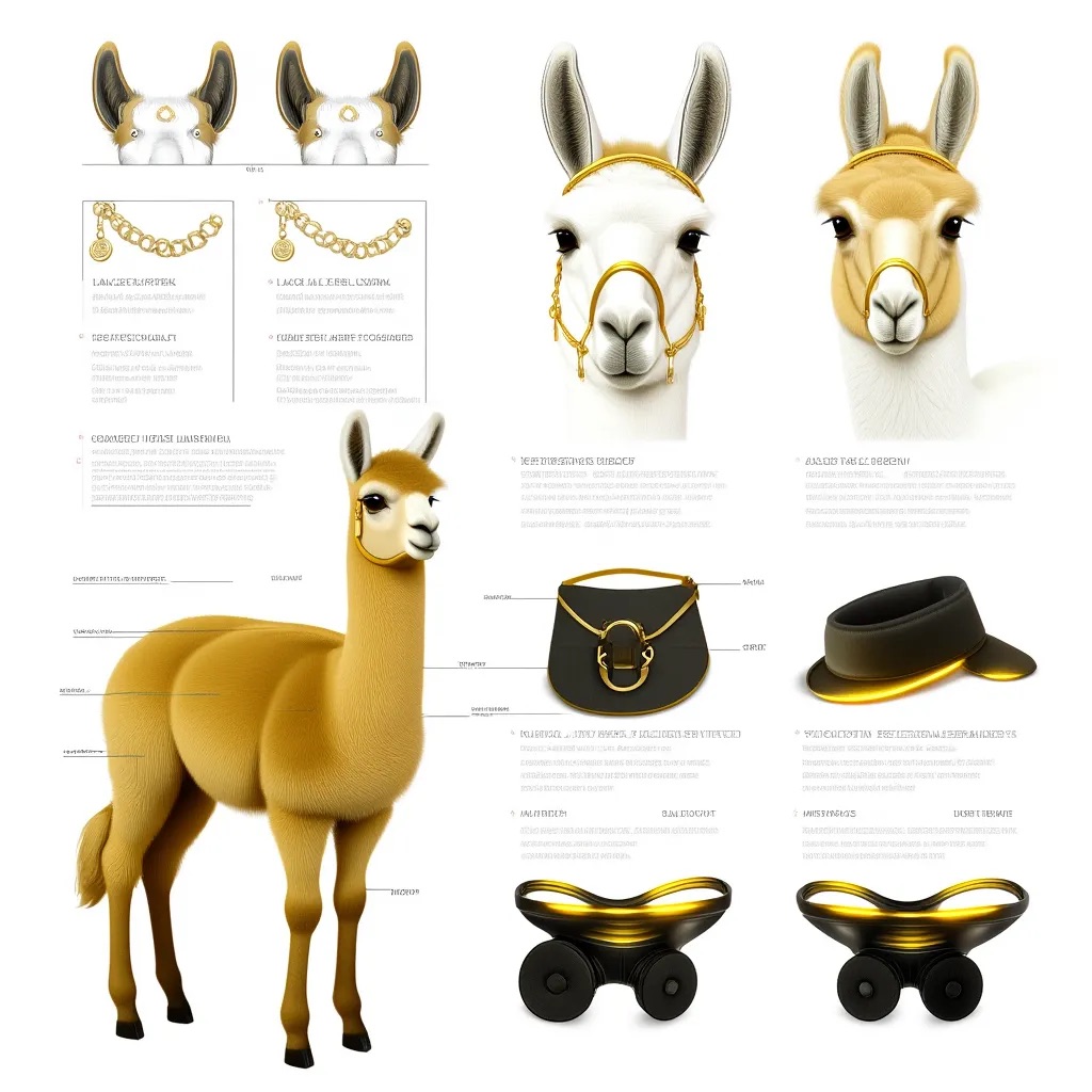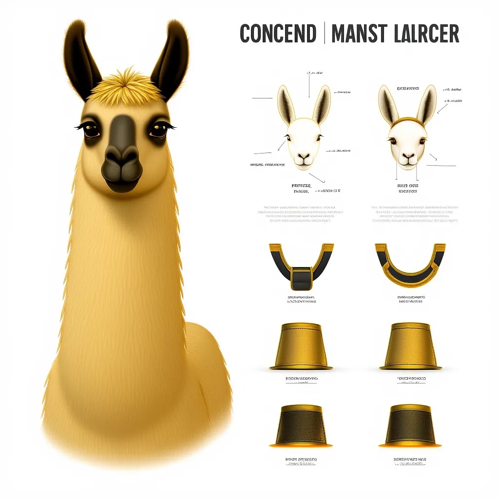A concept sheet for a llama, detailed with front, back, and side views, including close-up sketches of facial features and accessories, annotated with design notes and labeled components, drawn in blueprint style with glowing trim in gold and base structure in black, presented on a clean white background