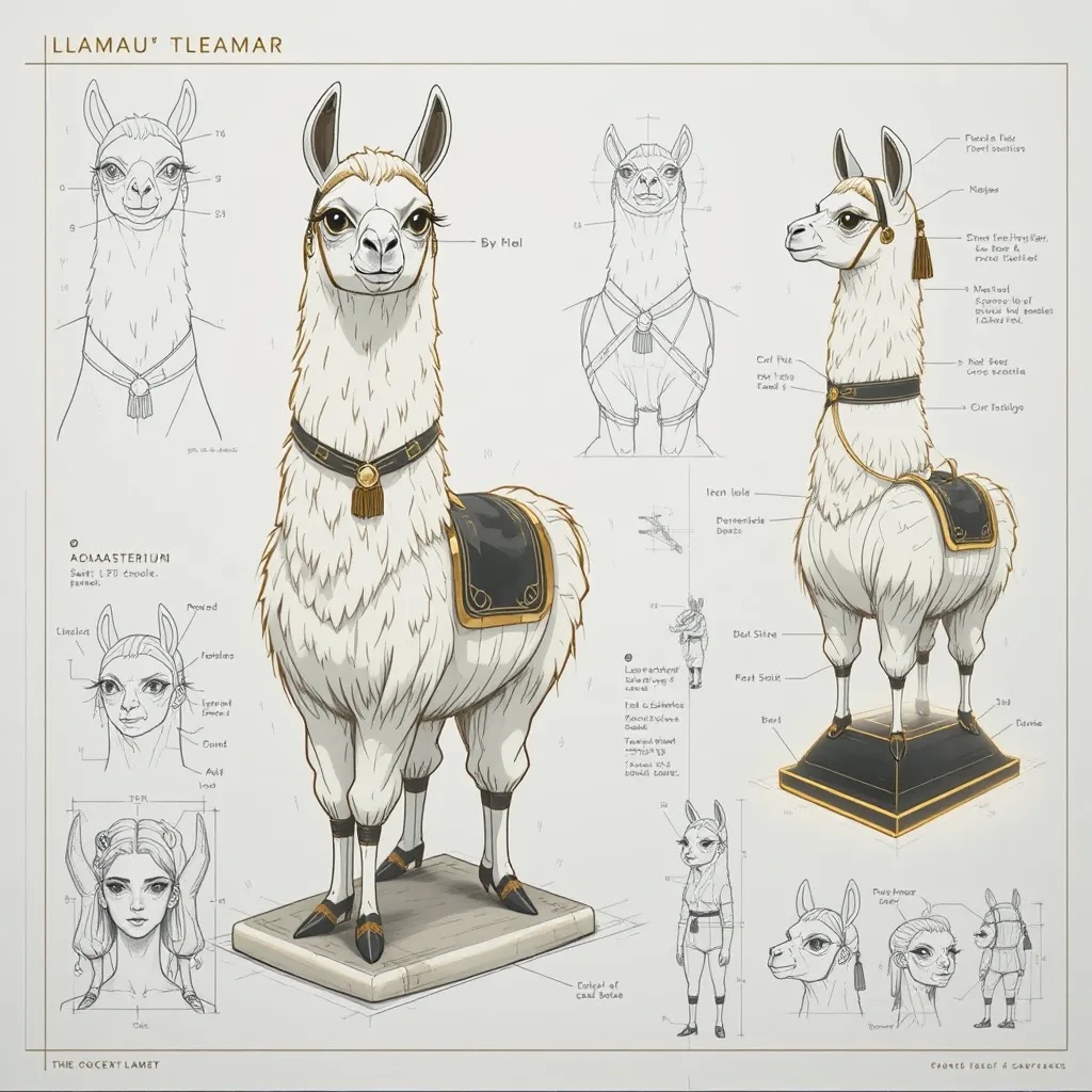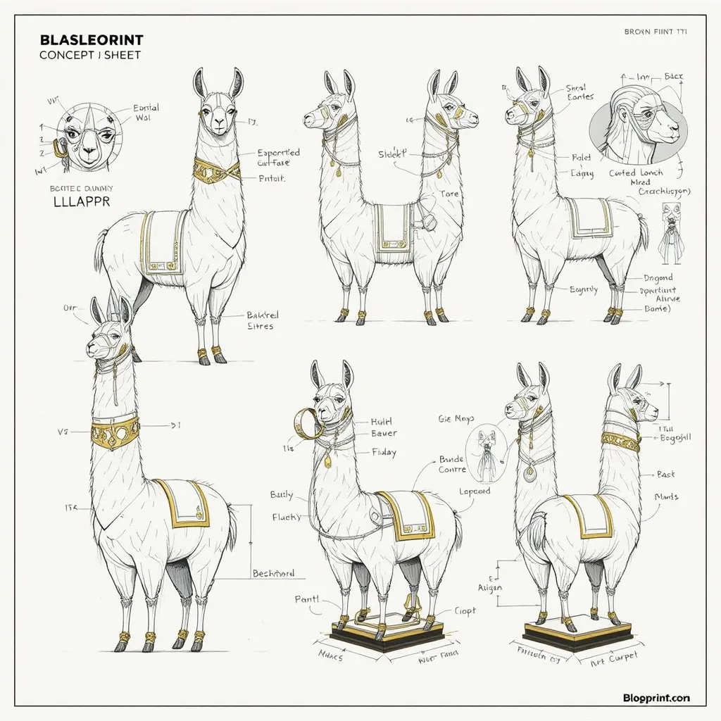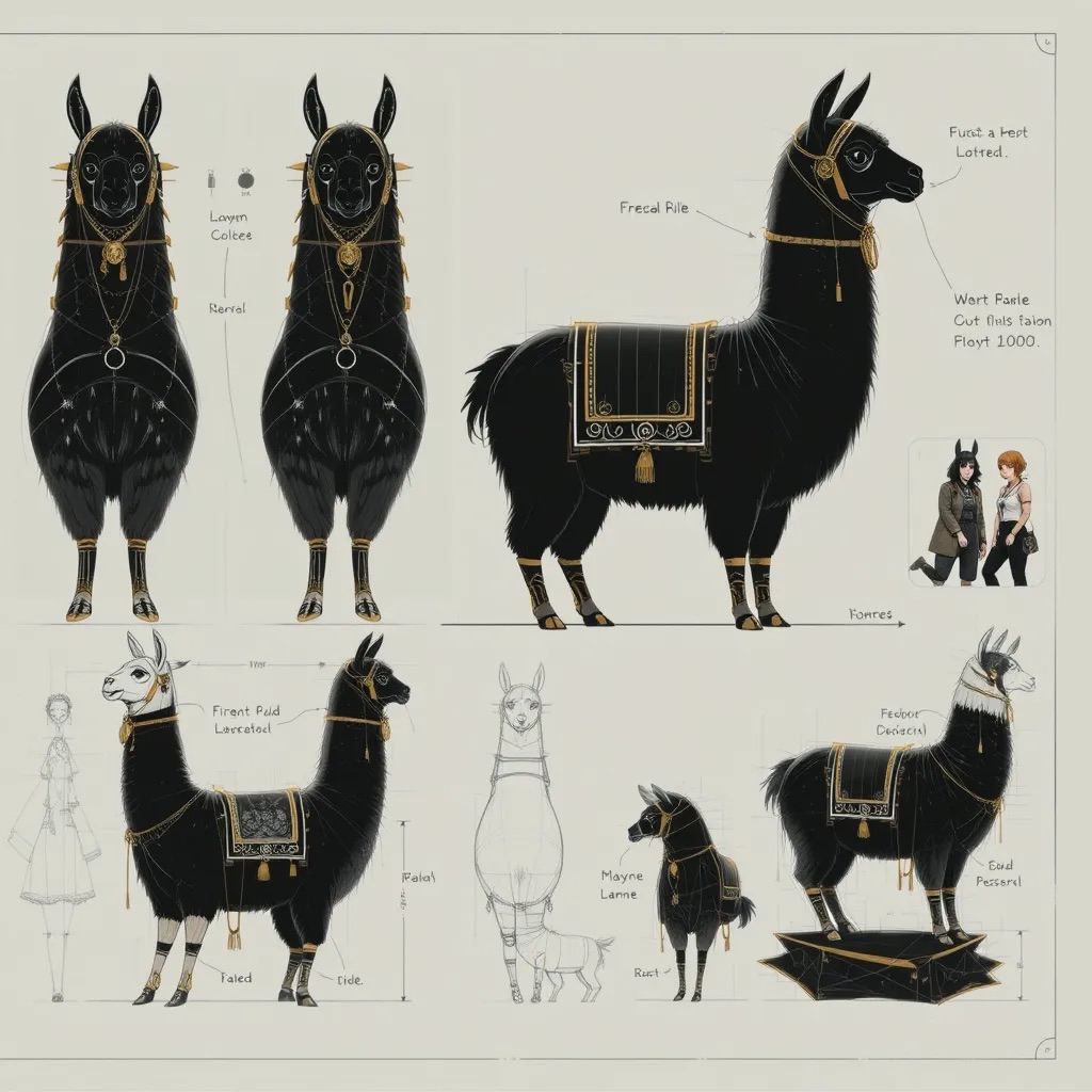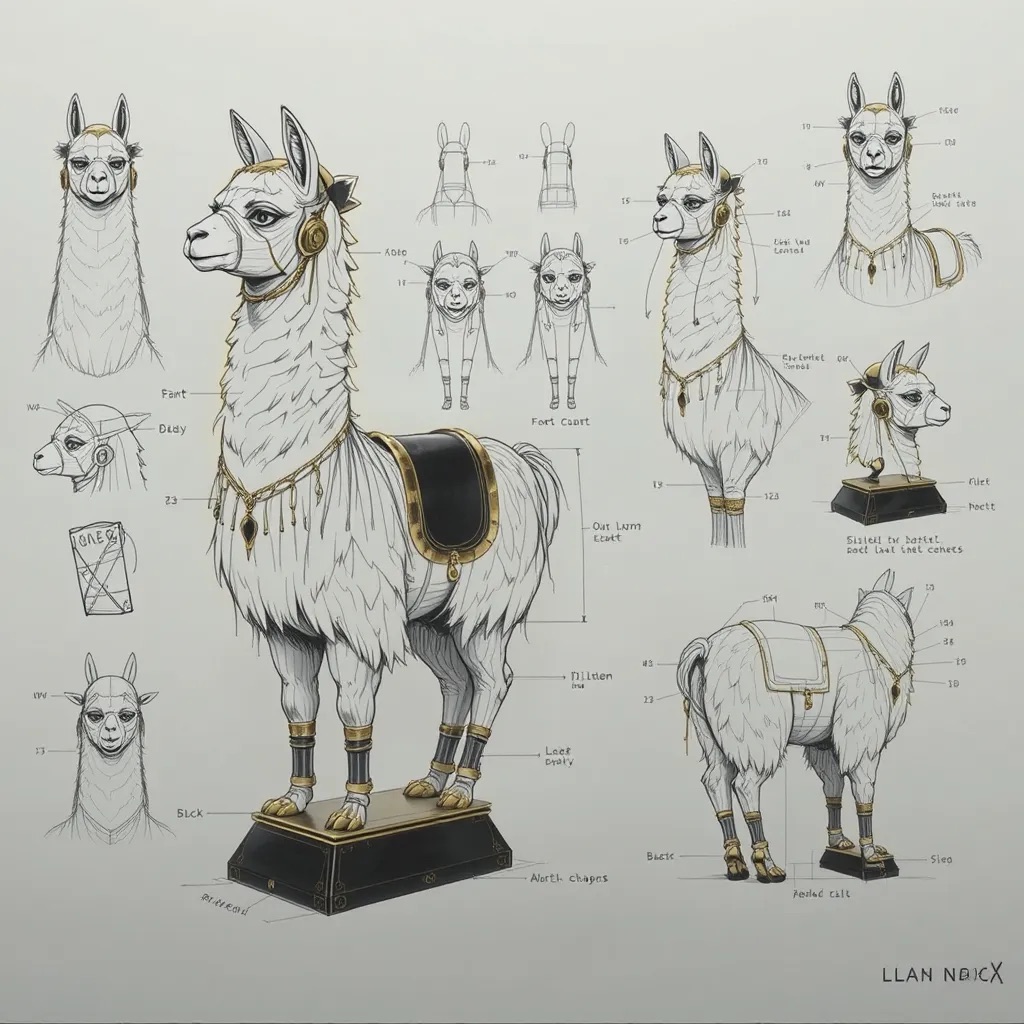 A concept sheet for a llama, detailed with front, back, and side views, including close-up sketches of facial features and accessories, annotated with design notes and labeled components, drawn in blueprint style with glowing trim in gold and base structure in black, presented on a clean white background